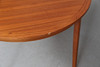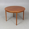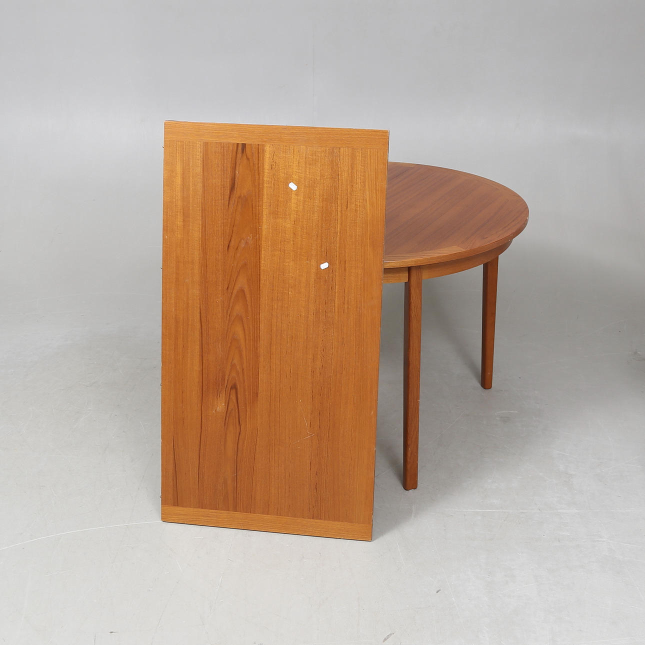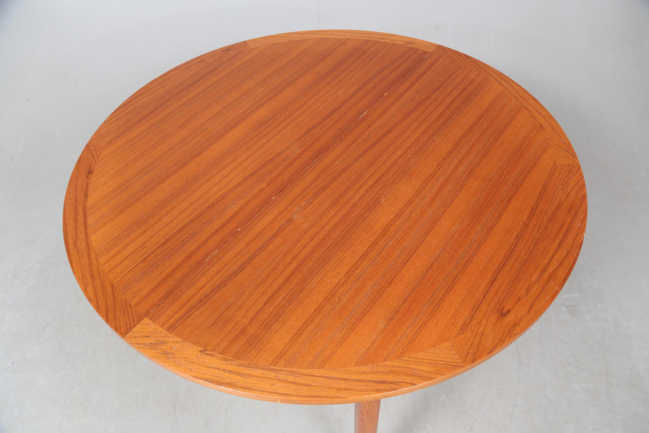 Teakfaner. Diameter ca 110 cm. 1 iläggsskiva, bredd ca 59cm. Höjd ca 73 cm.