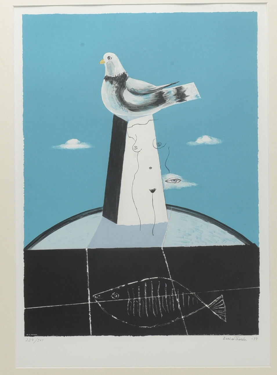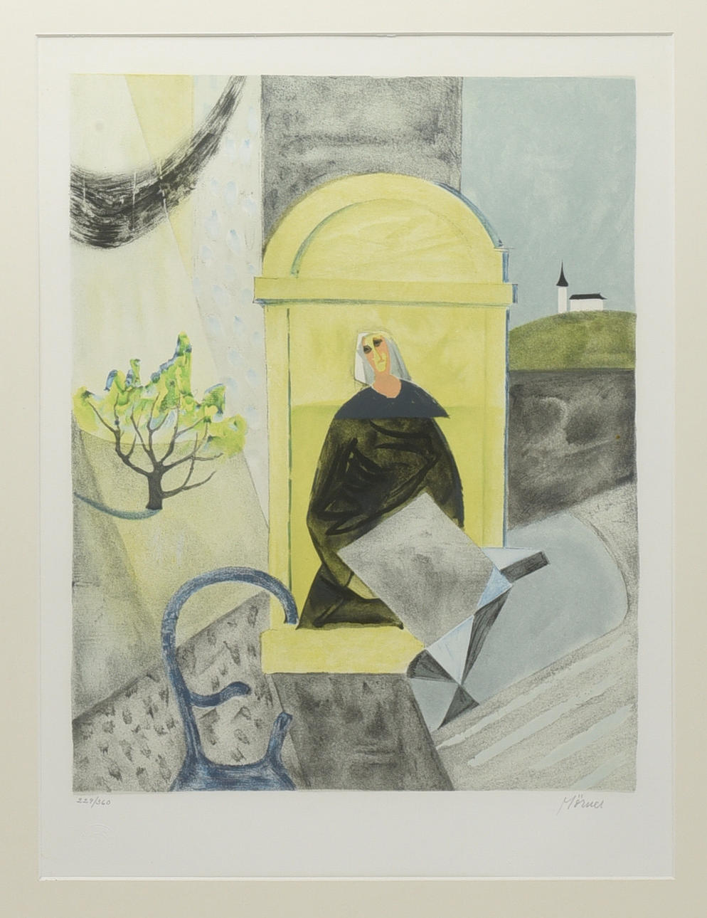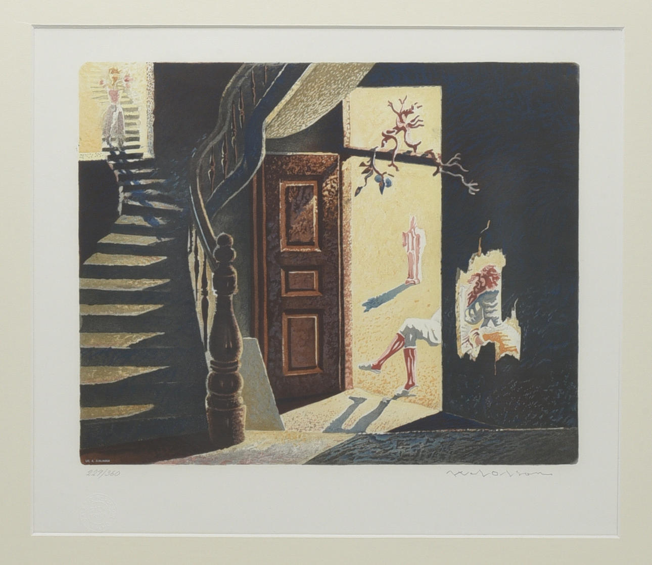 Inramad mapp om 6 litografiska tryck utgivna i samband med 50-årsjubileet för Halmstadgruppen. Samtliga medlemmar representerade; Sven Jonson, Waldemar Lorentzon, Stellan Mörner, Axel Olson, Erik Olson samt Esaias Thorén, signerade, numrerade 229/360, utgiven av Galerie Börjeson, Malmö.