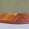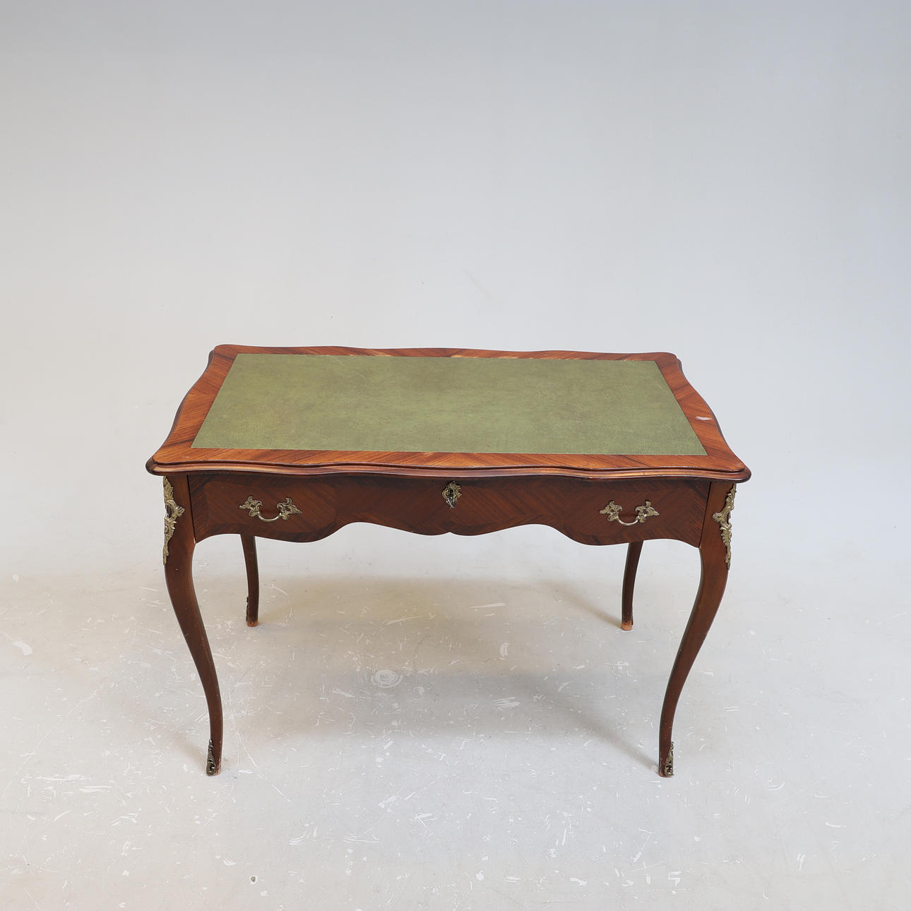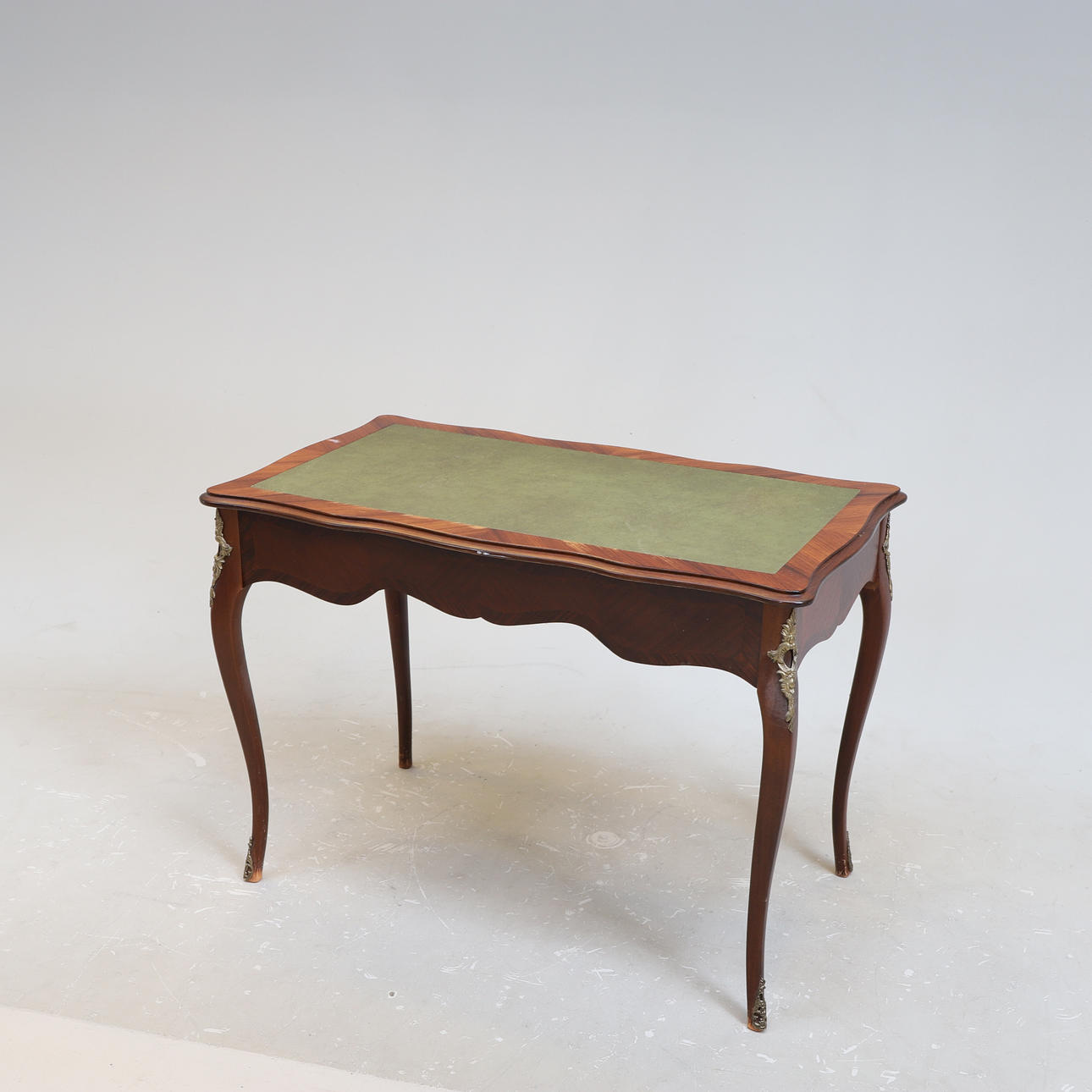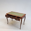 Läderkläd skrivyta. En låda. Fanerat och beslag i mässing. Längd ca 103 cm. Bredd ca 60 cm. Höjd ca 73 cm.