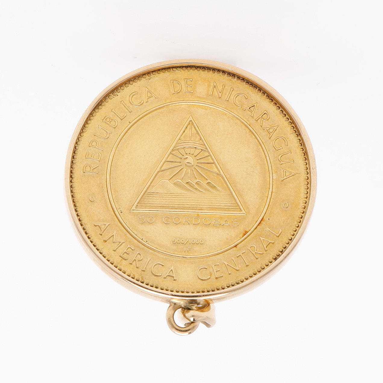 50 cordobas, Nicaragua, 1967, 900/1000, 21,6 k guld, vikt 36,5 gram, infattad i hänge av 18k guld, diameter 36 mm, total vikt 39,4 gram.