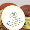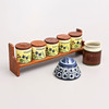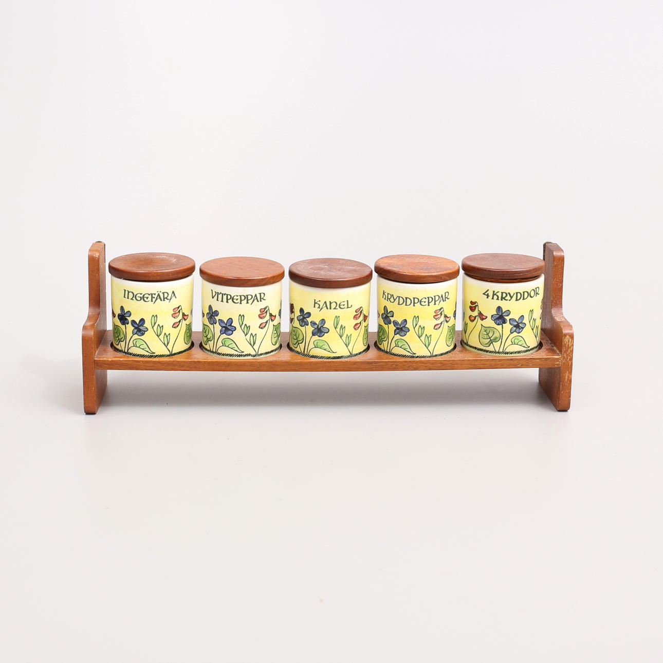 5 kryddburkar med trälock, porslin, JIE - serie Vildblomster - dekor Staffan Johnson, höjd 7,5 cm, diameter 7 cm på trähylla.