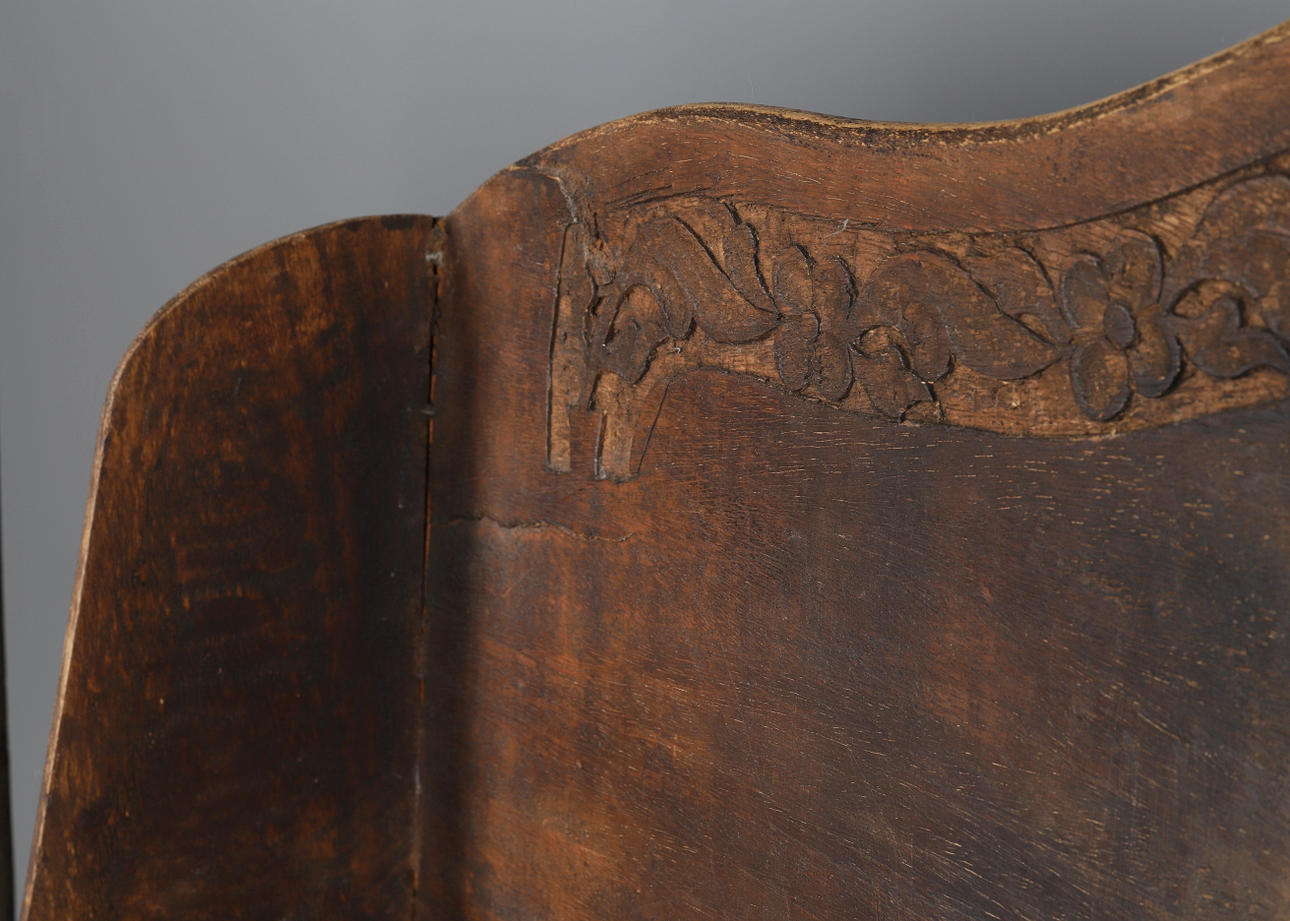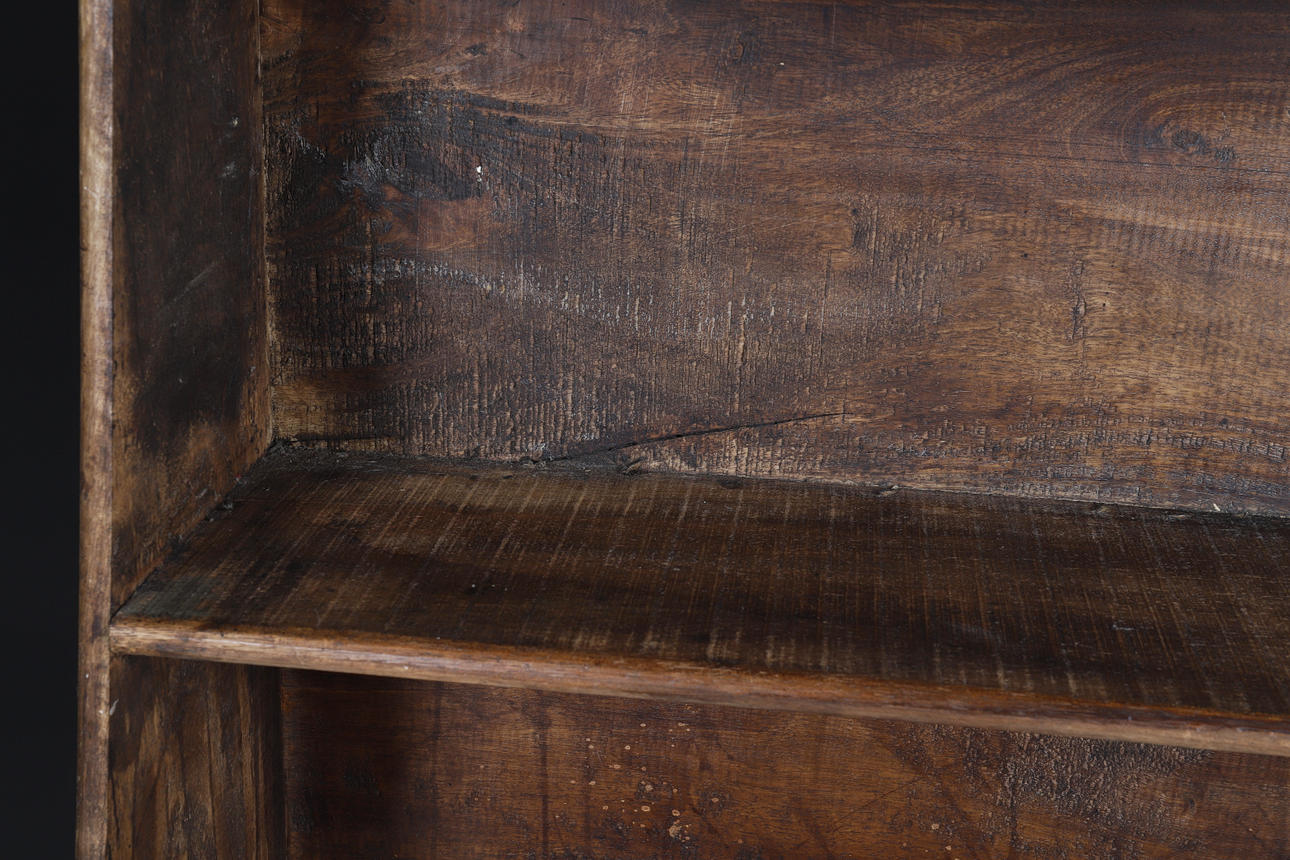 med formade ryggar och blomma snidade dekoration, över fyra graderade hyllor, 132cm hög, 88cm bred, 30cm djup.