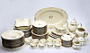 Beståendes av: 12 mattallrikar, 10 förrättstallrikar, 12 djupa tallrikar, 12 assietter, 6 st uppläggningsfat, 2 skålar, 1 såsskål, 1 kanna, 9 kaffekoppar samt 12 fat, 1 Kaffekanna, 1 sockerskål, 1 gräddkanna.