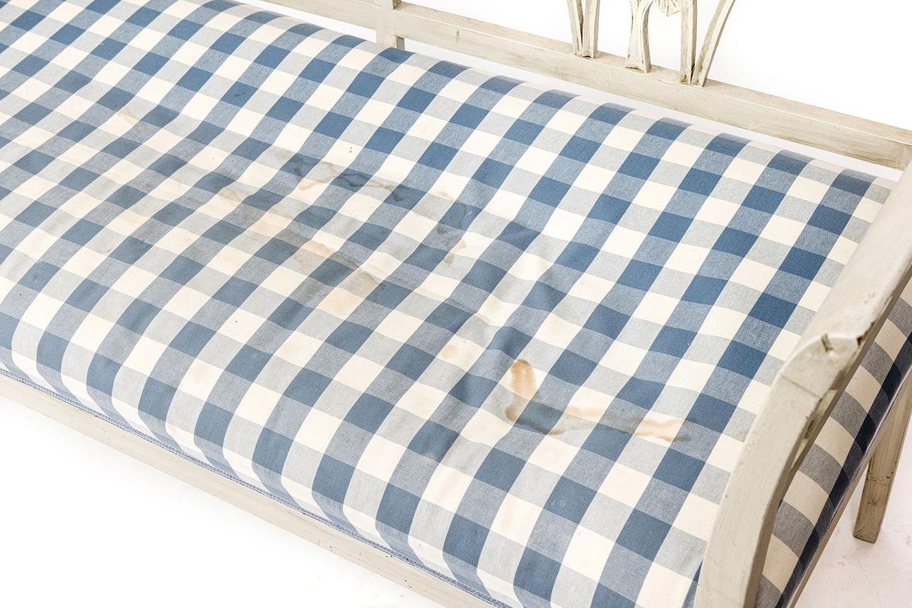 Senare målning samt senare stoppning och klädsel. Avkortad med förstärkningar. Dekordel medföljer som saknas på ena kortsidan, ställvis maskstungen.