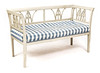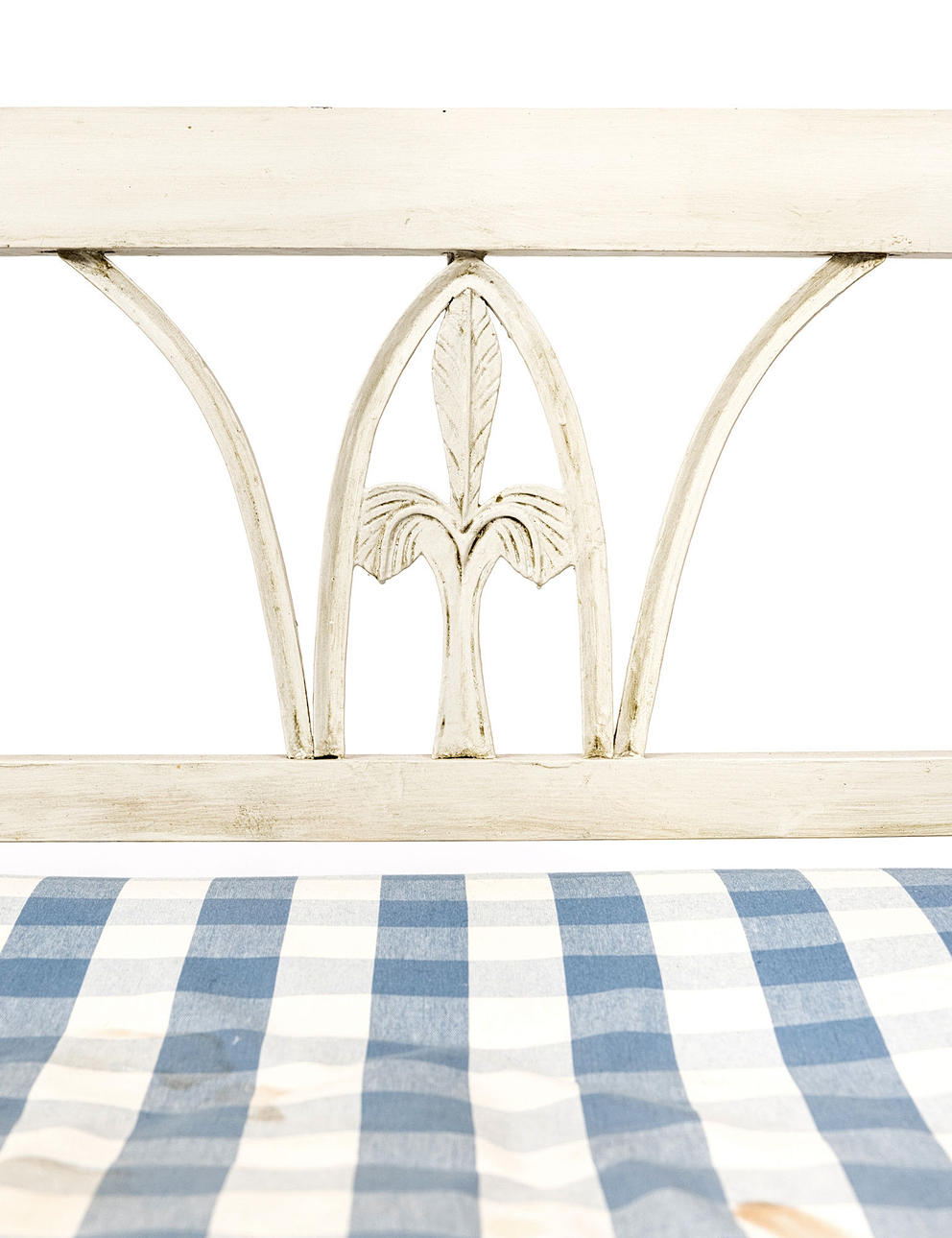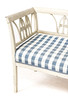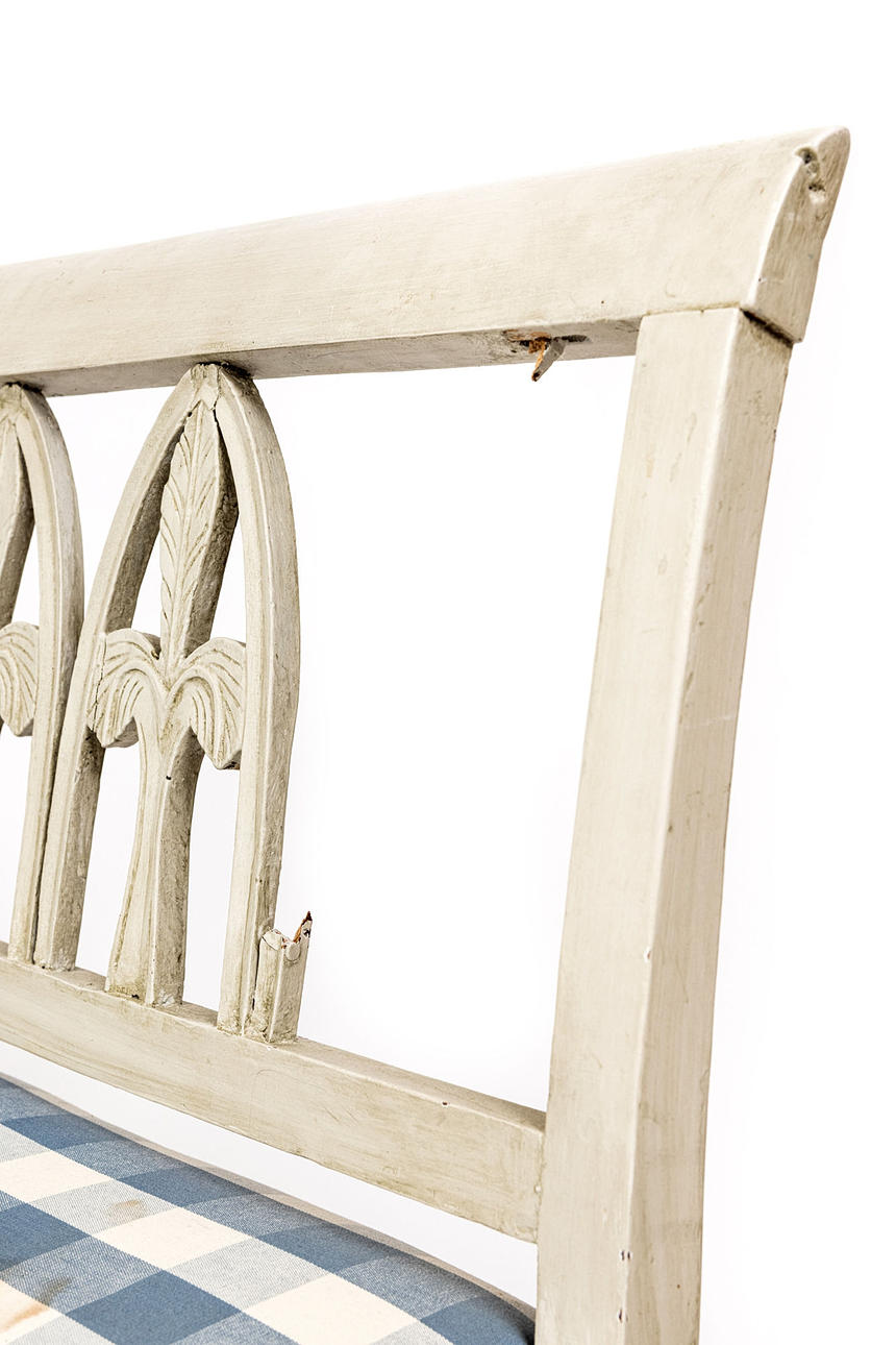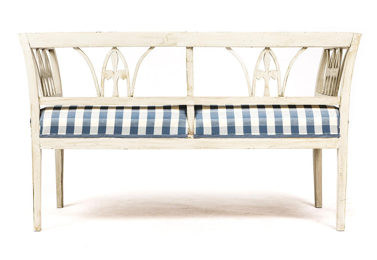 Gråmålad. Genombruten rygg med stoppad sits. Sitthöjd ca 50 cm. Längd 140 cm.
