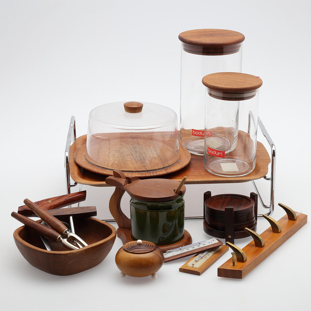 Burkar med lock, bricka på stativ, ostkupa, marmeladburk nötknäppare m.m.