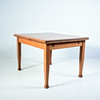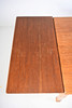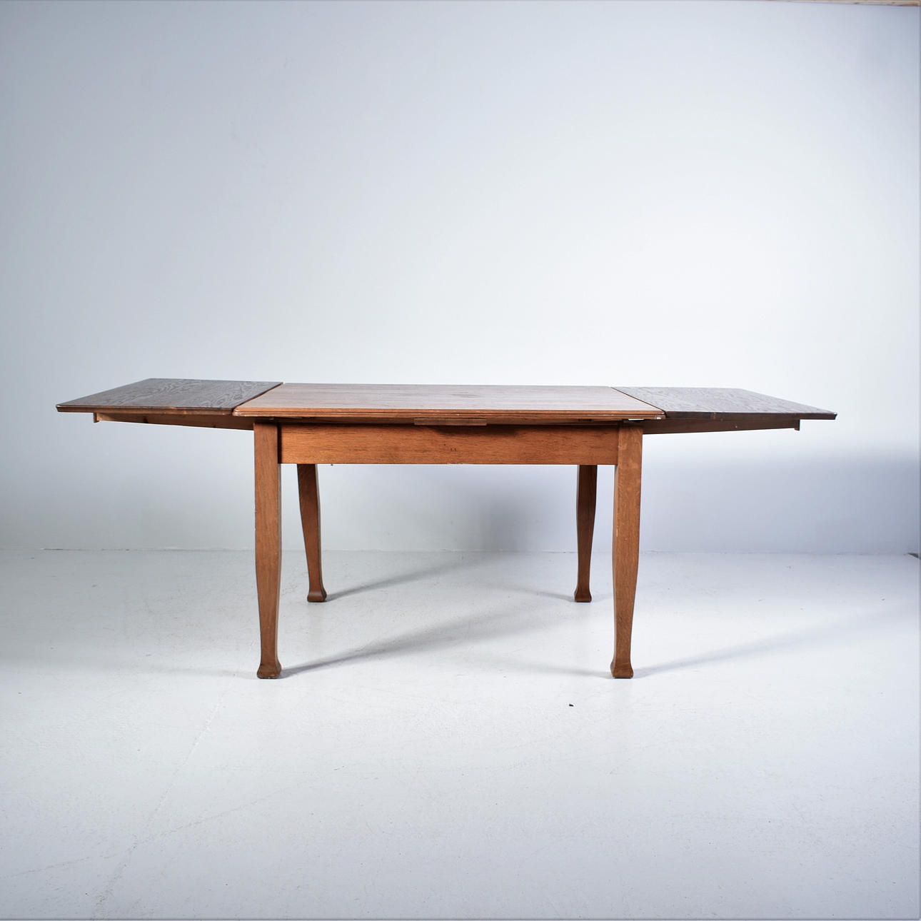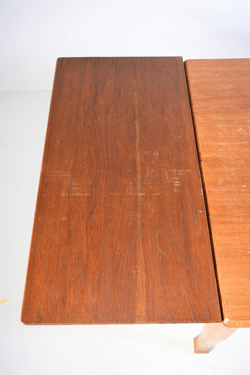 Matbord i ek med utdragsskivor, 8 st tillhörande stolar med klädda sitsar.
