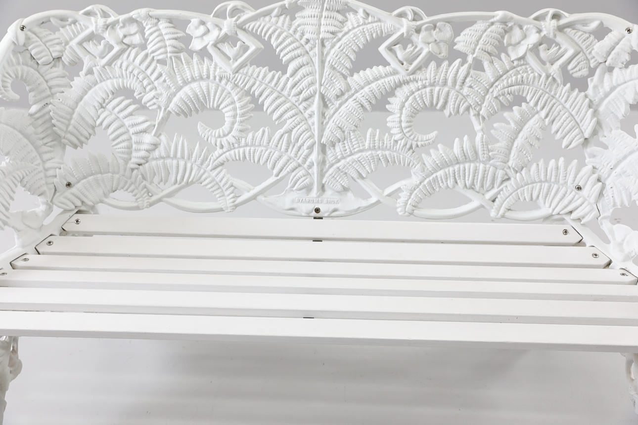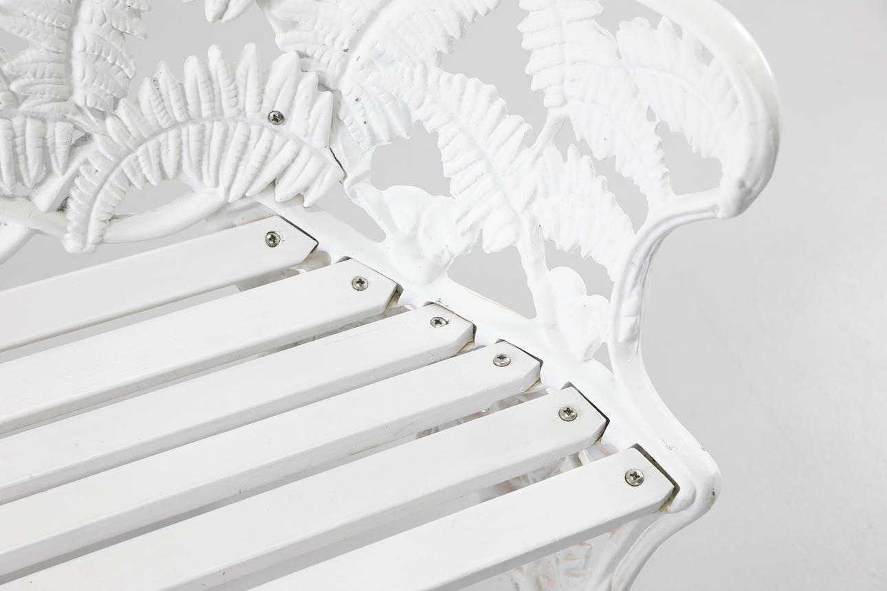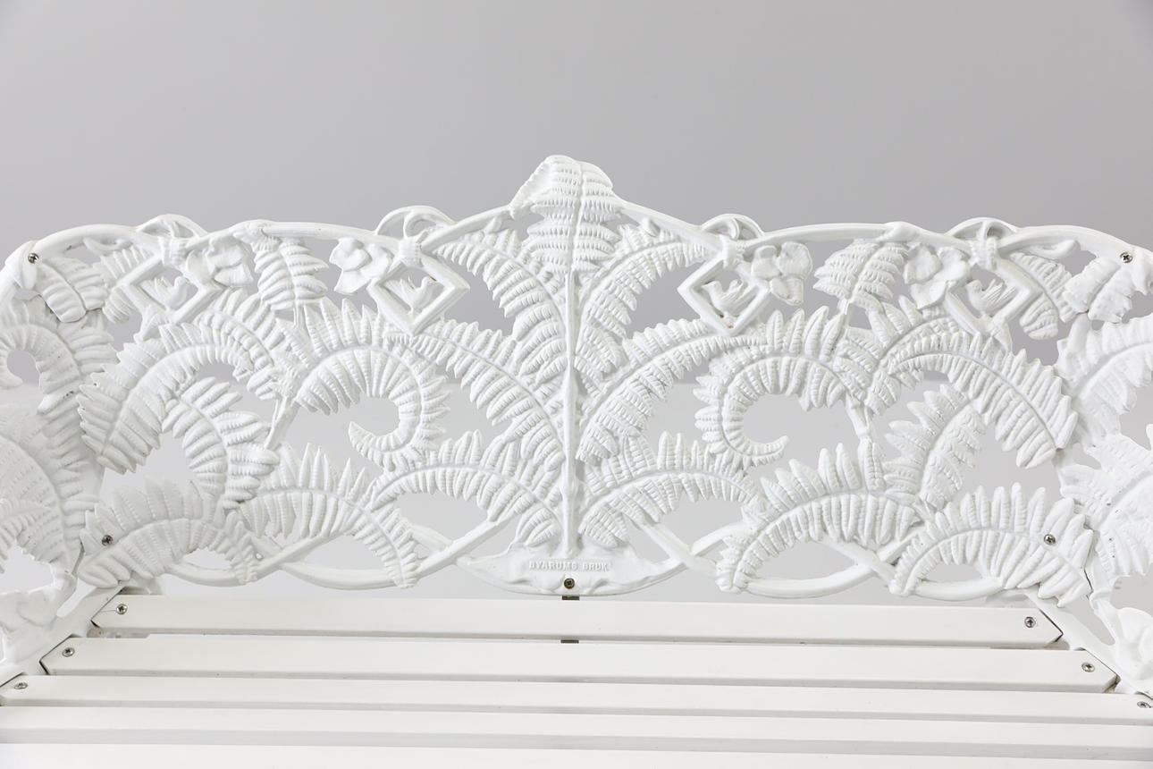 Stomme i gjutjärn. Vitlackerat trä. Längd ca 142 cm Höjd ca 87 cm Djup ca 54 cm.
