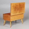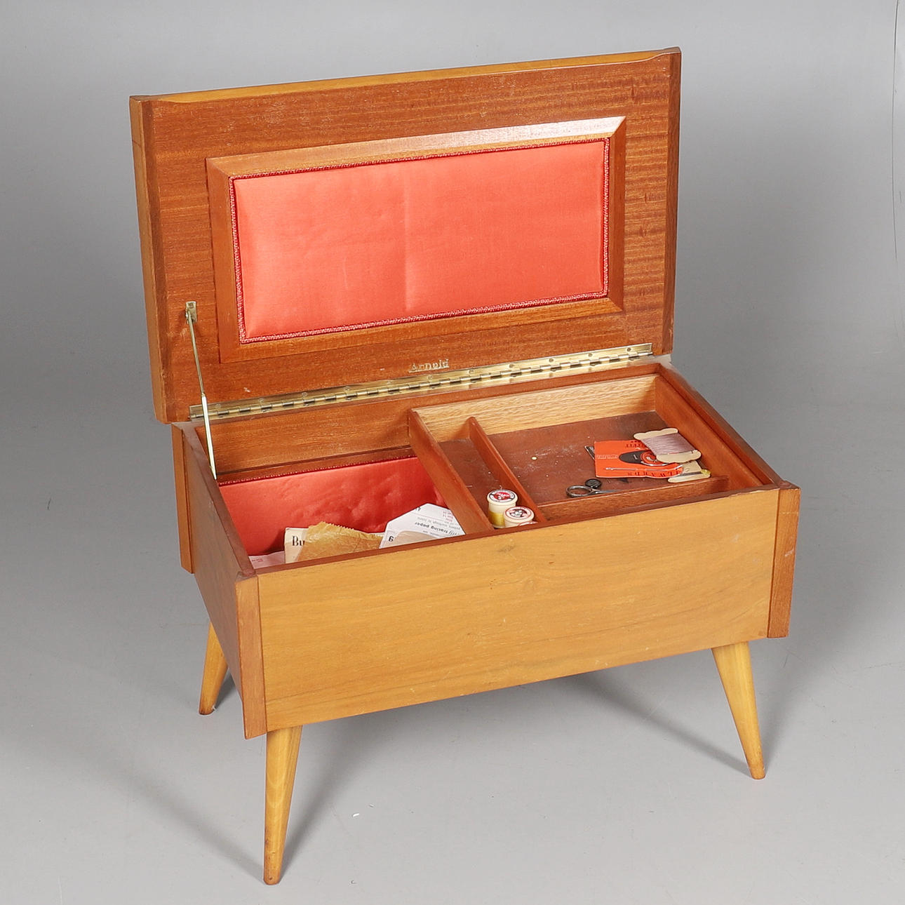 valnöt och mahogny, fällbar skiva över inredd interiör, innehåll bl a inklusive en liten mängd av 1950-talets Simplicity dress designs.