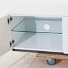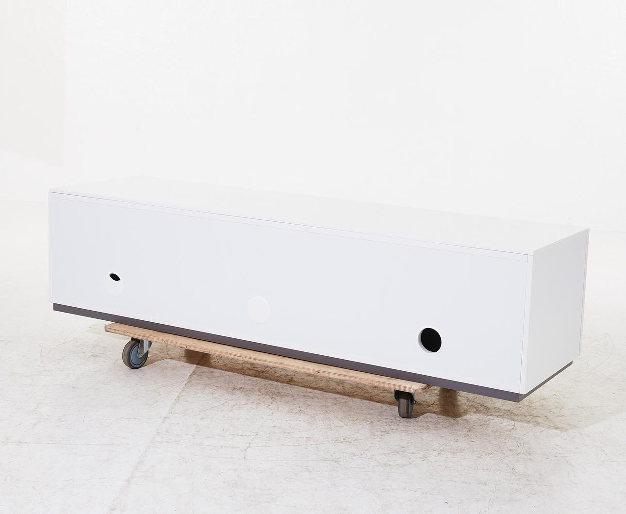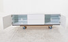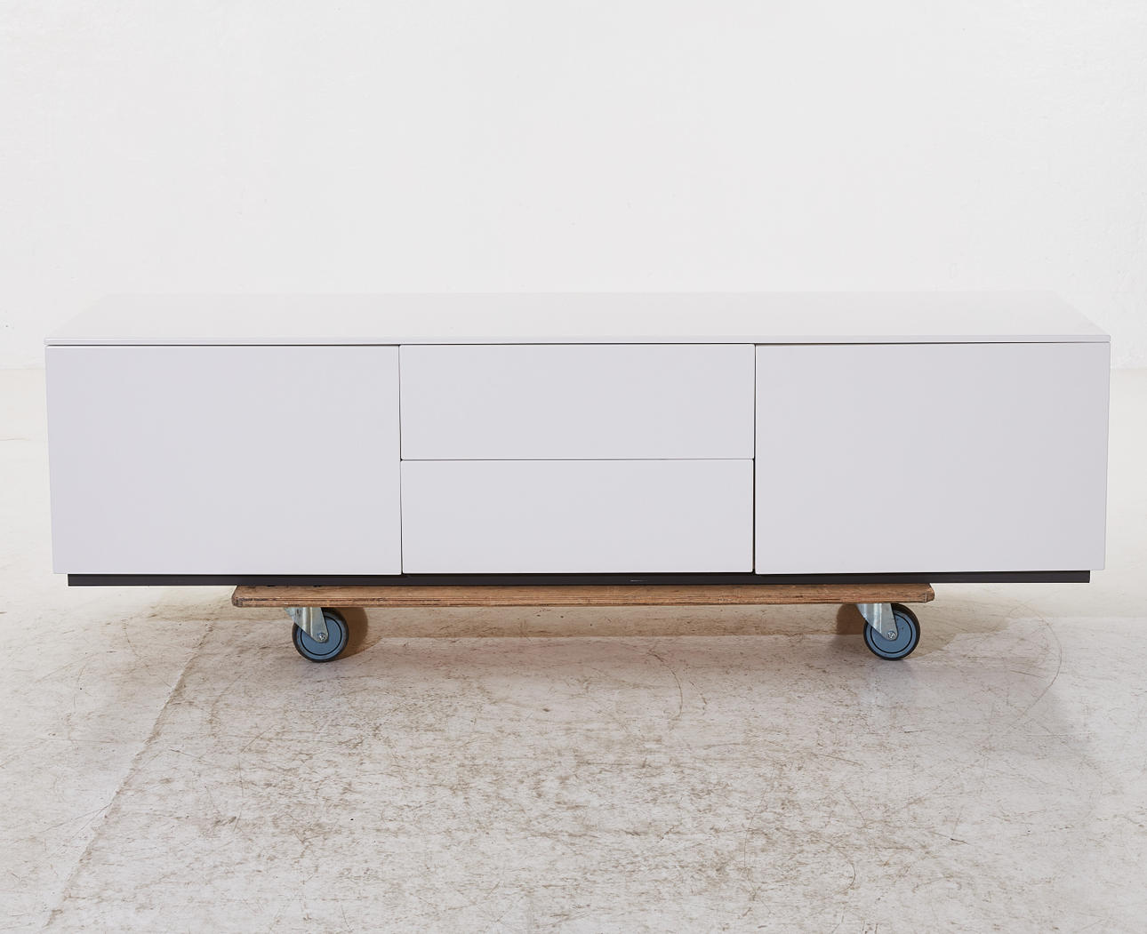 Vitackerad MDF, mittsektion med två lådor, dörr på vardera sida med bakomliggande hyllplan, höjd ca 44, 180x50 cm.