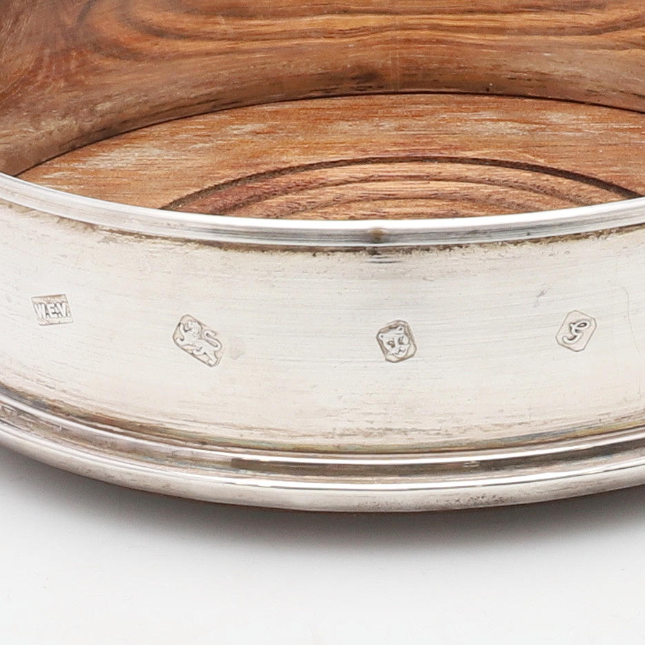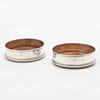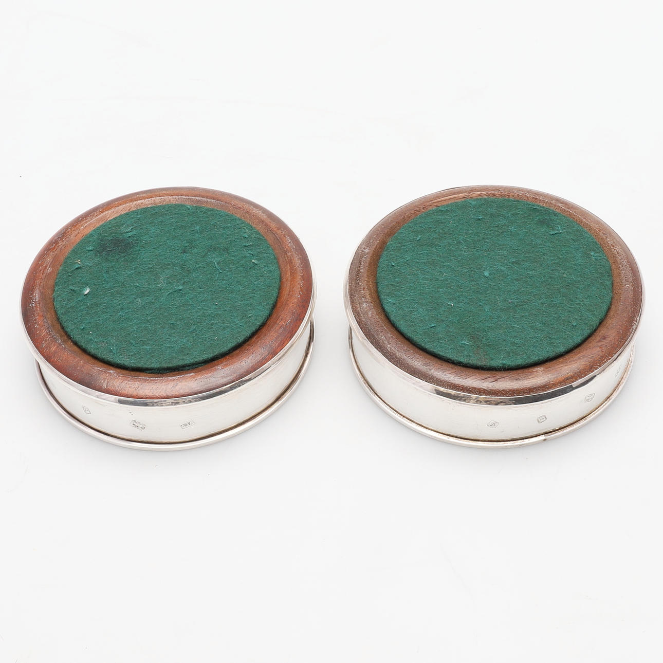slätt med upphöjd kant och trampade bas, vände trä bas, av W.E.V., visa stämplar för London 1981, 12,5cm diam., 3,5 cm hög, (2).