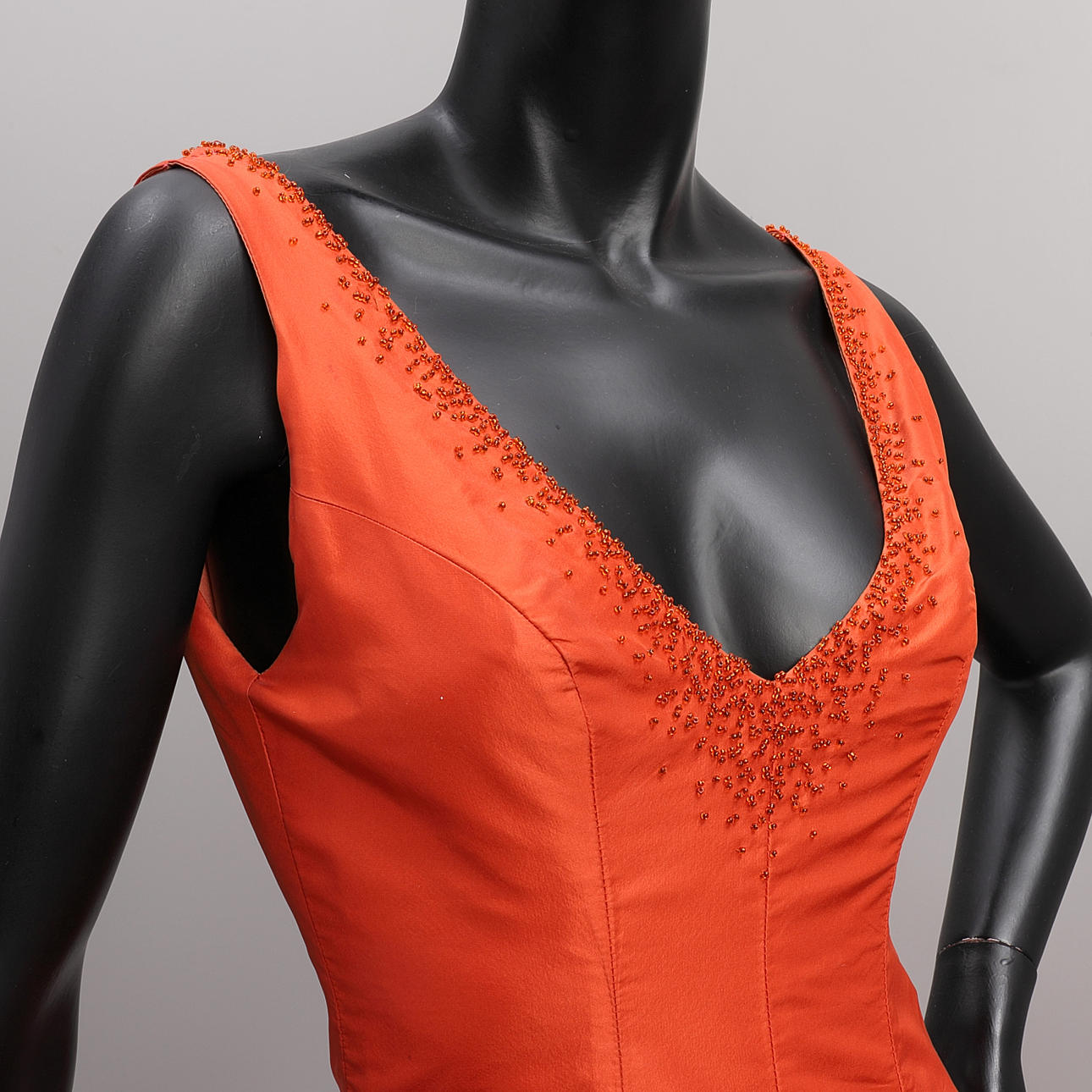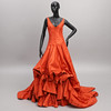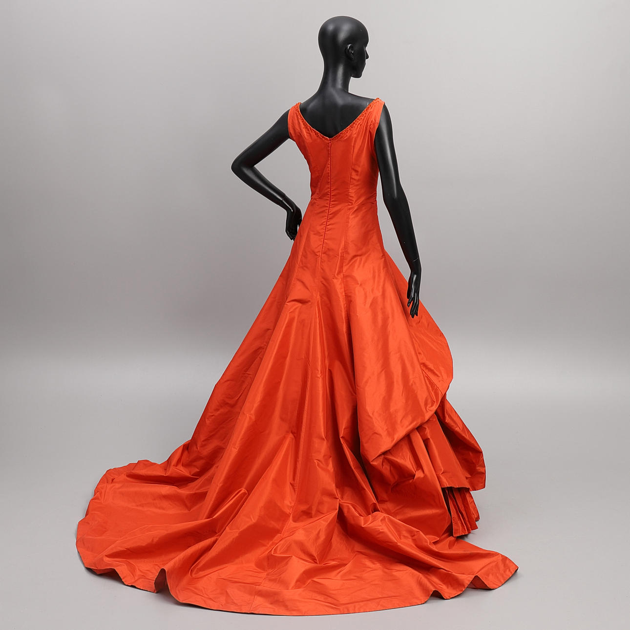 Klänning märkt "Lars Wallin Couture", i sidentaft med plisseringar, draperingar, glaspärlsbroderi samt rosetter. Med inre midjeband samt underkjol i tyll.
