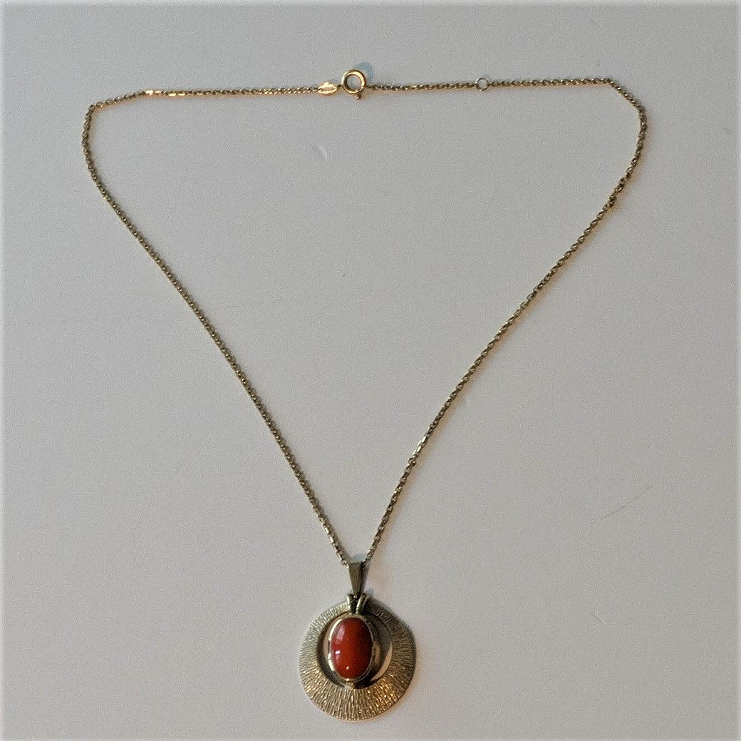 333/8 carat guld, kedja, ca 40 cm lång, hänge ca 2,5 cm diameter.