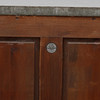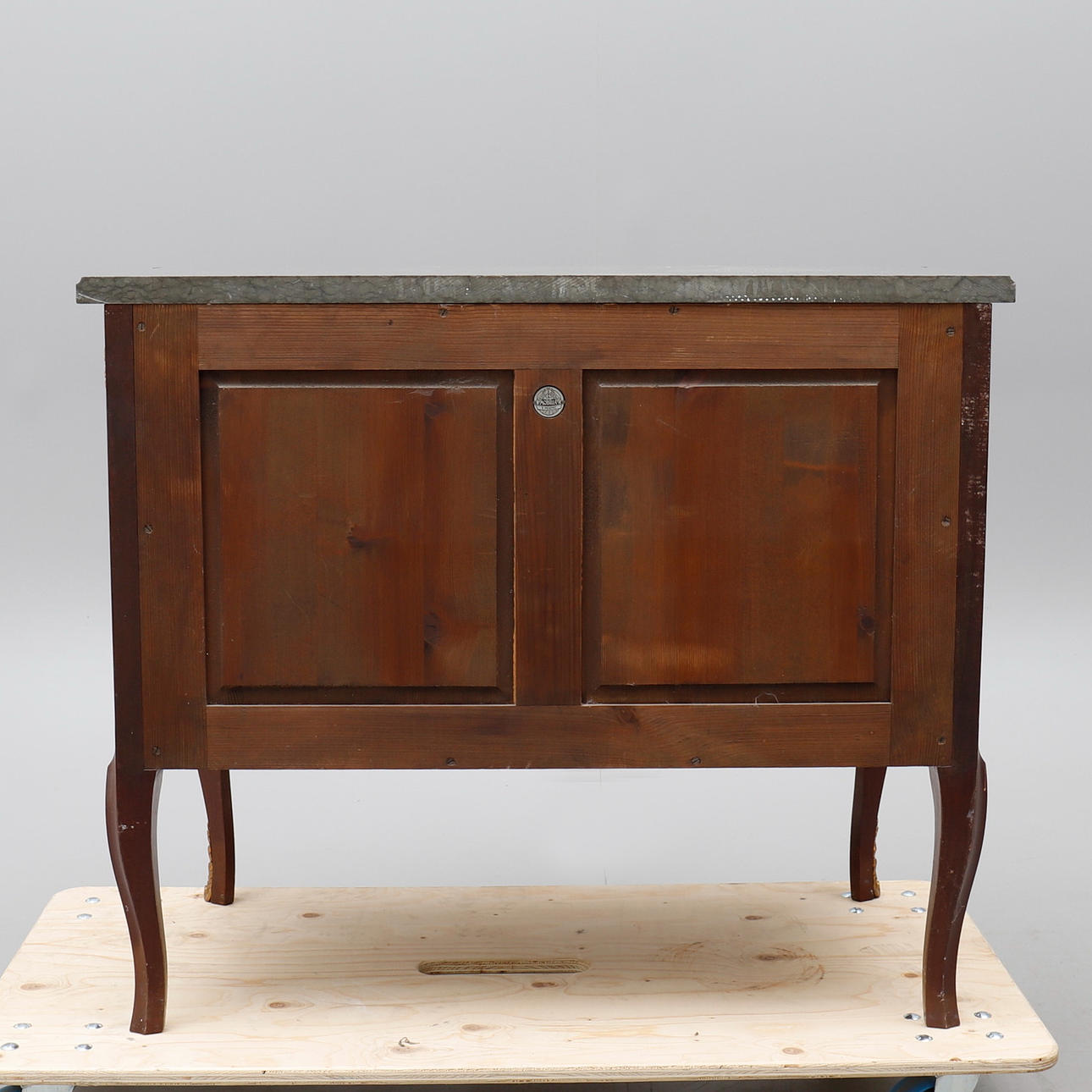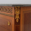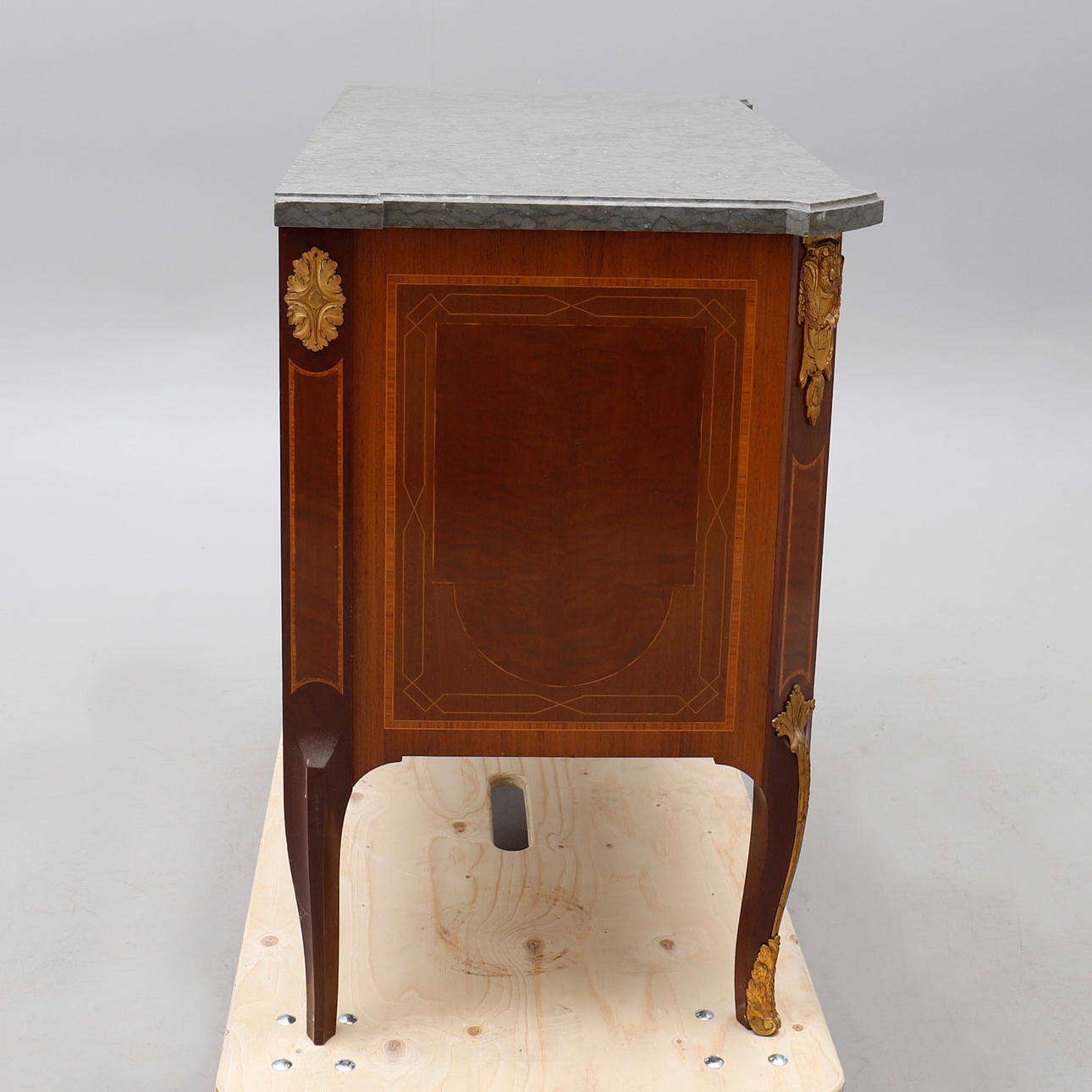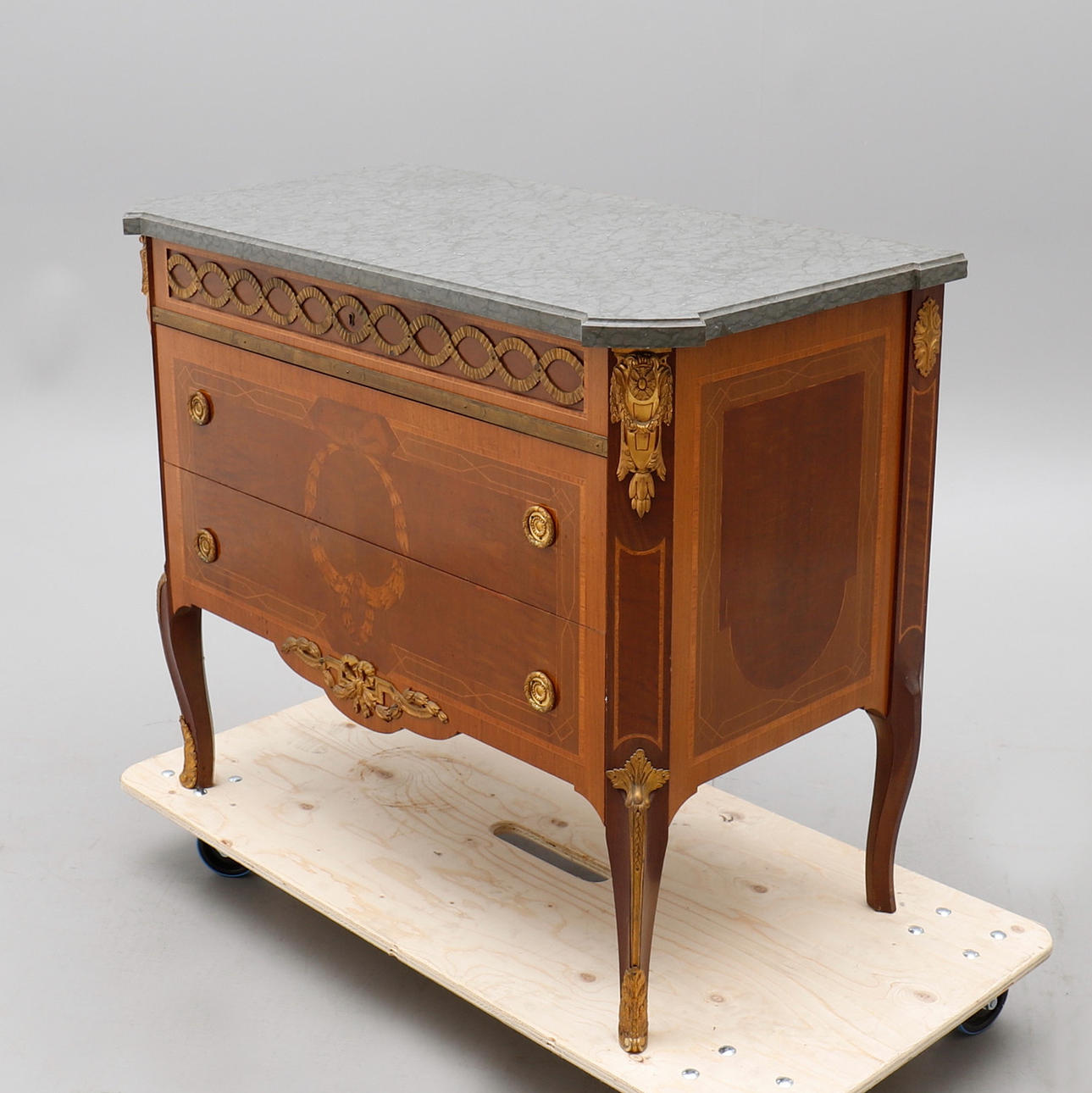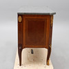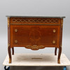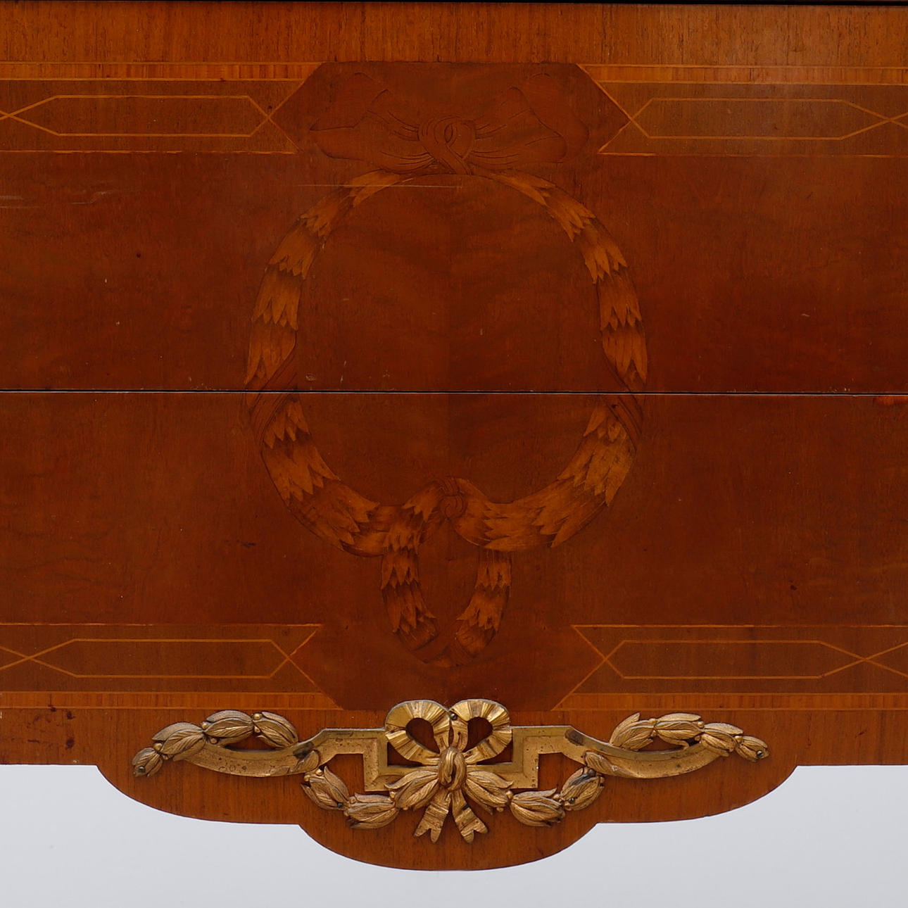 Rak form, snedställda hörn. Fanerad med bl a mahogny, björk m fl träslag, intarsiadekor. Skiva av grå marmor. Tre lådor. Bronsbeslag. Bredd 99, djup 54, höjd 83 cm.