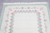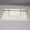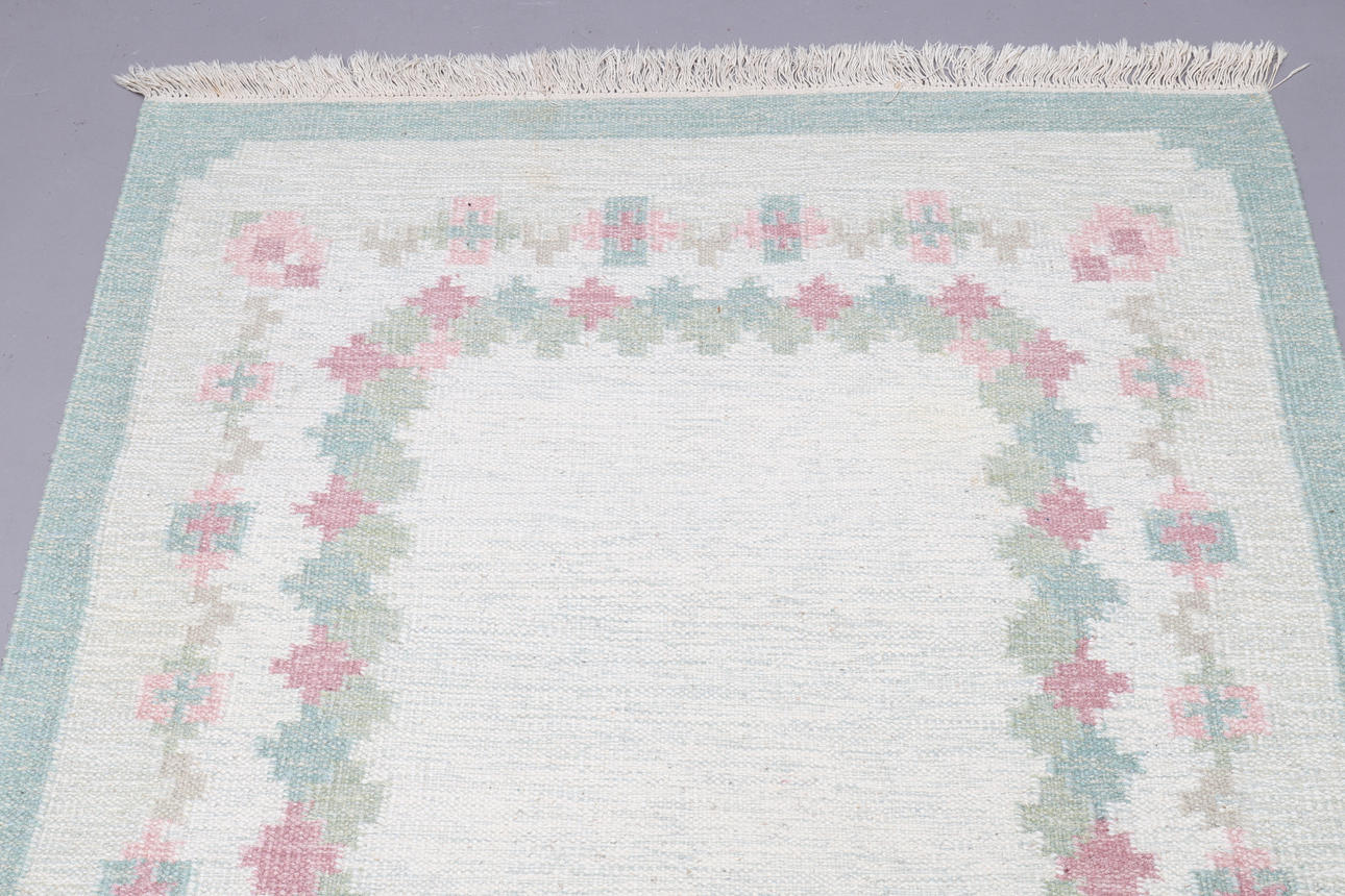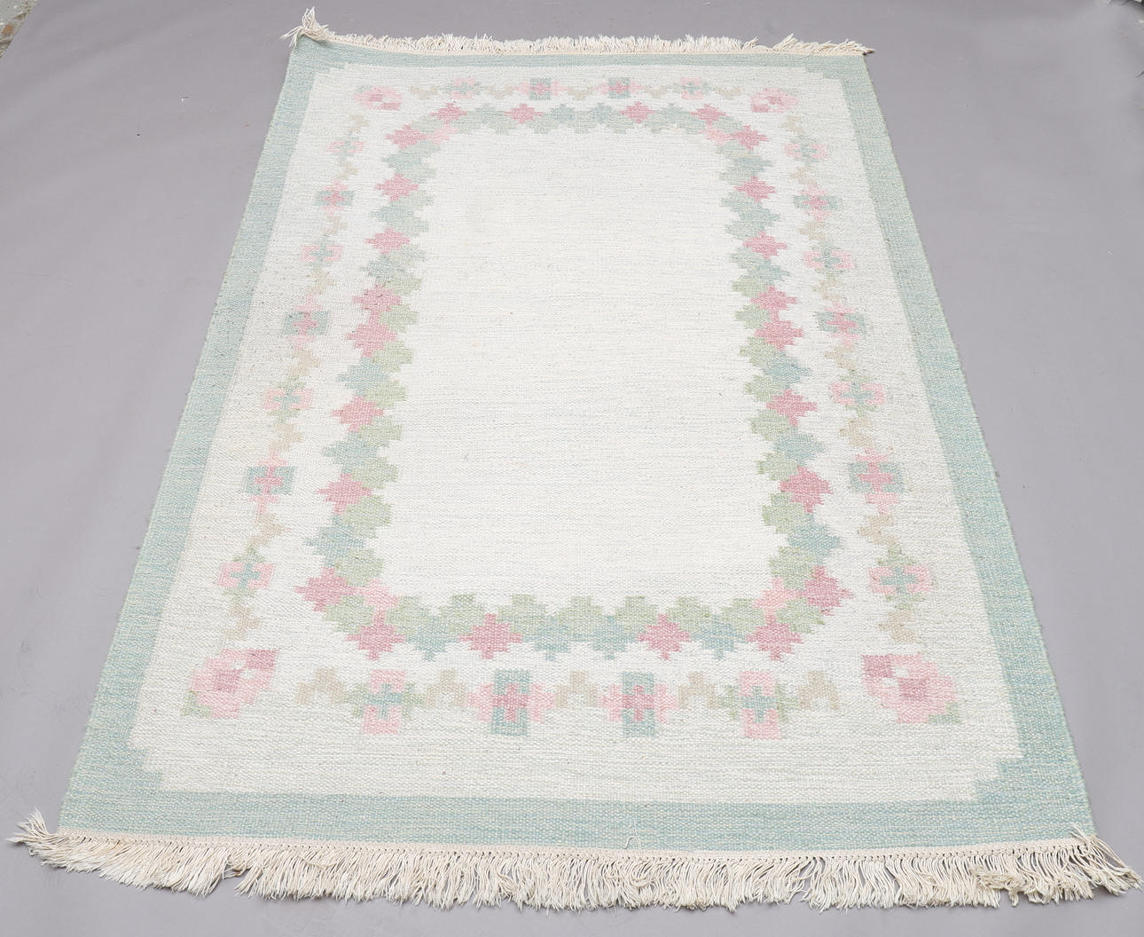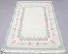Gråmelerad botten med lindblomsgrön ram och gröna och rosa blommor. Mått exkl fransar ca 135x190 cm.