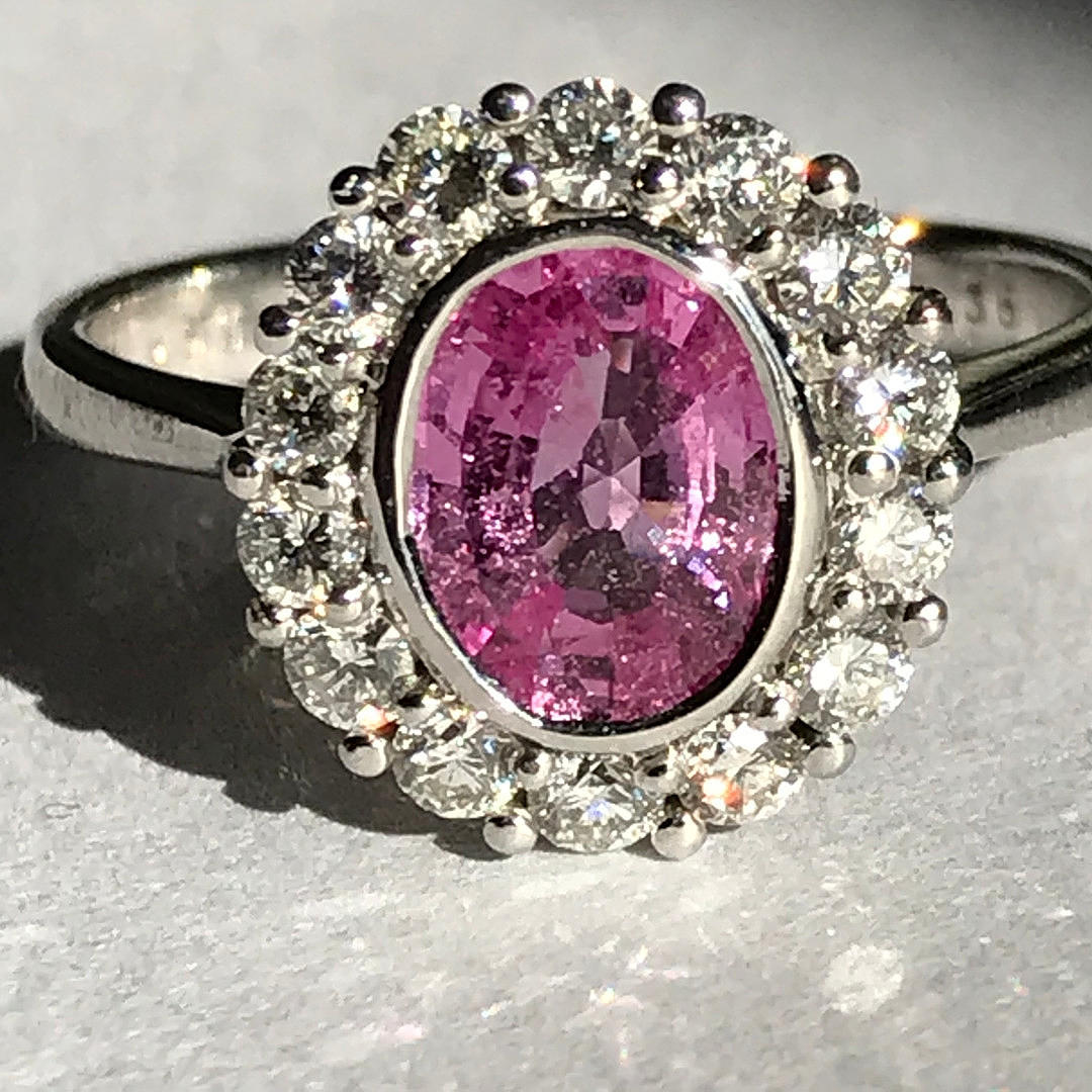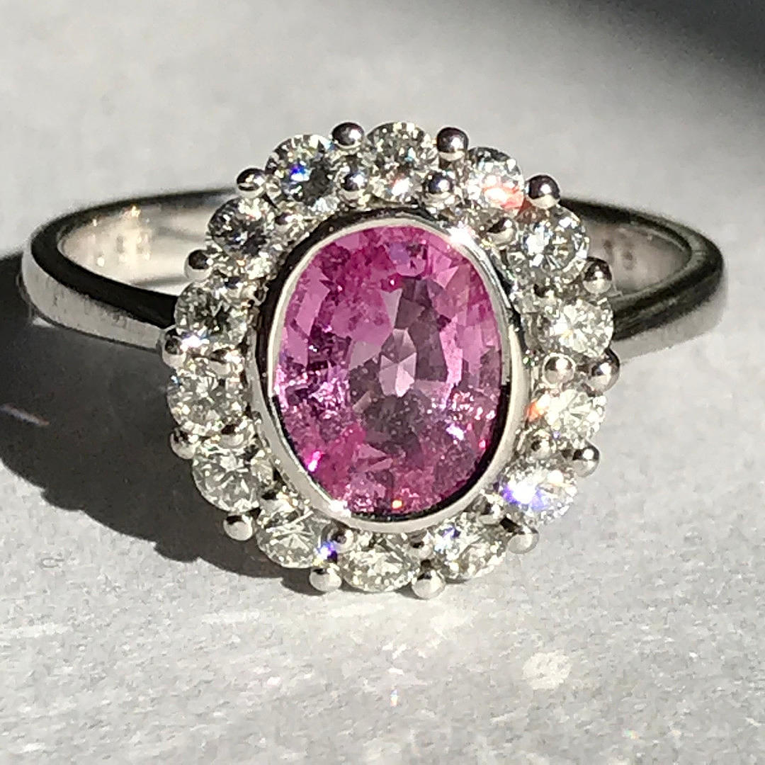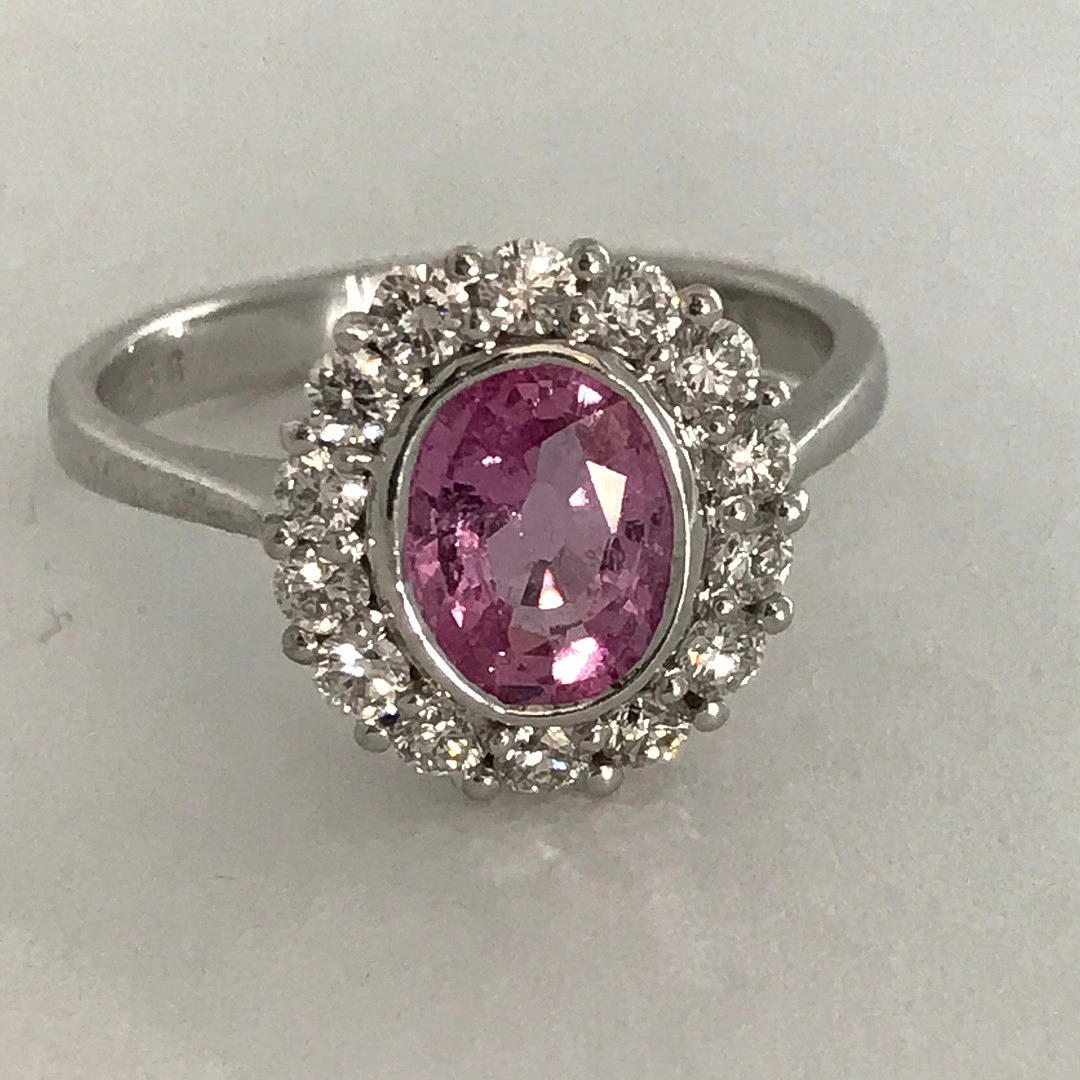Ställ runt den rosa safir är 14 runda lysande diamant i fyra klo fästen. Diamanter har en total karatvikt på 0.56ct (stämplat inuti skaftet).