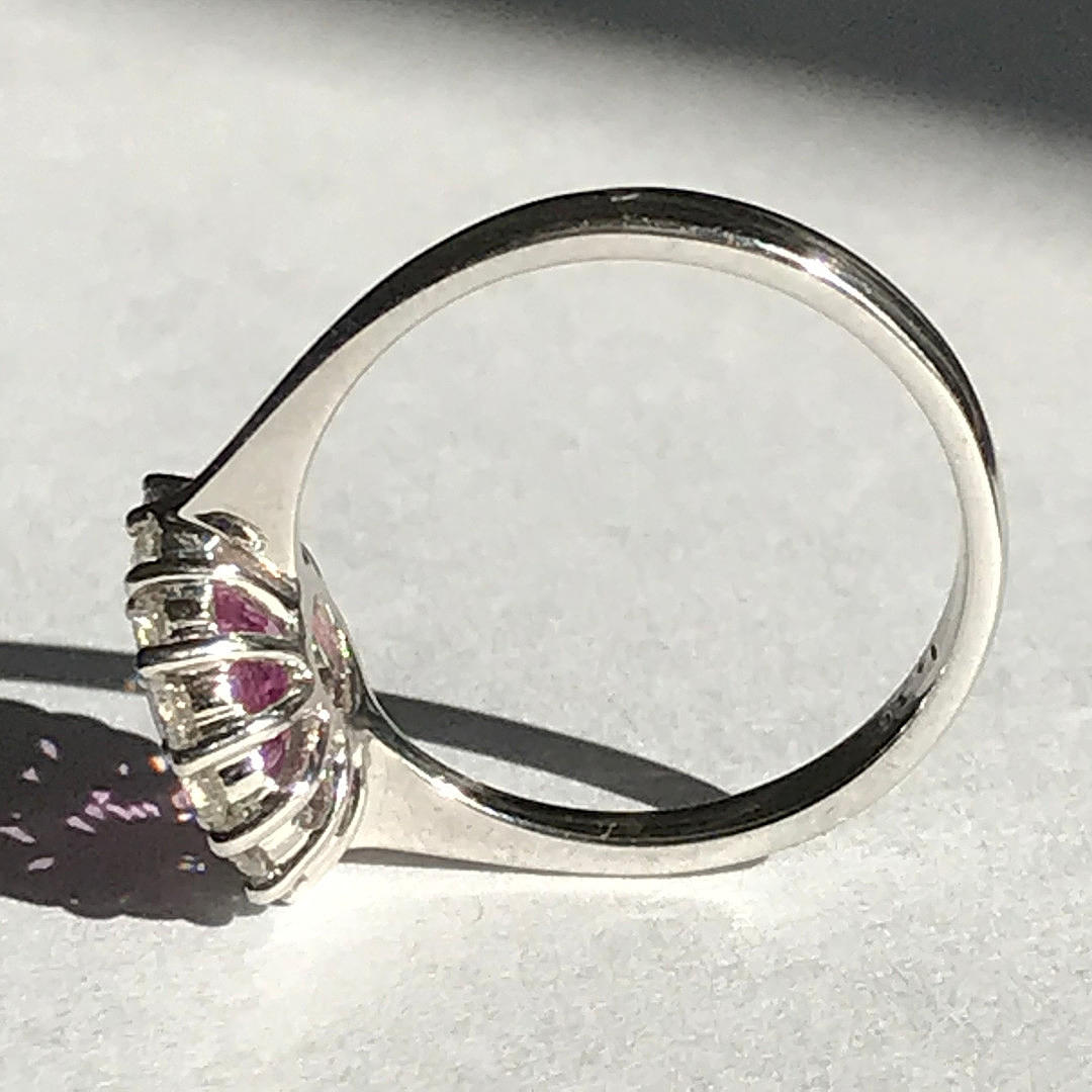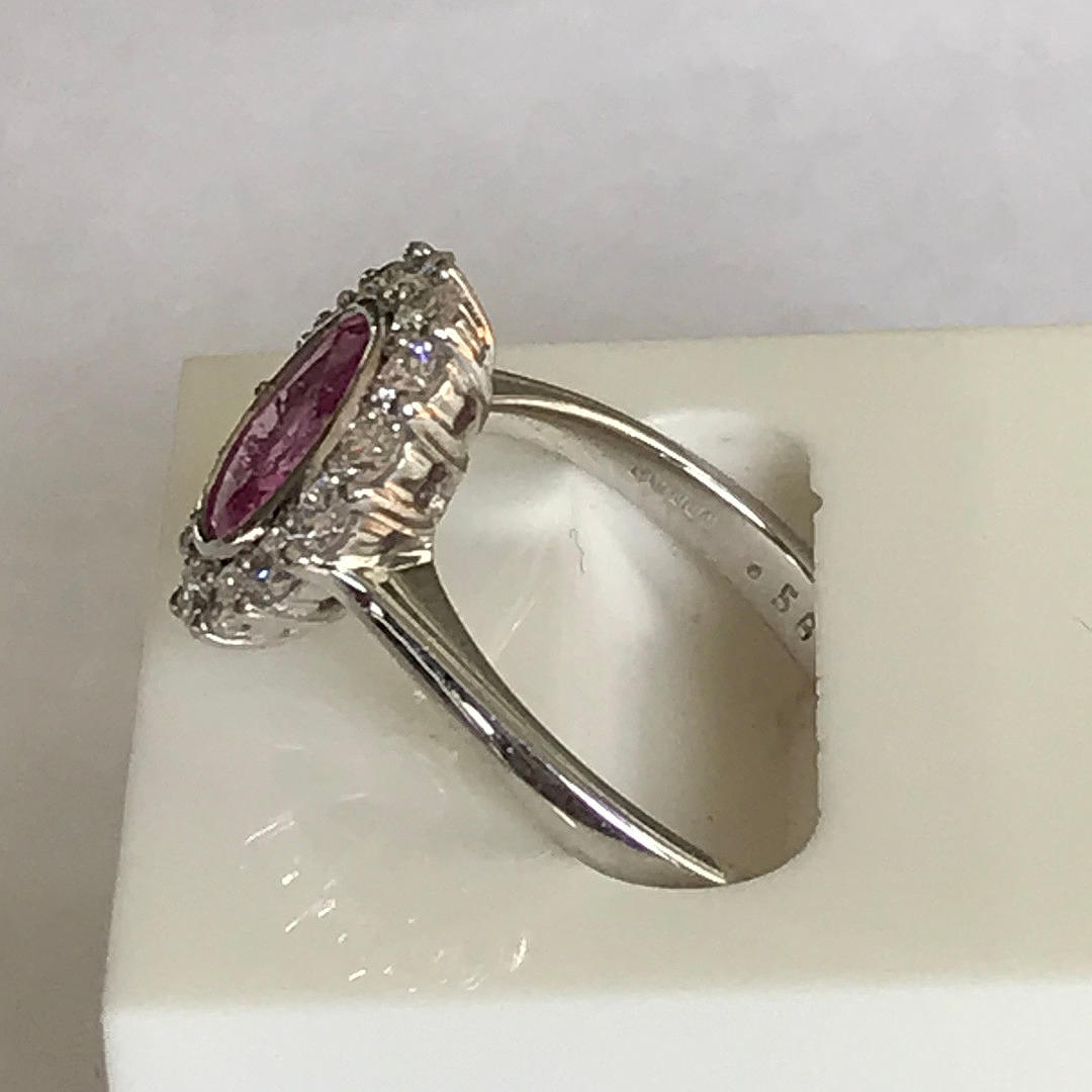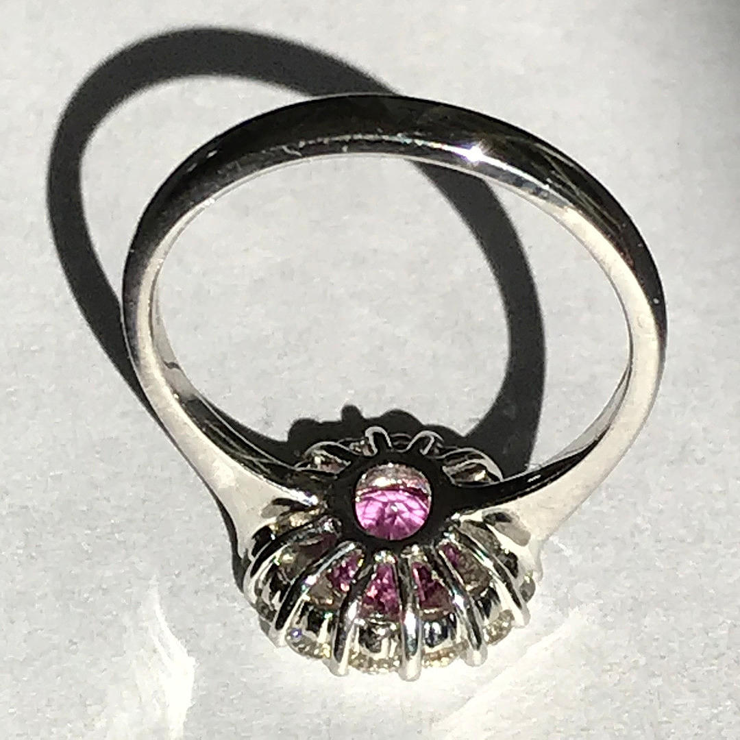 Ställ runt den rosa safir är 14 runda lysande diamant i fyra klo fästen. Diamanter har en total karatvikt på 0.56ct (stämplat inuti skaftet).