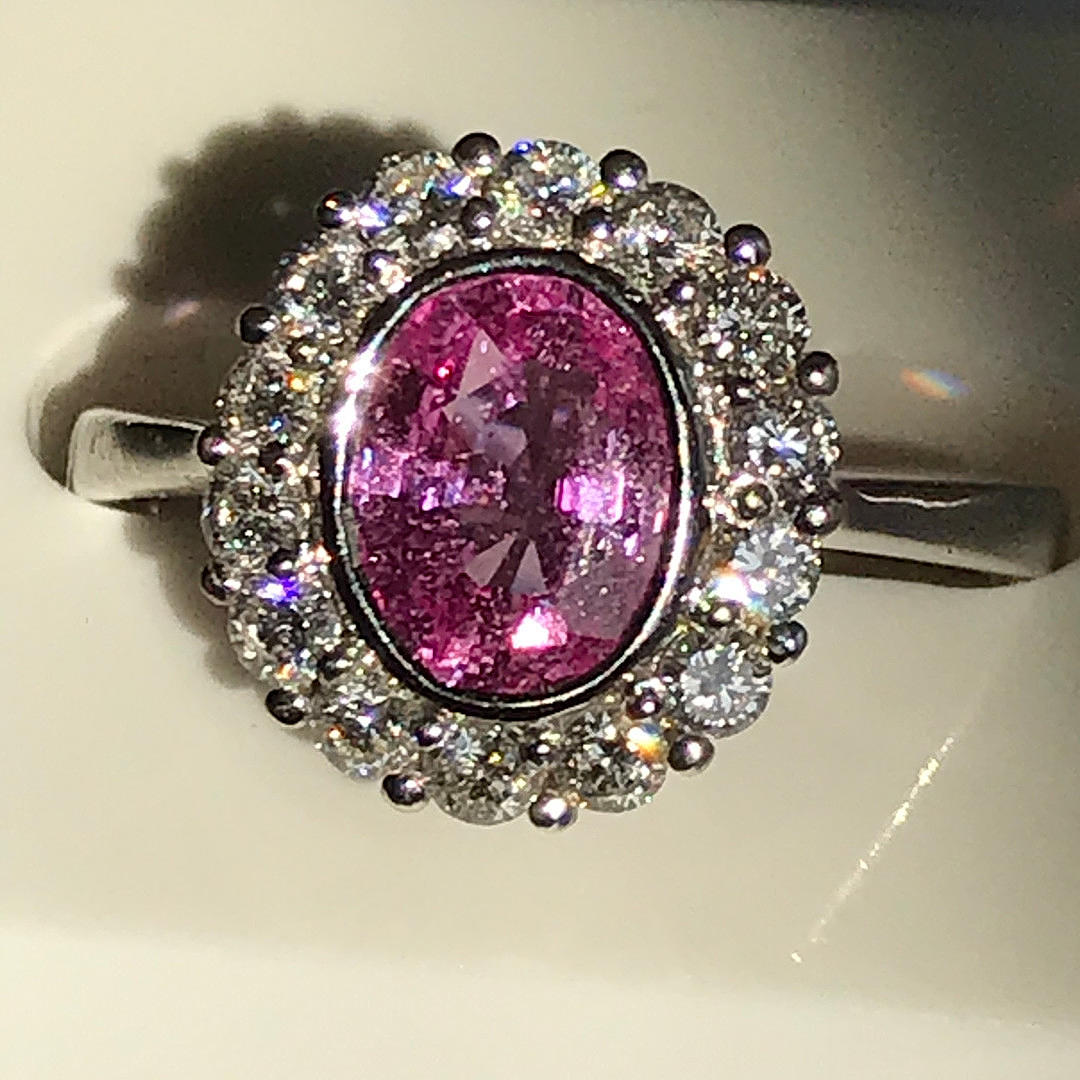 Ringen är inställd med en oval formad rosa safir i en rub over inställning. Den rosa safiren är 1.36ct (stämplad inuti skaftet).