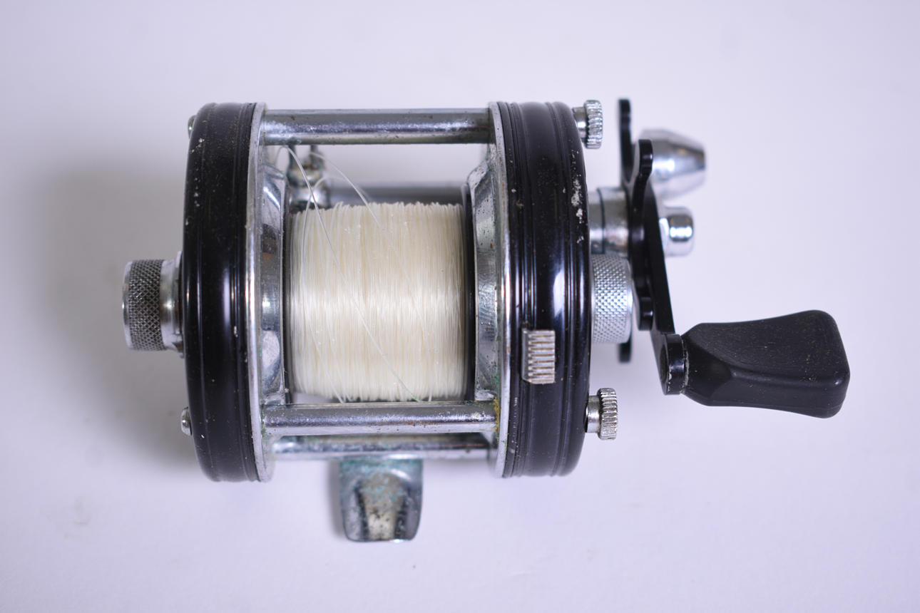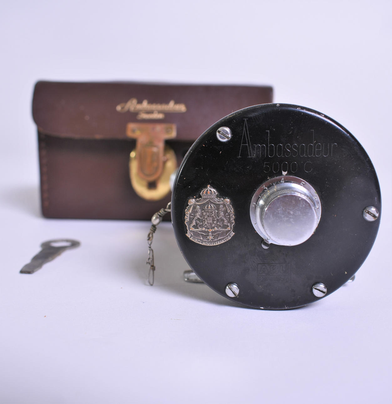 AMBASSADEUR fiskrullar med KUNGLIGA HOVLEVERANTÖR stämpel på både rullar och tillhörande fodral (förutom på ett av fodralen). En mässingklubba medföljer också.