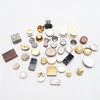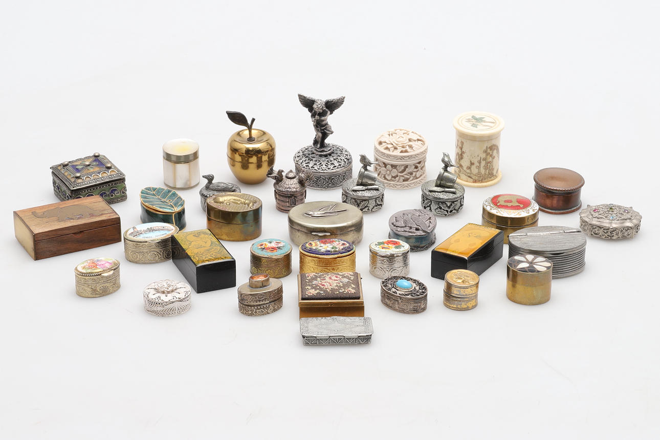 mestadels ny tillverkning, i tenn, SOM sten set, filigran cirkulär låda, ben, emalj och andra, (31).