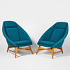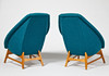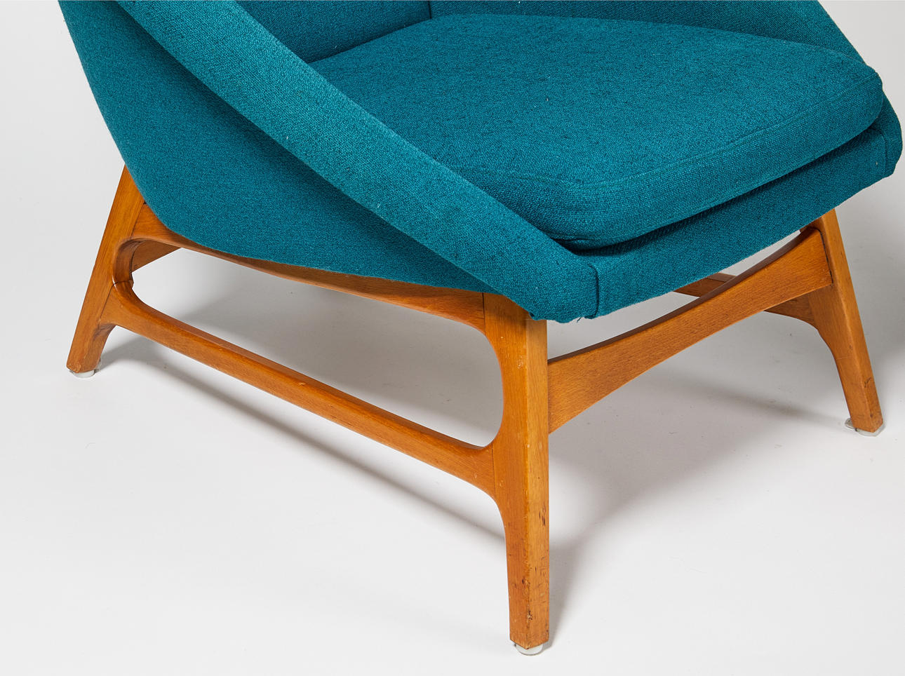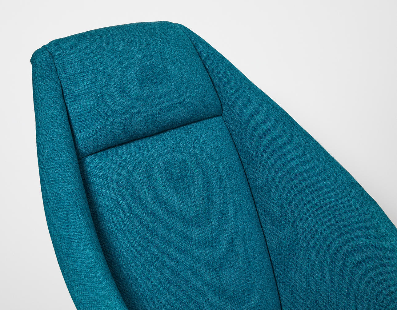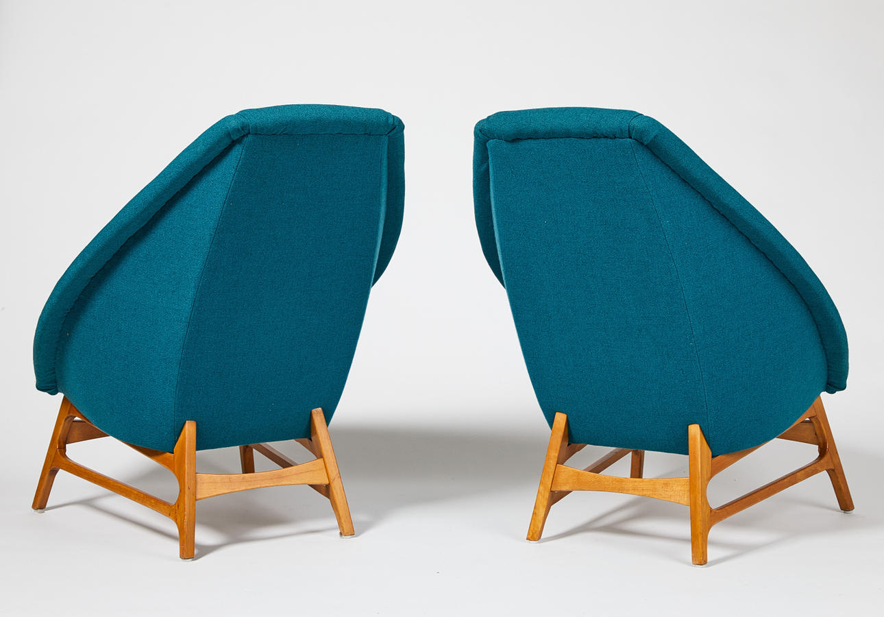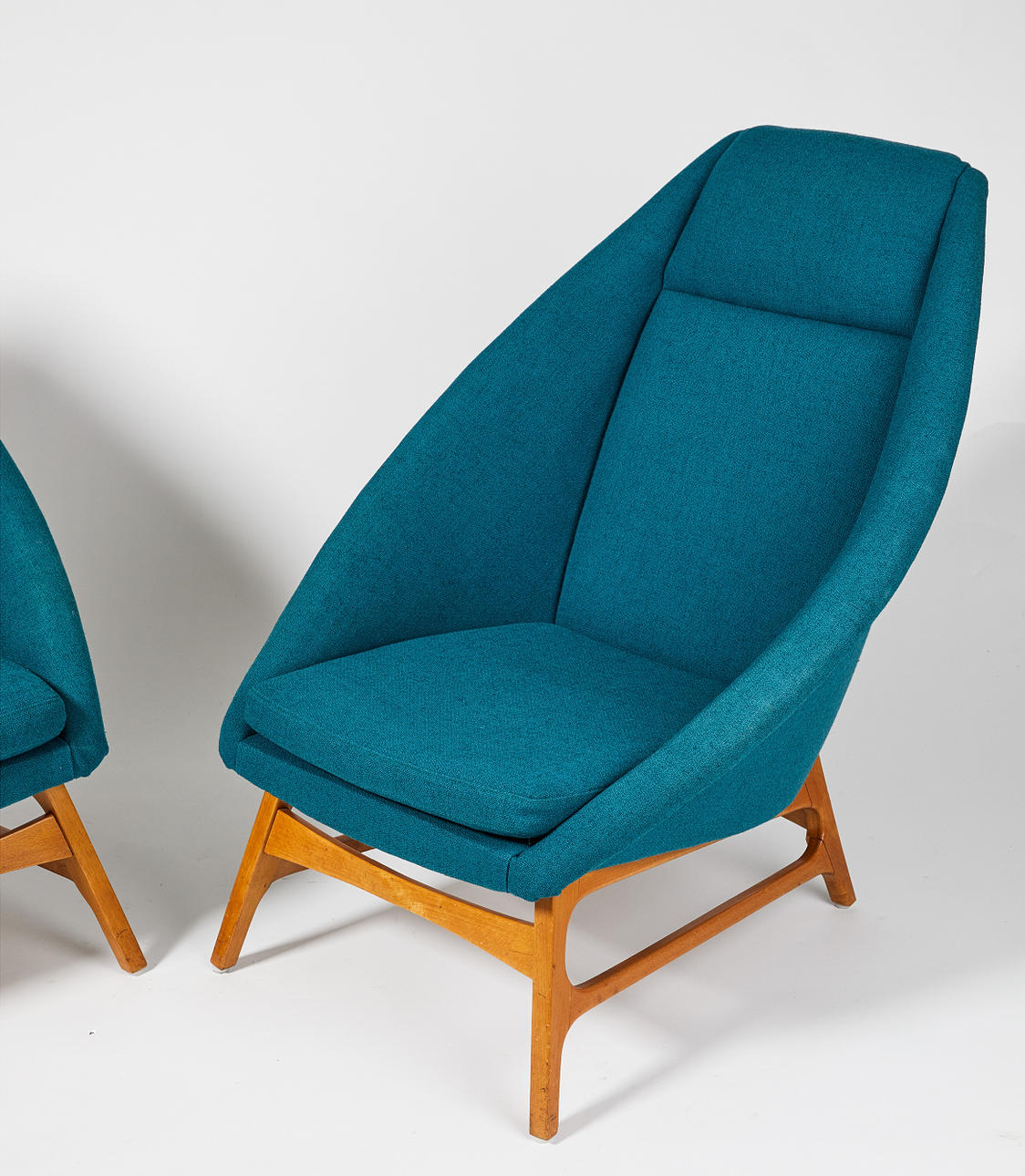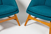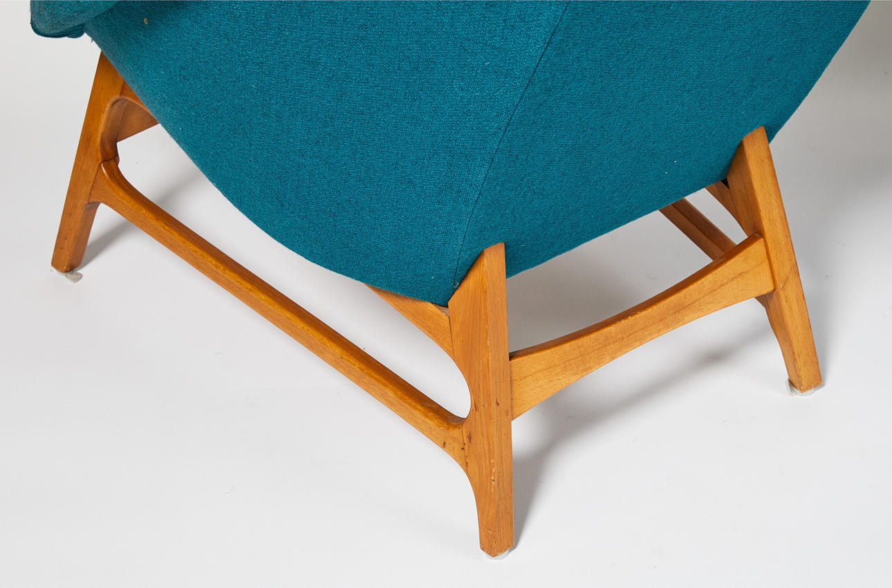 Stomme av björk, stoppad sits och rygg, klädda med blågrön textil, höjd 90, sitthöjd 41 cm.