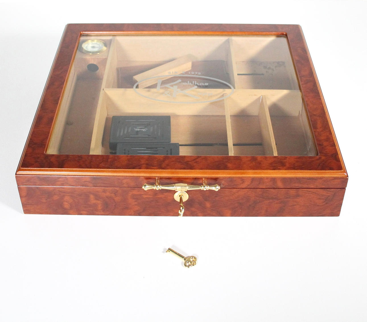 Kohlhase & Kopp humidor, med glaslock, med integrerad hygrometer (inuti), inklusive två passatore luftfuktare, låsbara (inklusive 2 nycklar), undersida med filtöverdrag,