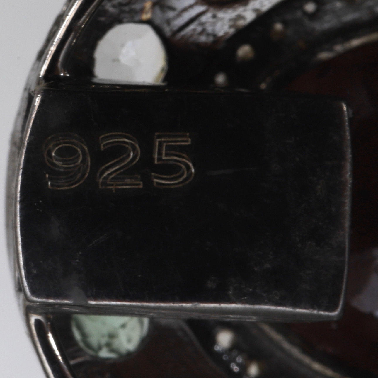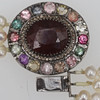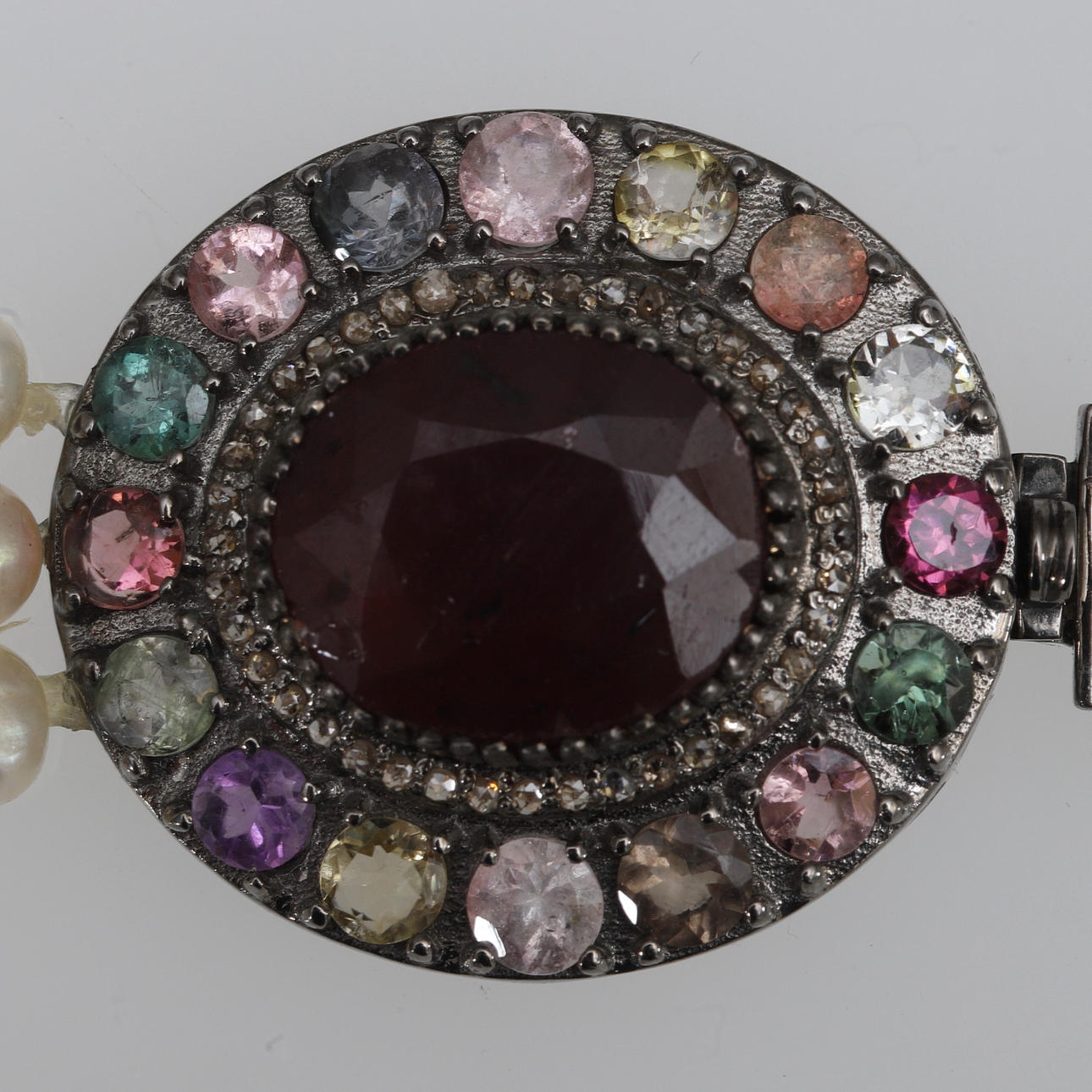 Lås av silverinfattade syntetiska ädelstenar; ca 20 ct rubin, 5,8 ct turmaliner och 0,55 ct diamanter. Längd på lås ca 3,5 cm