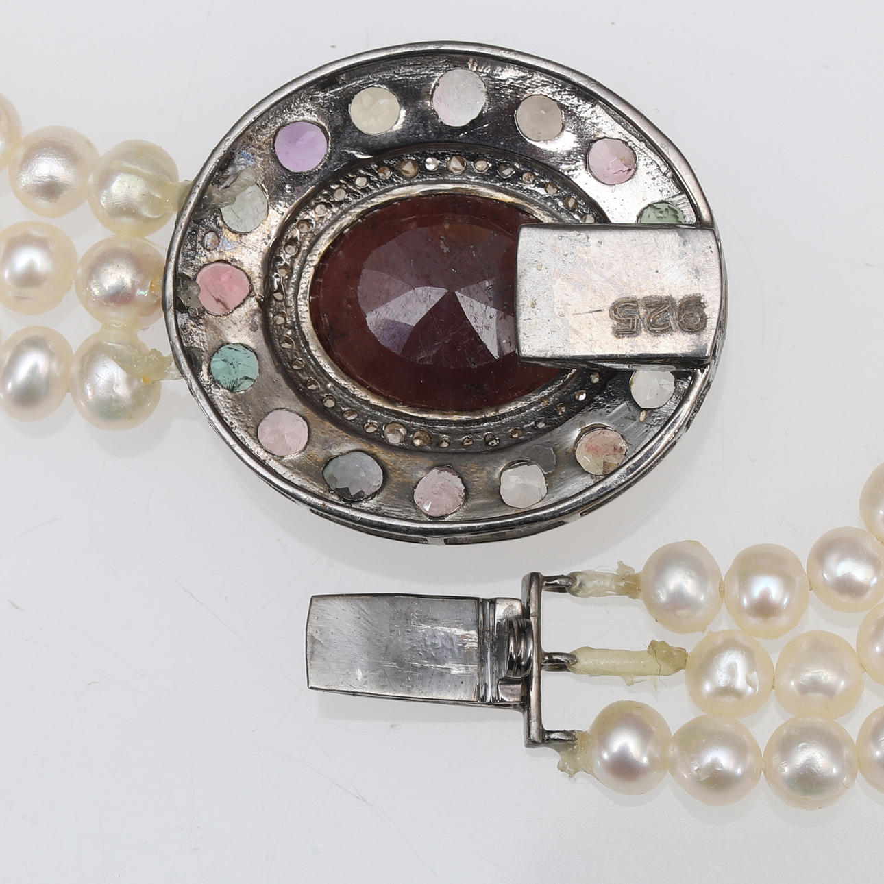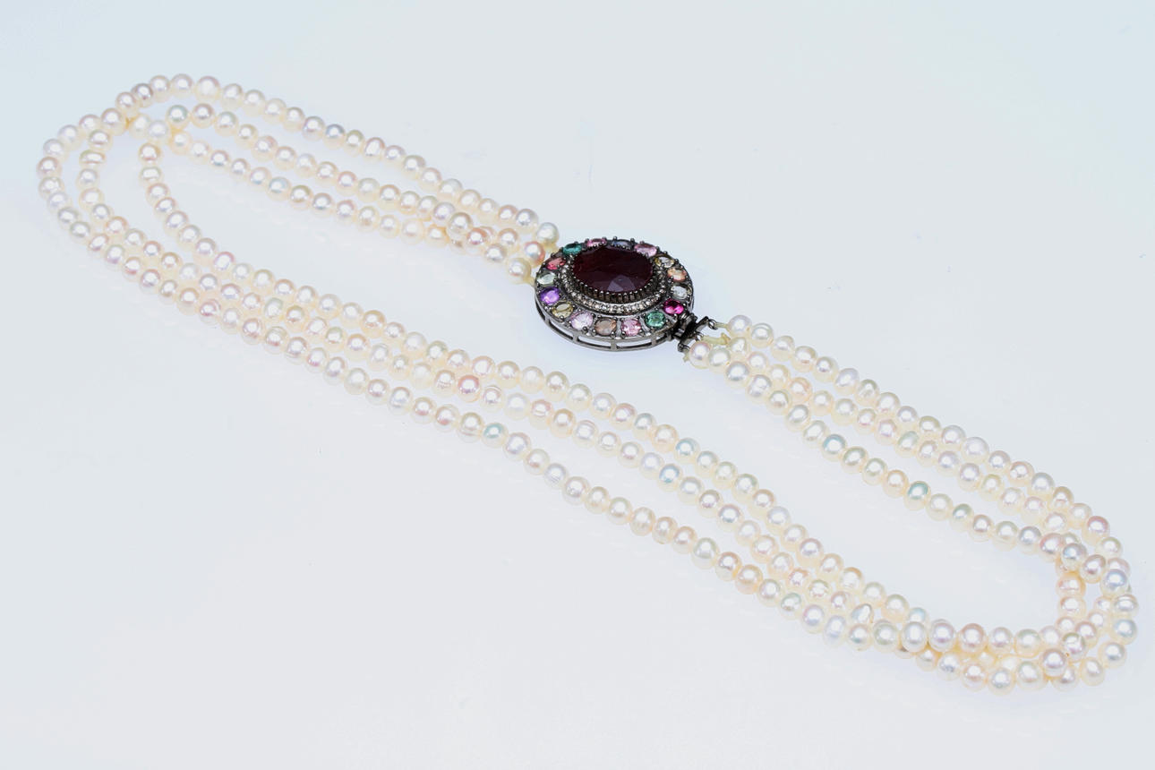 1789970. COLLIER, treradigt pärlhalsband och ädelstenar.