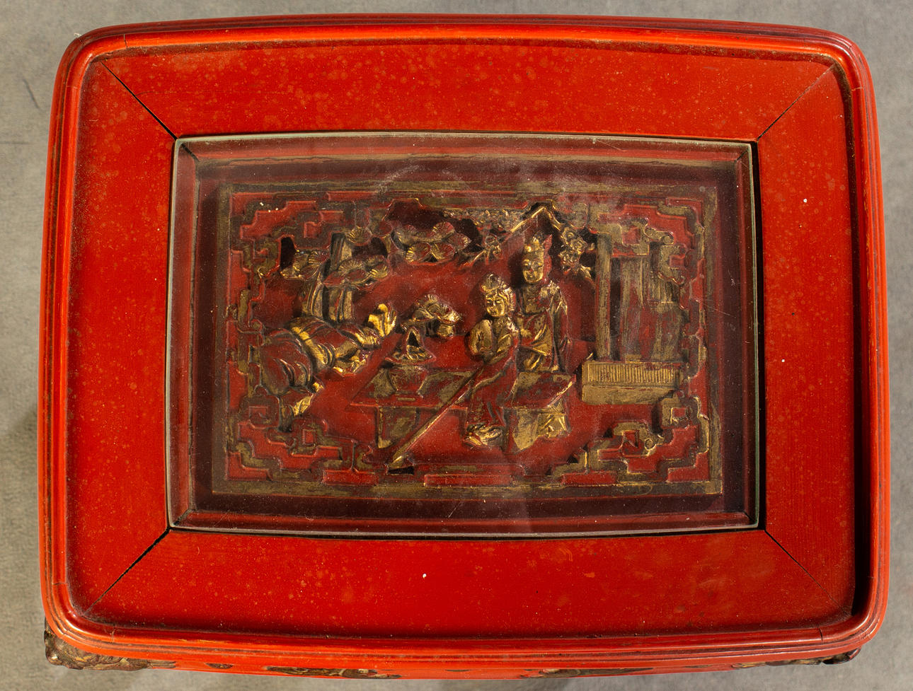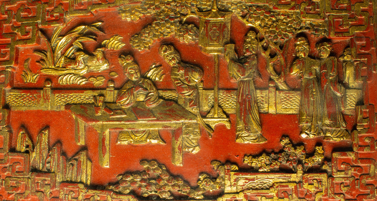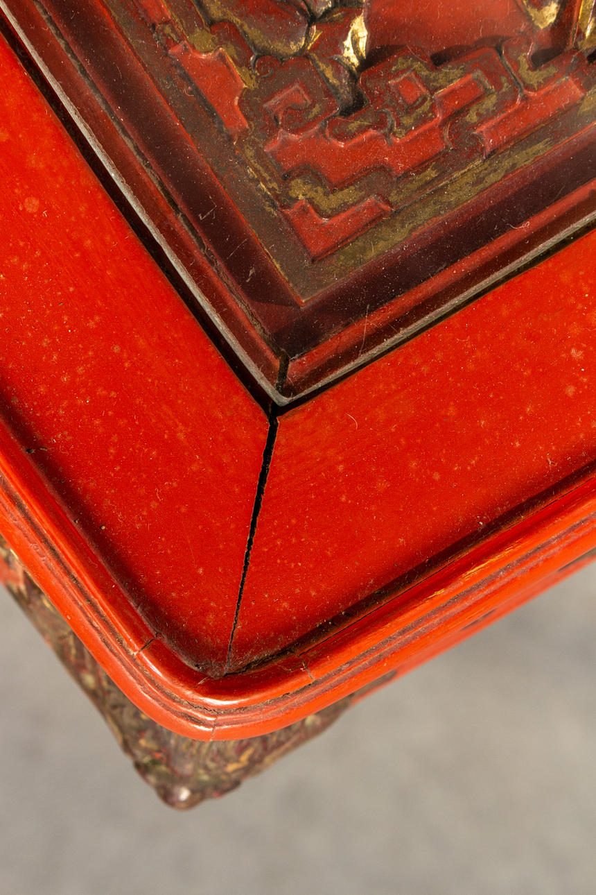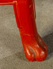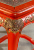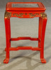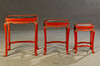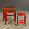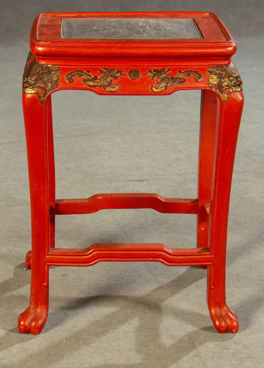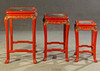 3 dukade bord, trä, målade i rött, ben förbundna med stag till klo fötter, bordsskiva med snidad relief, i trädgårdslandskap med figurativ skildring, guld bemanning, med glas, H.je. 67/59/51 cm, BxD: varje 60 x 43/48 x 35/37 x 29 cm.