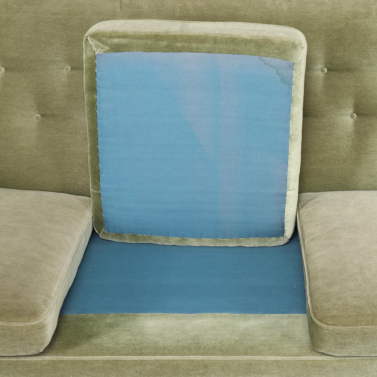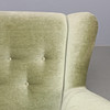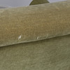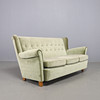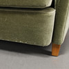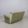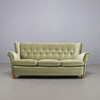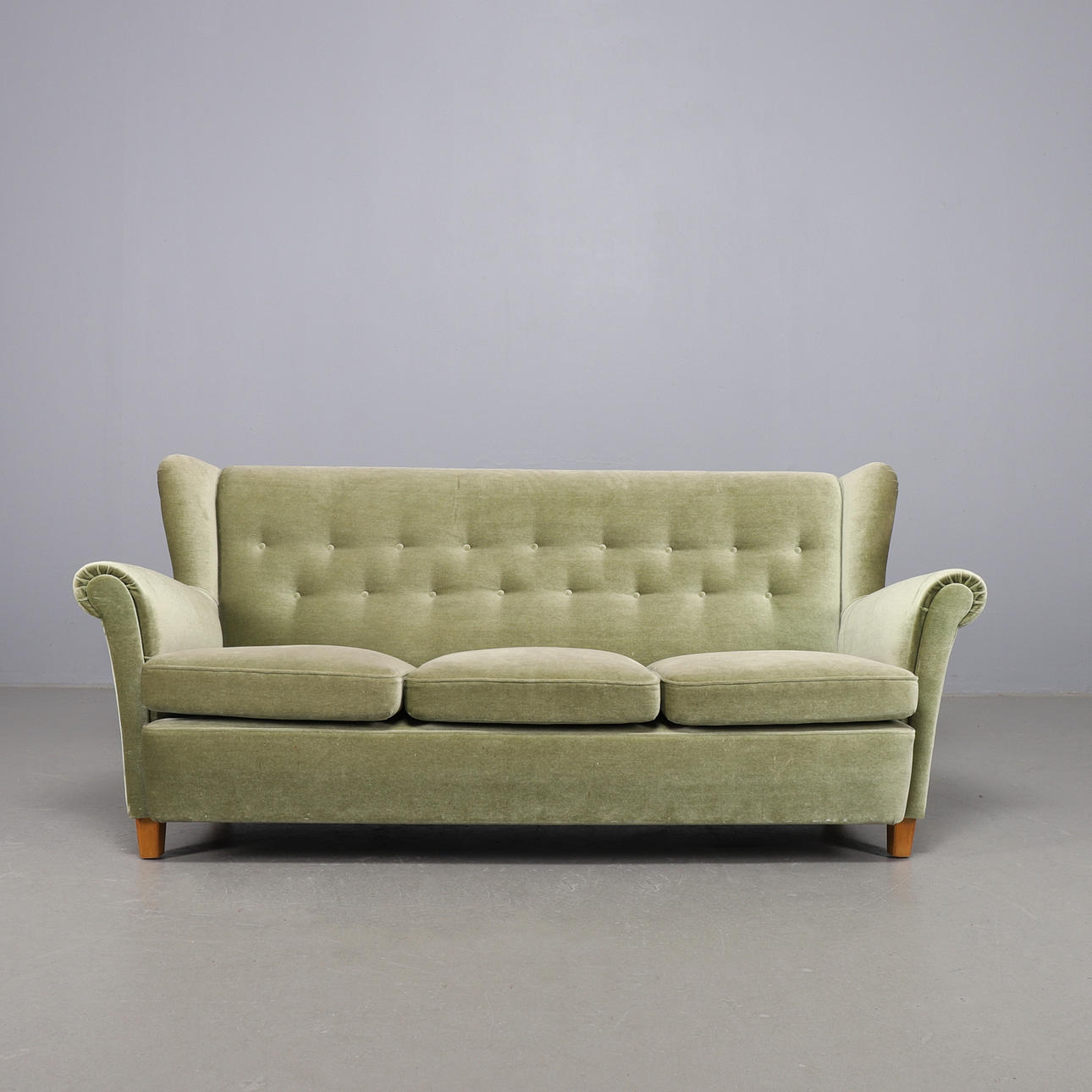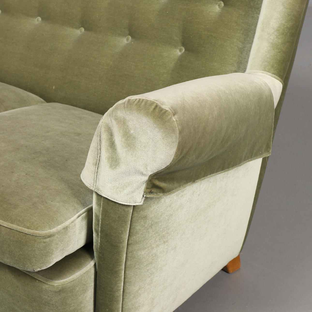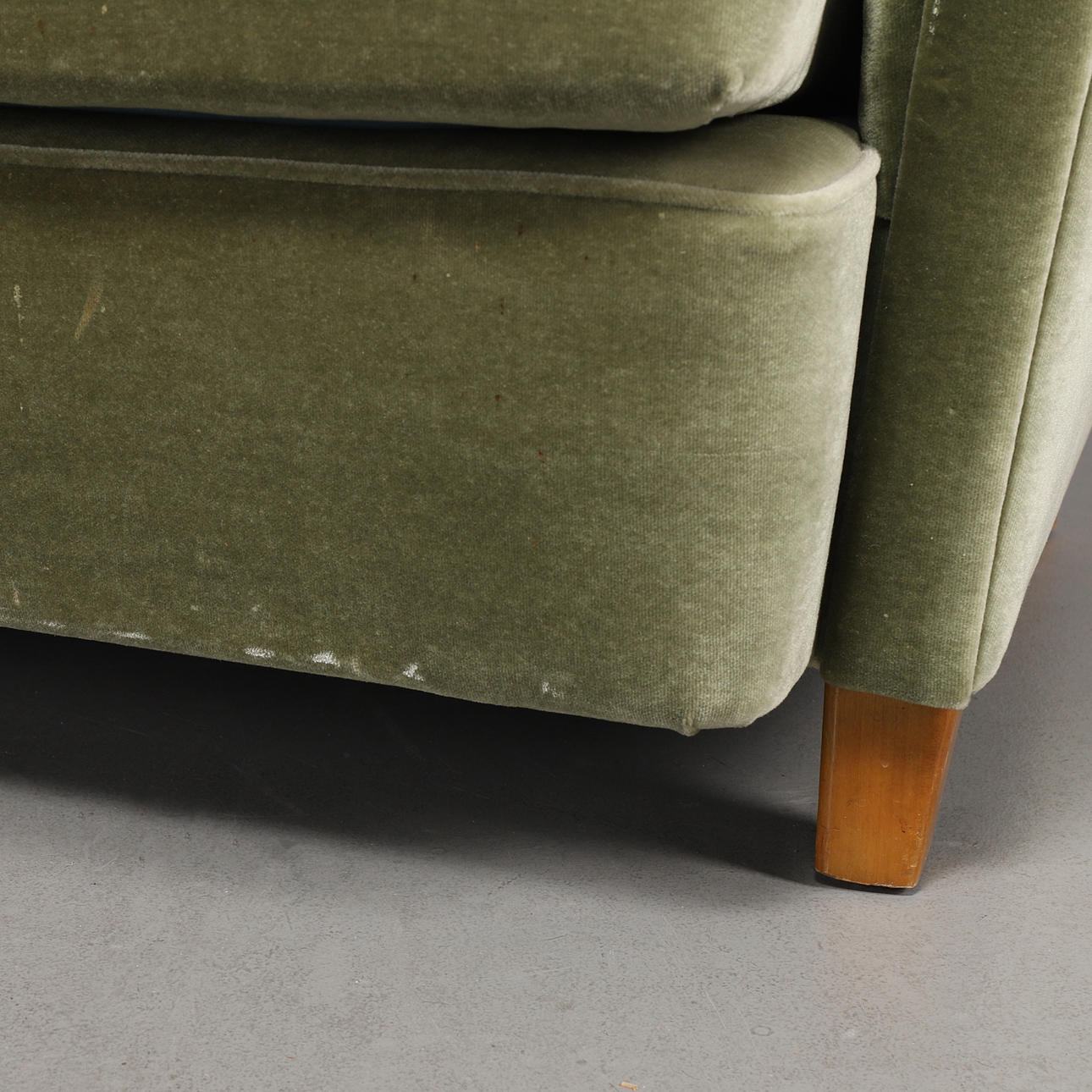 Grön sammetsklädsel, rygg med knappar, lösa sittplymåer, ben i trä, längd 183 cm, djup 78 cm, sitthöjd ca 40 cm.