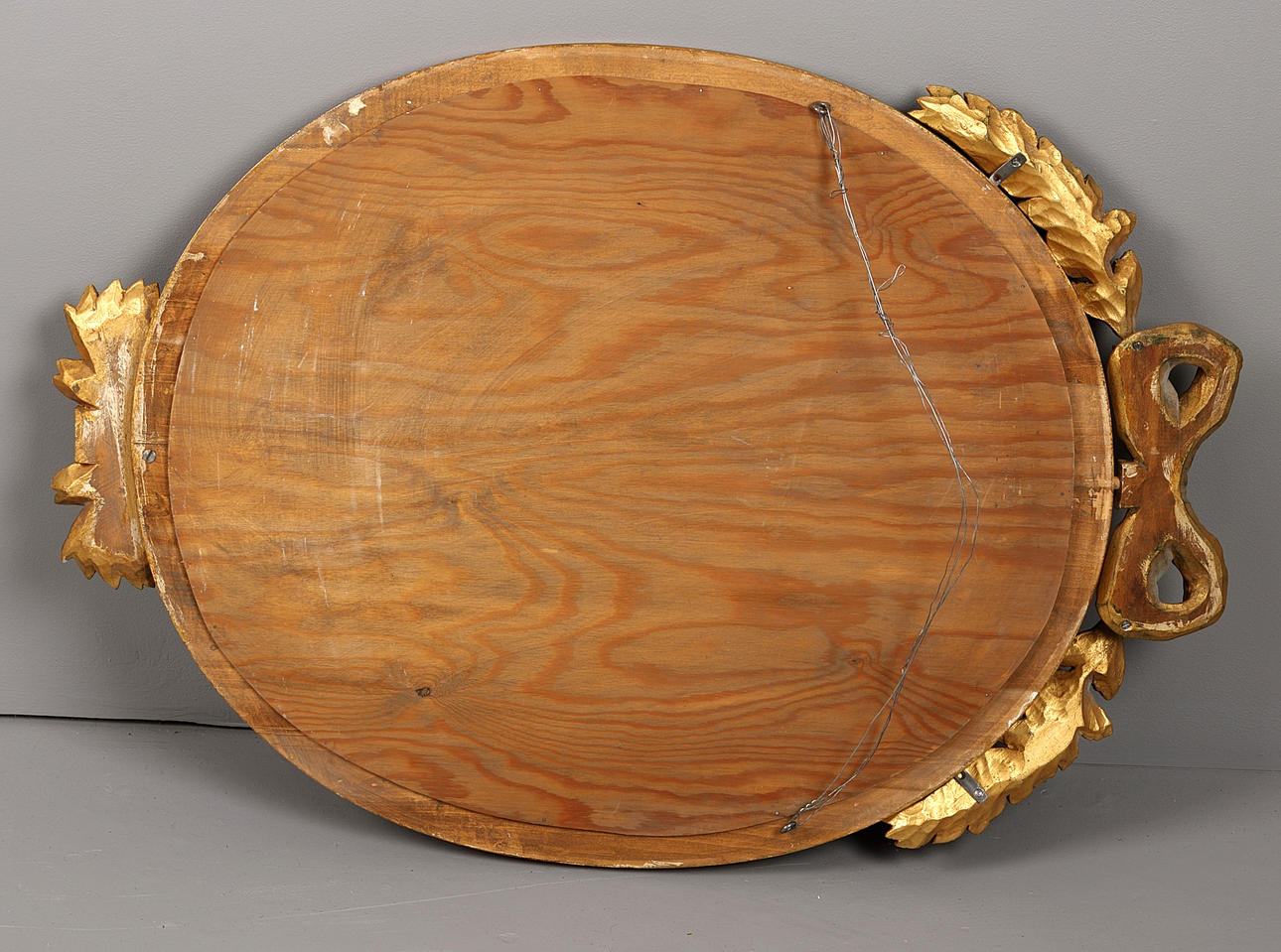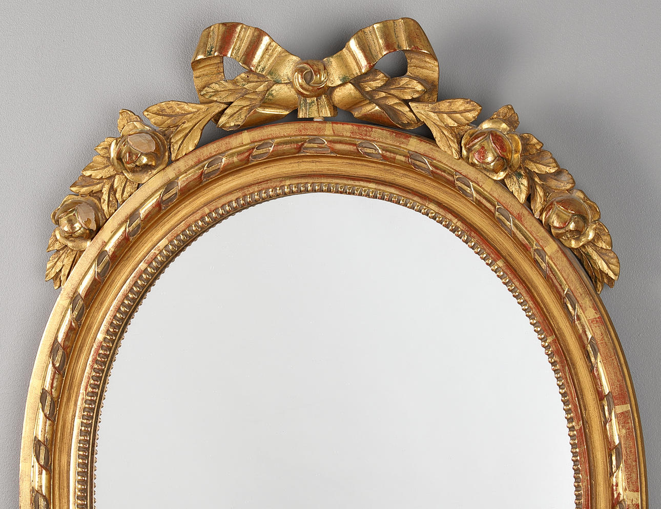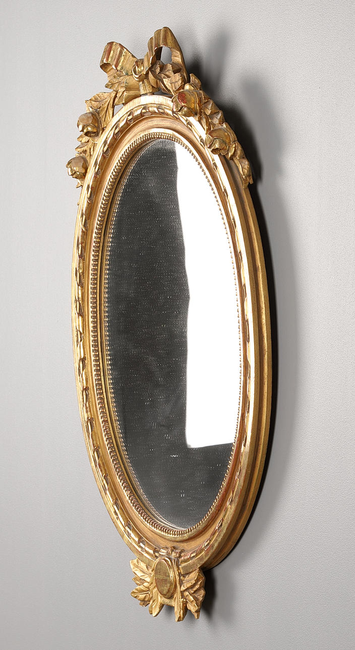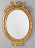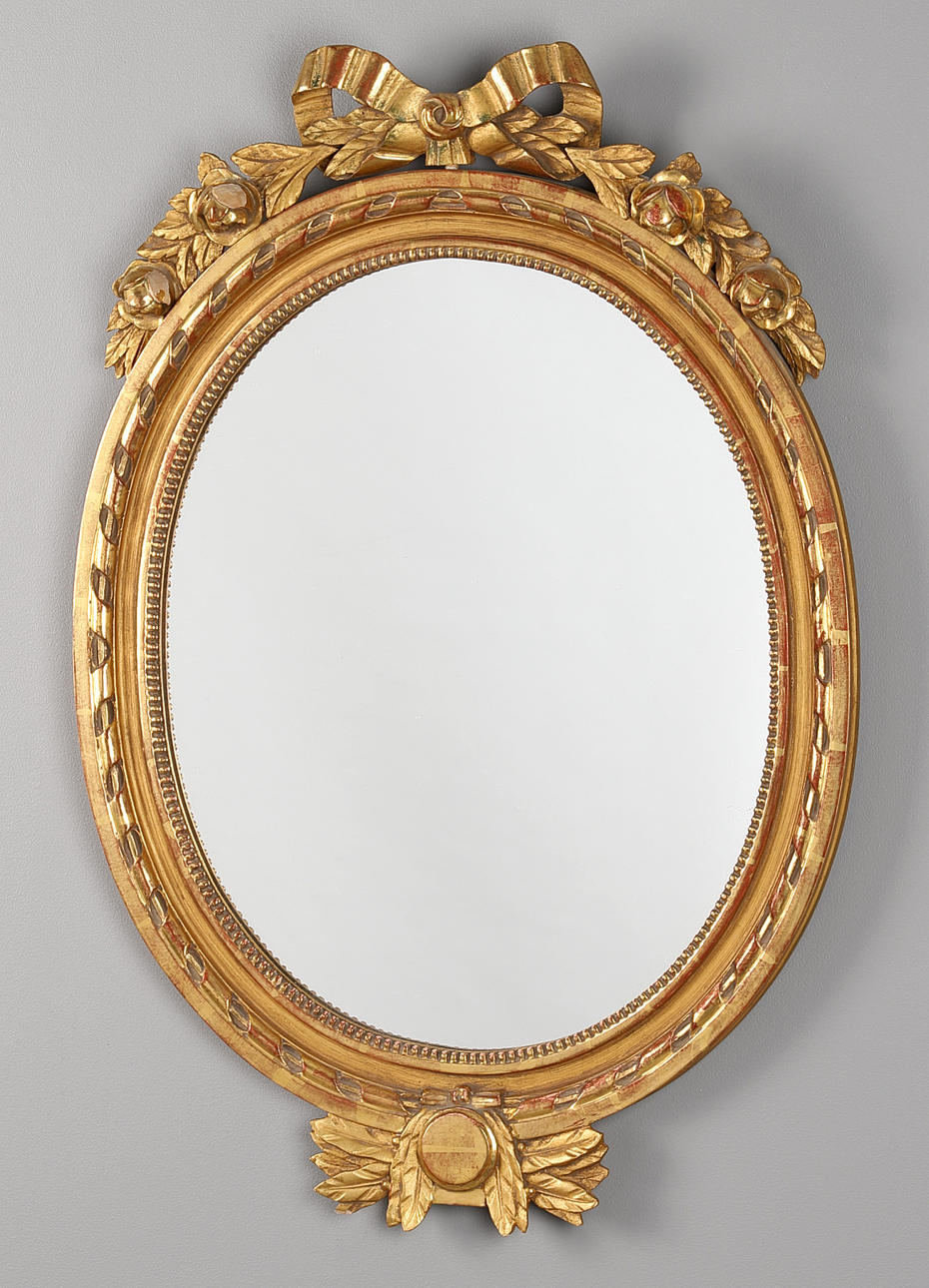 Löpande pärlbård krönt med rosett. Total höjd 80 cm, bredd 55.5 cm. Spegels mått 53.5x43.5 cm.
