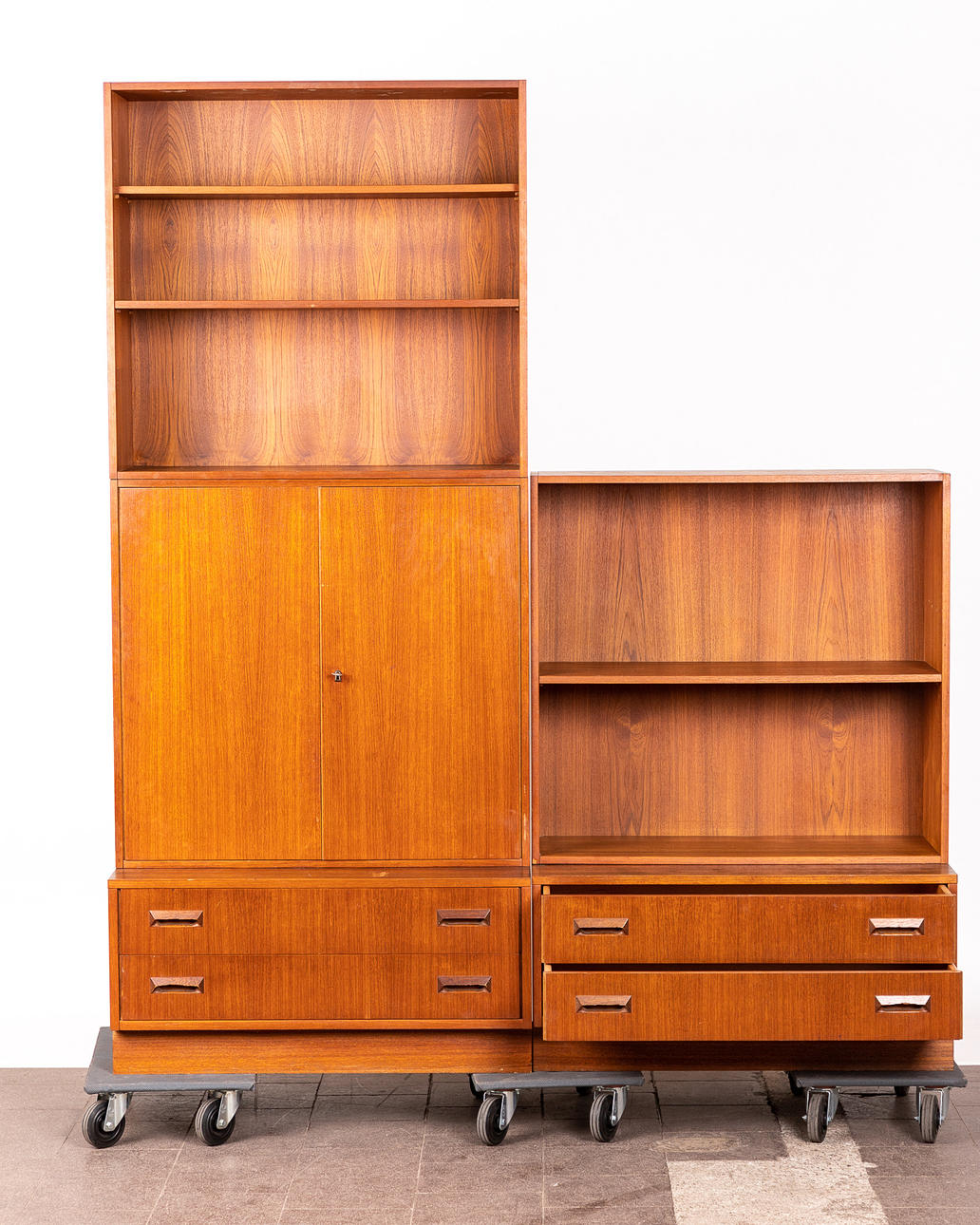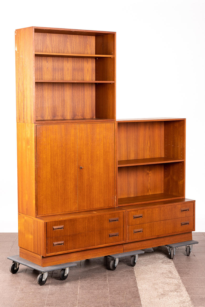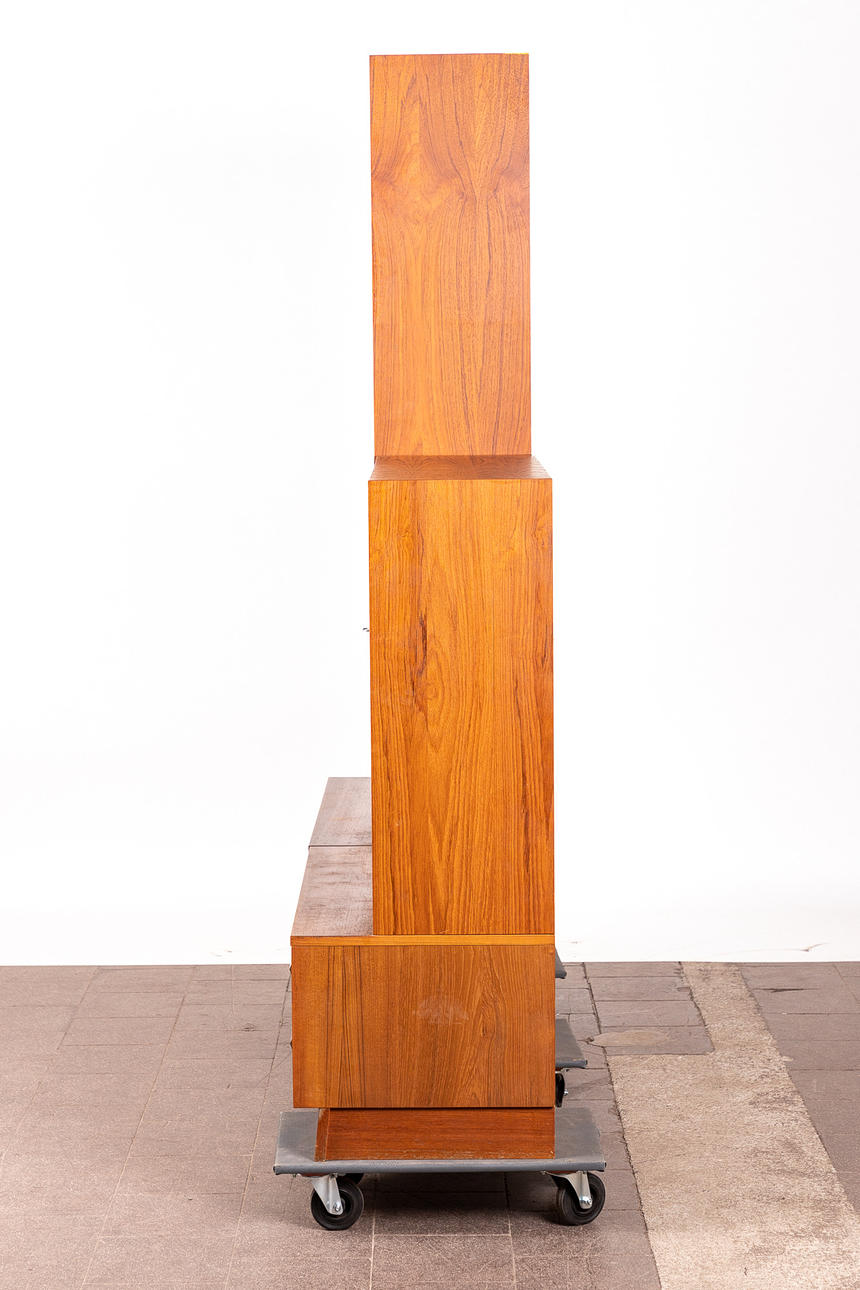 Väggenhet, teak, 1960-tal, Danmark. Tvådelad teakvägg bestående av två lådor med hyllor, två lådor med lådor och en låda med låsbar dubbeldörr, H.207cm, L.176.5cm, W.48cm. (2).