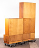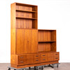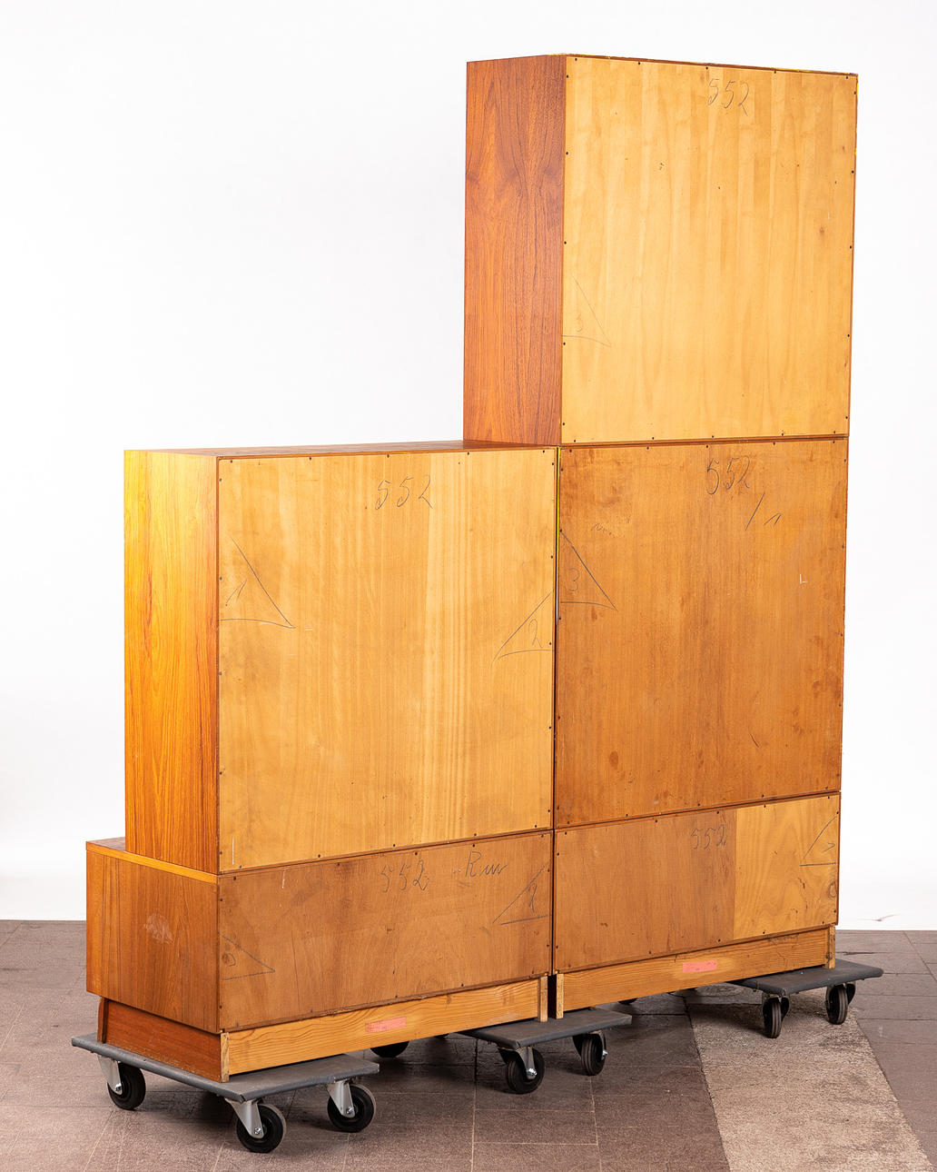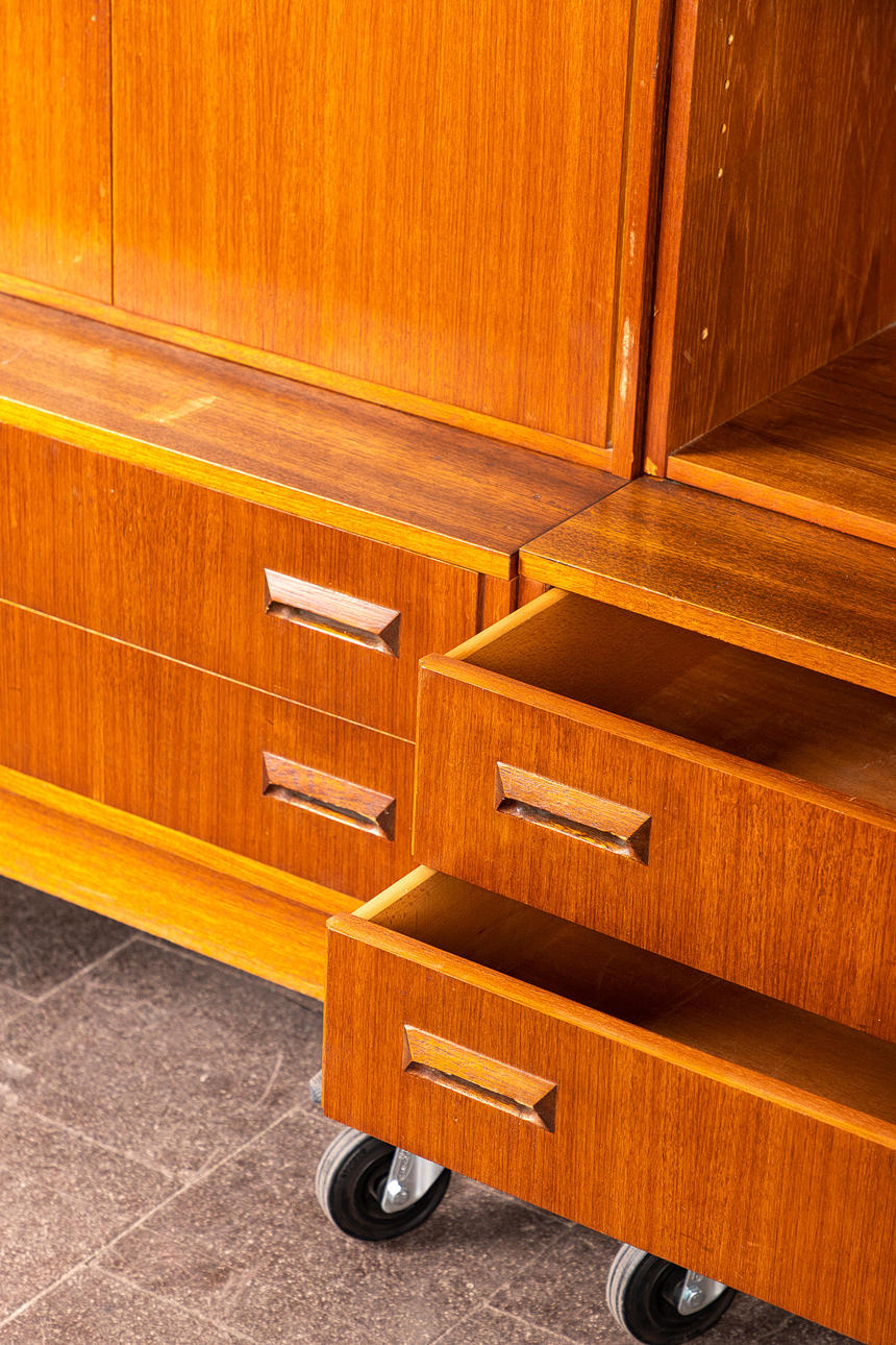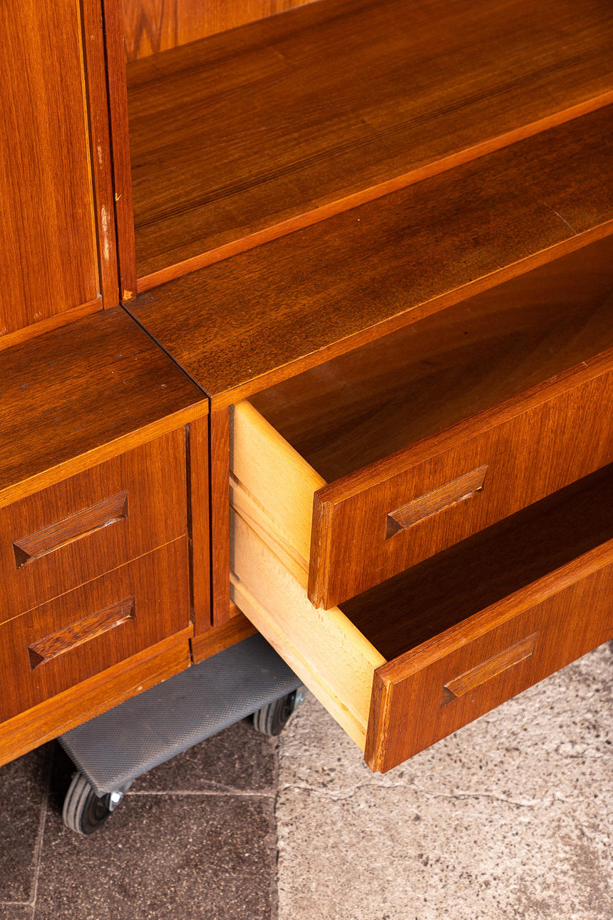 Väggenhet, teak, 1960-tal, Danmark. Tvådelad teakvägg bestående av två lådor med hyllor, två lådor med lådor och en låda med låsbar dubbeldörr, H.207cm, L.176.5cm, W.48cm. (2).