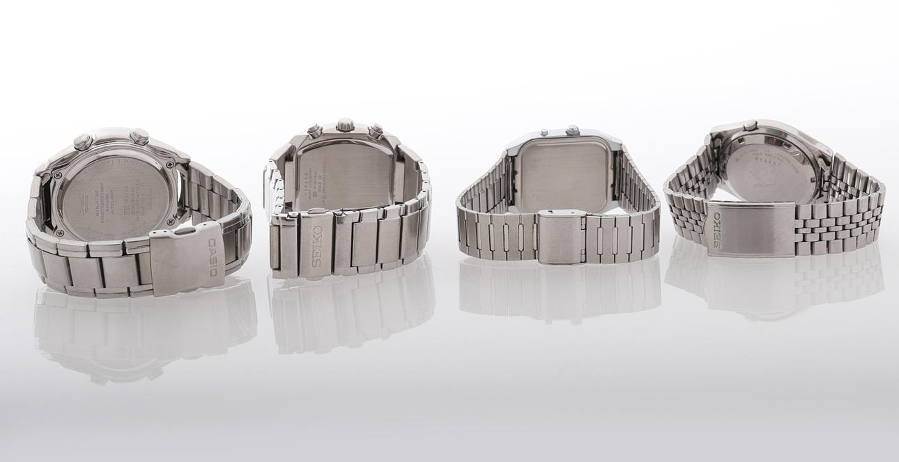 Armbandsur, 4 delar, bestående av Casio 2 delar, Seiko samt Gemin, automatiskt urverk Seiko 5, resterande ur quartzverk, stål, mineralglas, halvstela länkar i stål, diam ca 32-43 mm, extra länkled till Seiko Kronograf medföljer.