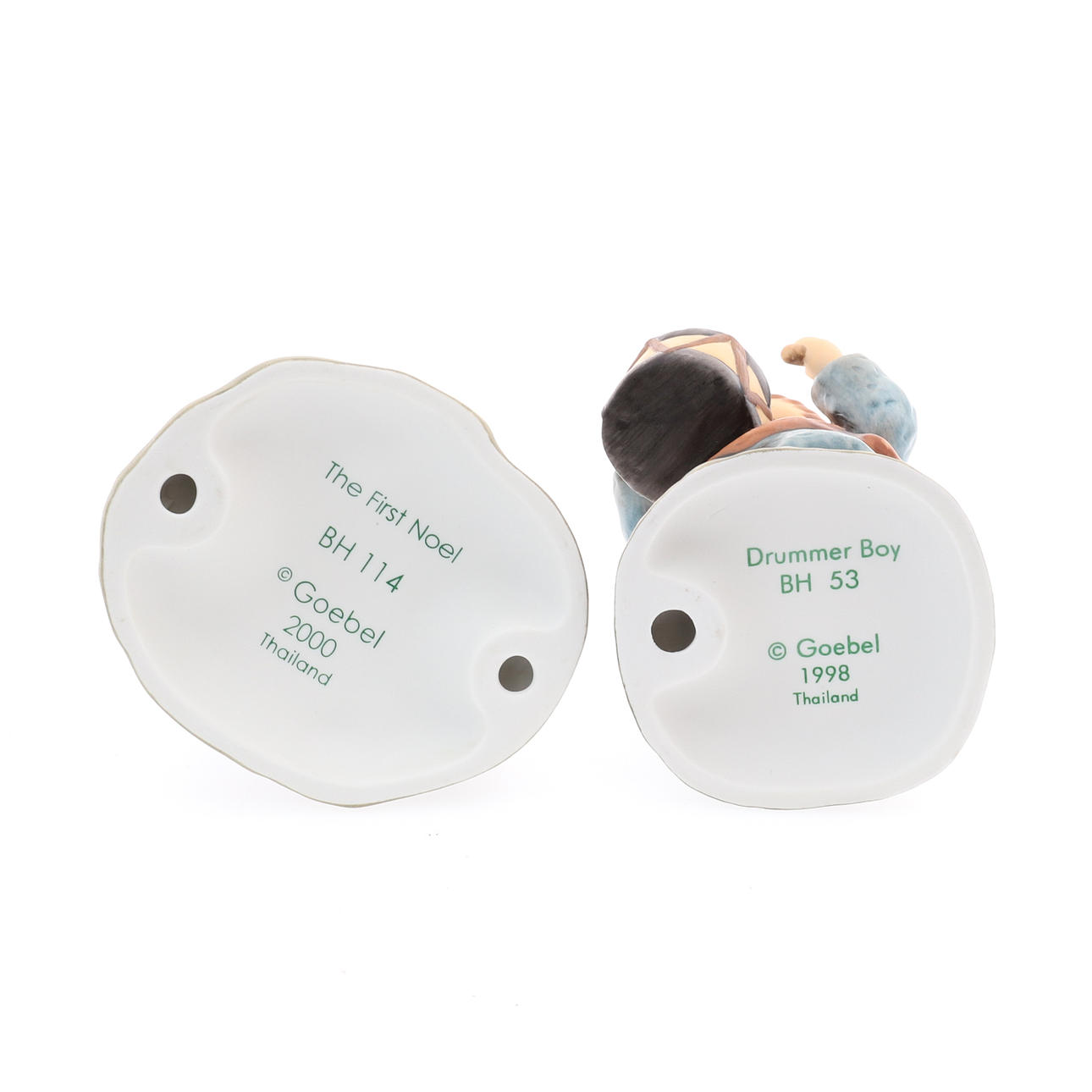 Studio Hummel, nummer A 4899, en pojke som slår en trumma, 14 cm hög x 6 cm bred, tillsammans med ett annat 'The First Noel' nummer A196A, en pojke som håller en flaska med lamm på sin sida, 12 cm hög x 8 cm bred, båda med originallådor (2).