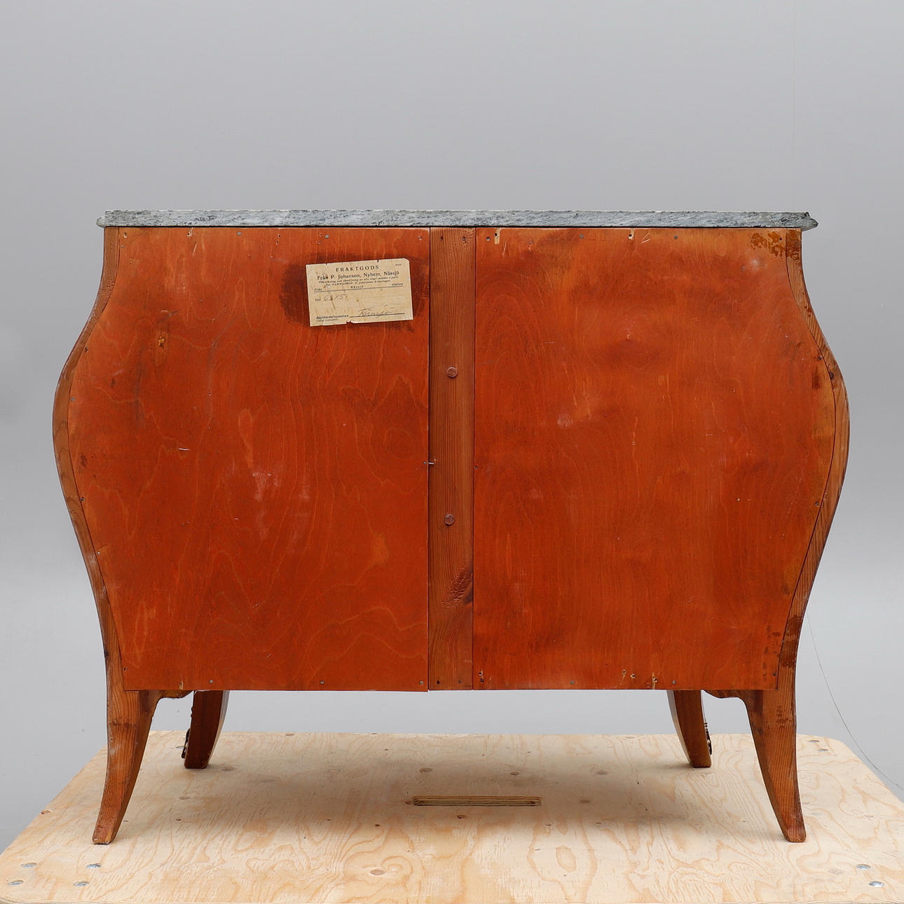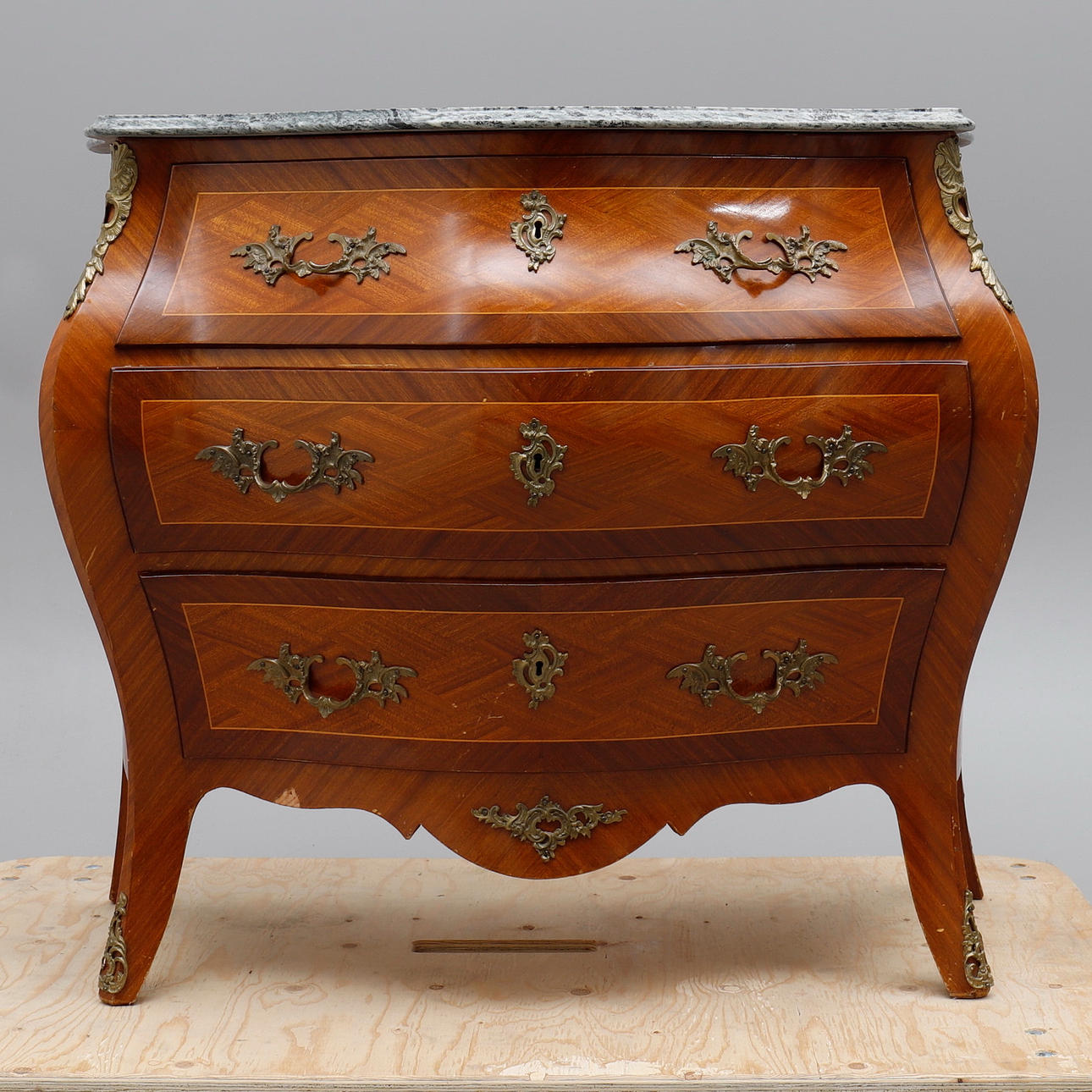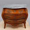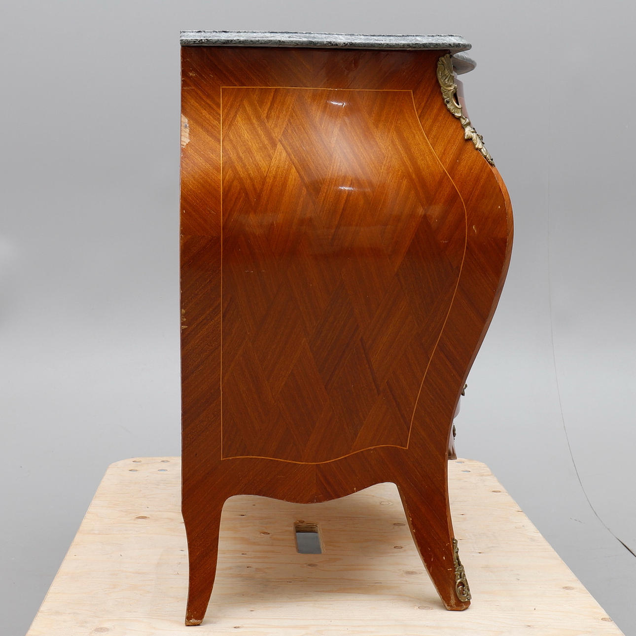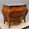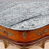 Fanérad med mahogny, dekorbeslag av mässing, skiva av grönspräcklig kalksten, höjd 80 cm, 99x47,5 cm.