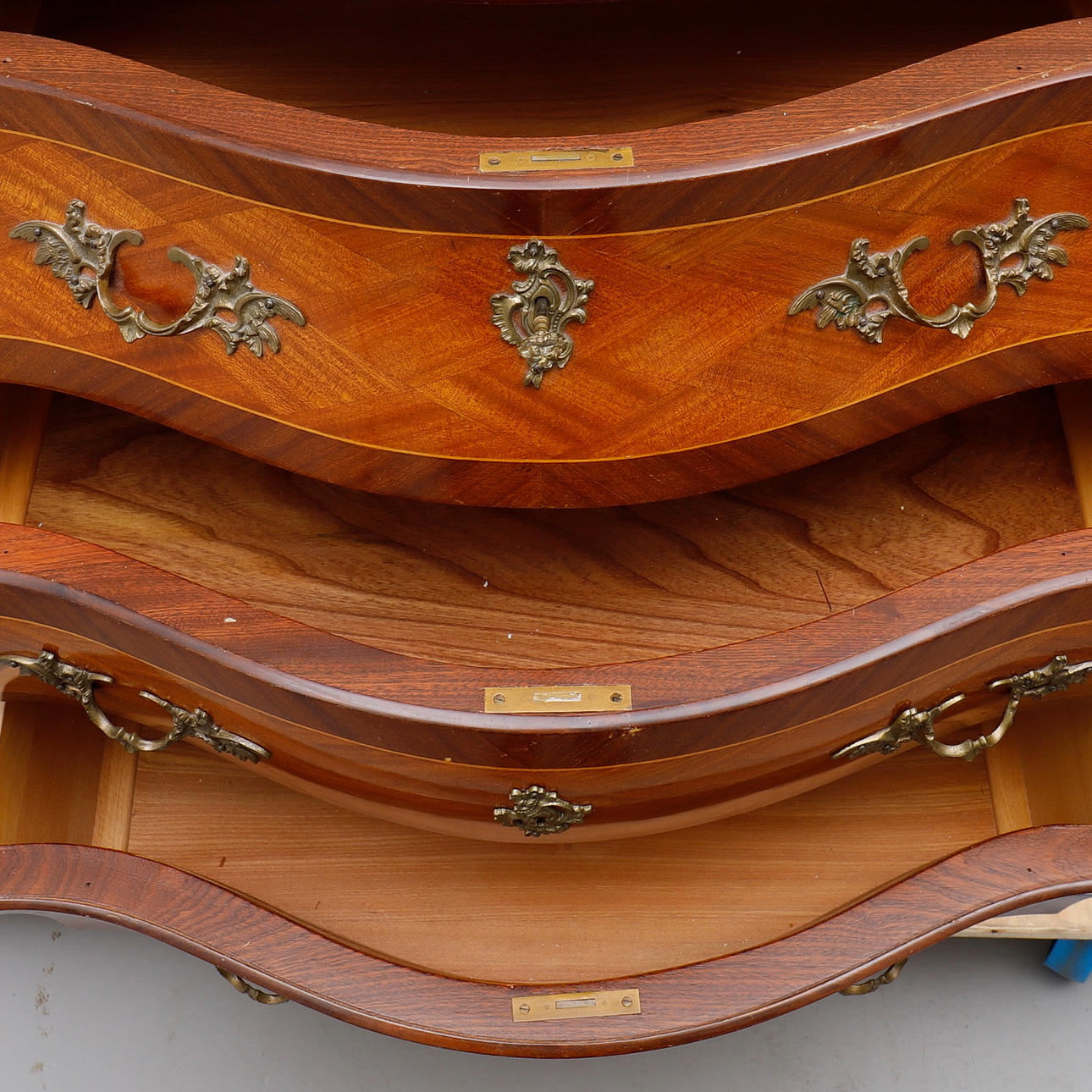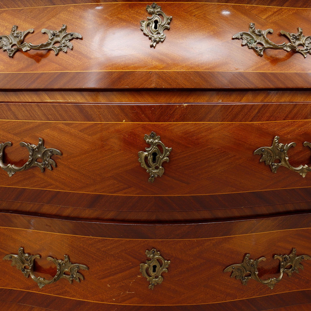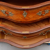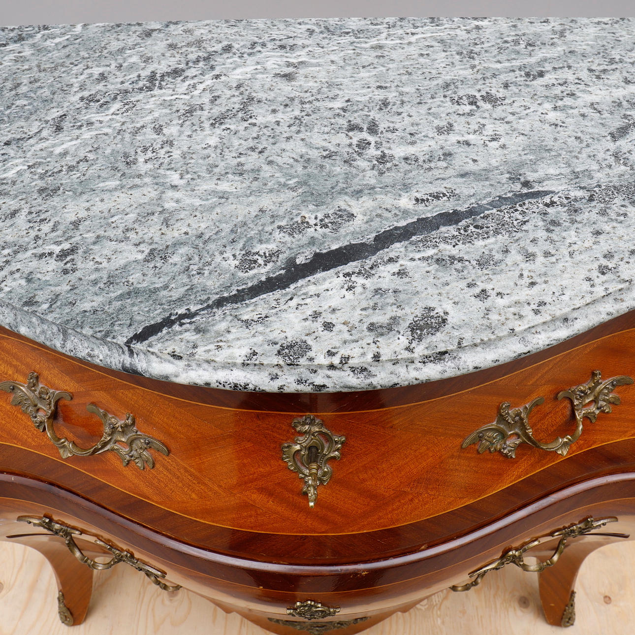 Fanérad med mahogny, dekorbeslag av mässing, skiva av grönspräcklig kalksten, höjd 80 cm, 99x47,5 cm.
