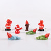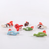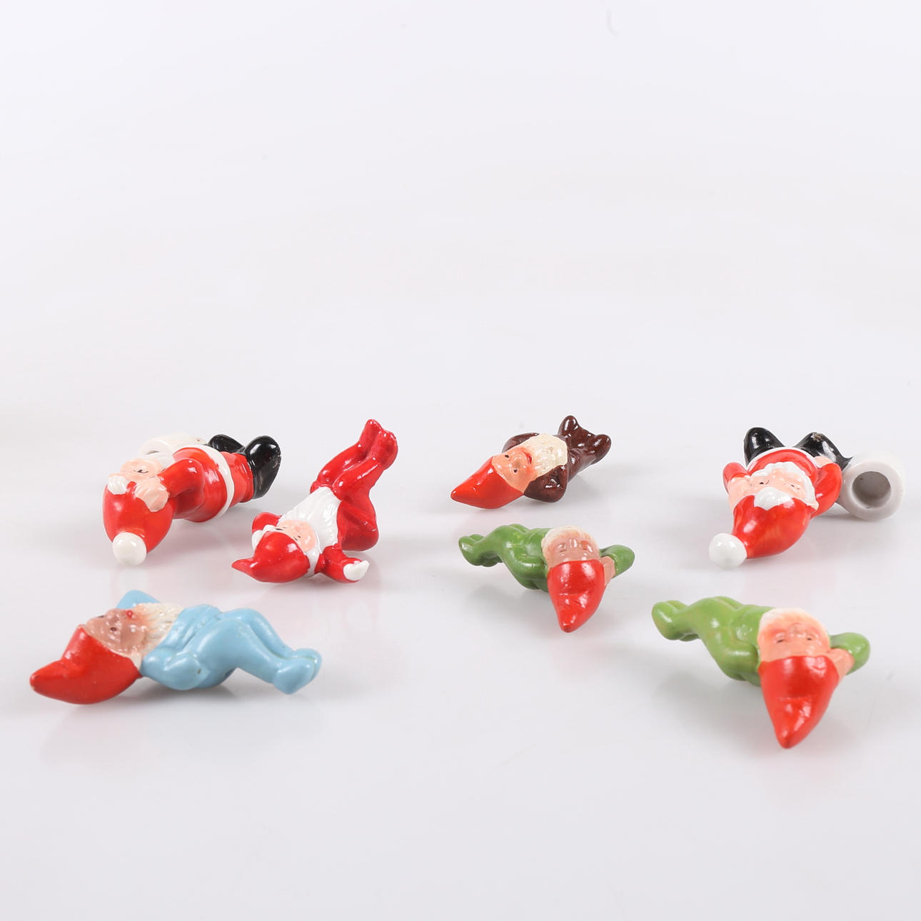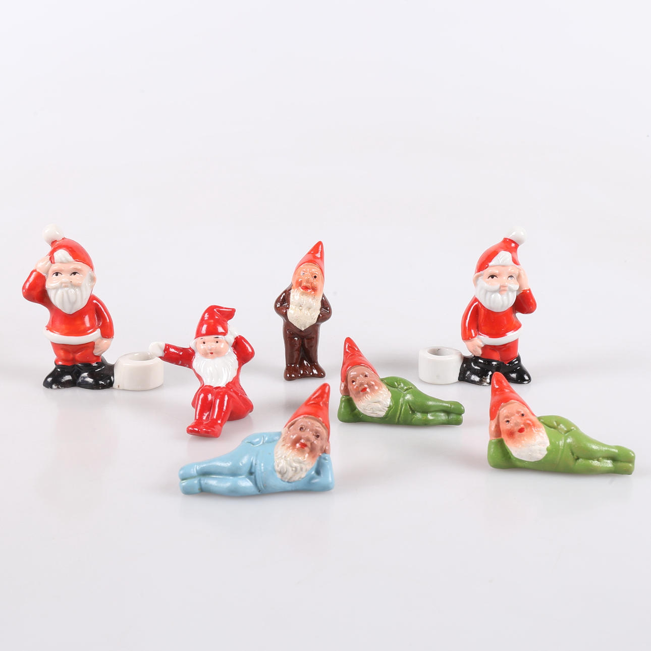 Ett par ljusstakar och sittande tomte i porslin. Tre liggande tomar och en stående i bruna kläder, bemålad terrakotta., höjd ca 3,5-7,5 cm.