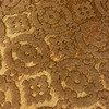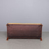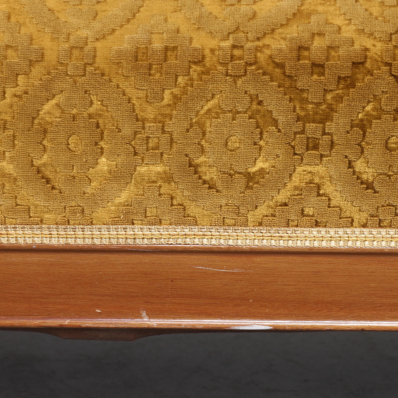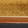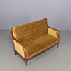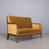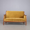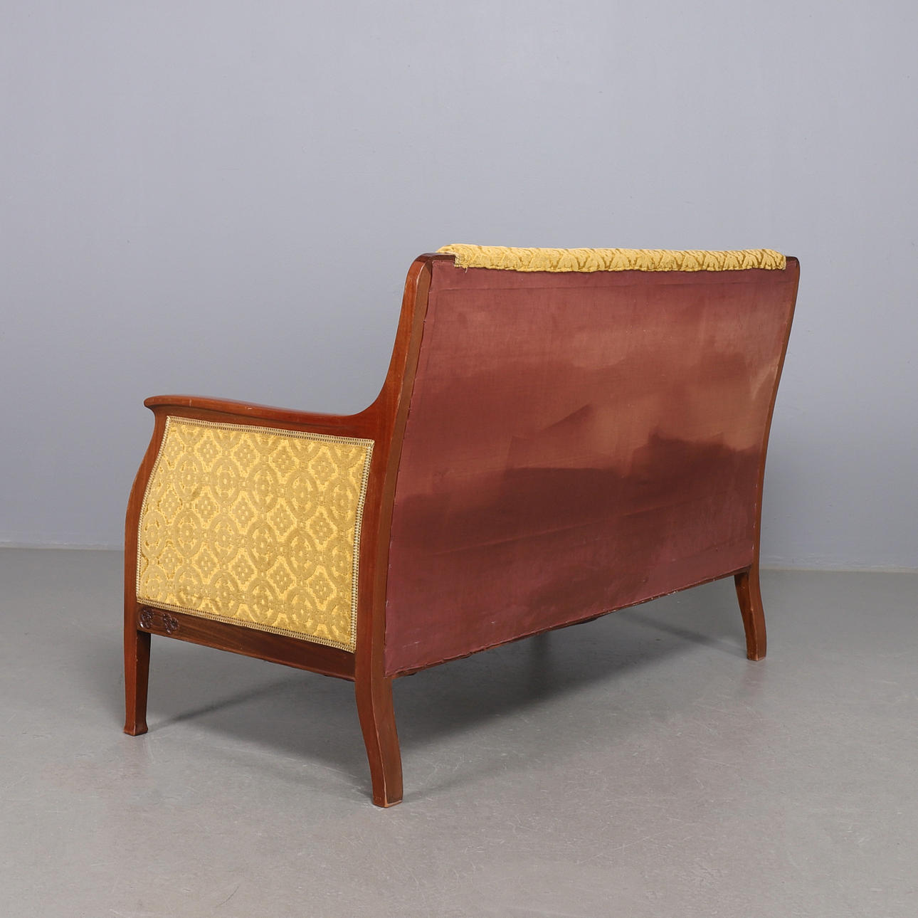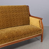 Soffa med stomme i mahogny, klädd i mönstrad gul möbelplysch. Träsnidade ornament. Mått: längd 155, djup 75, höjd 102 cm.