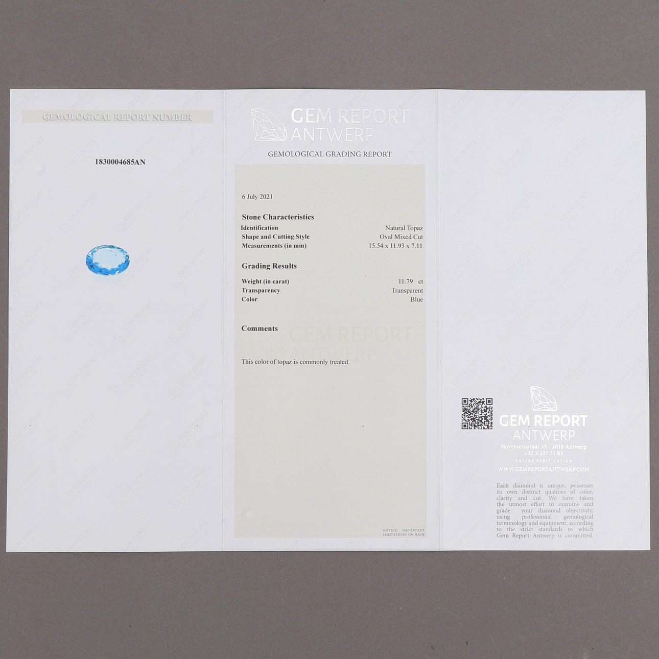 Certifikat från Gem Report Antwerp, Gemological Grading Report, nr 1830004685 Oval blandslipad.