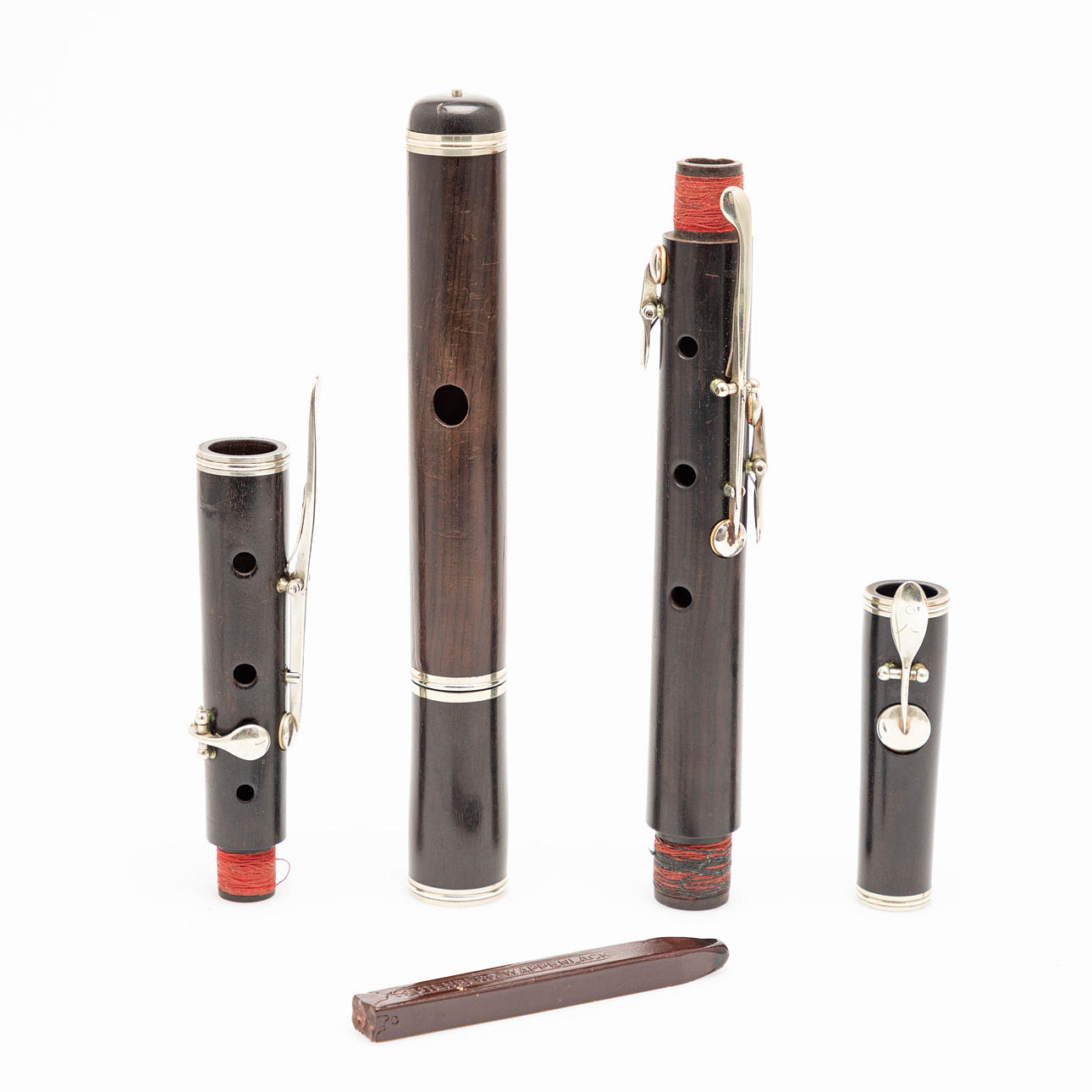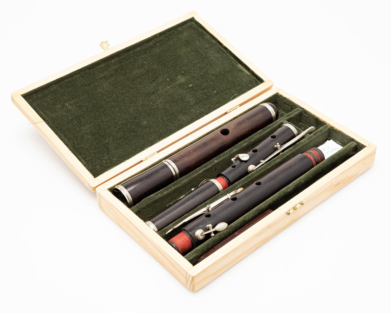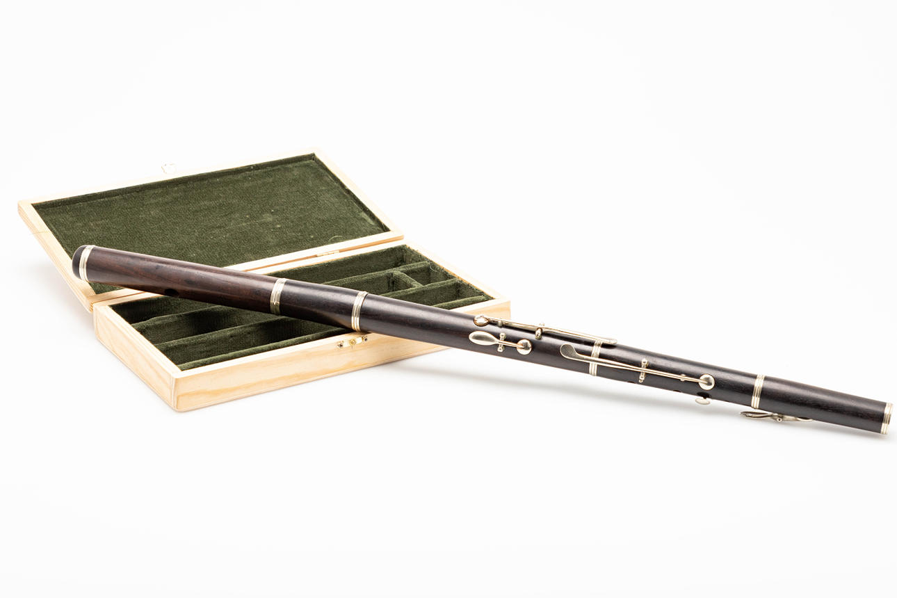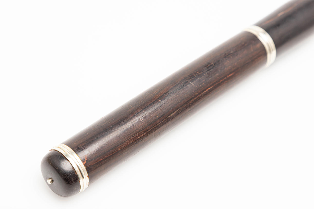 flöjt, trä, försilvrad. Flöjt med en kropp gjord av mörkbetsat trä och silverpläterade nycklar, monterade i fem delar, fäst med trälåda, L.61 cm, fodral: H.4cm, L.28cm, W.16cm.