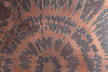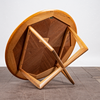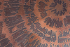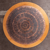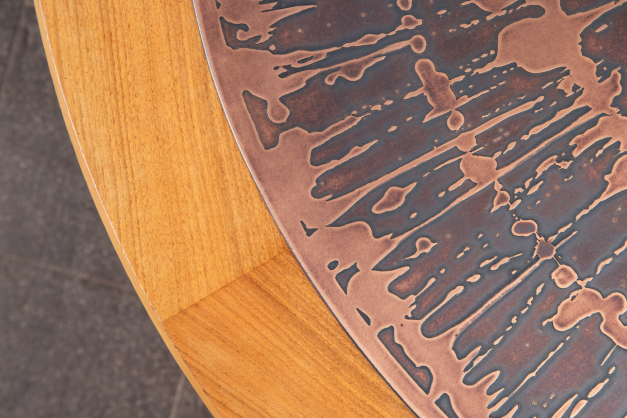 Soffbord i trä med korsade ben och en rund bordsskiva med etsad kopparyta, H.54cm, D.110cm.