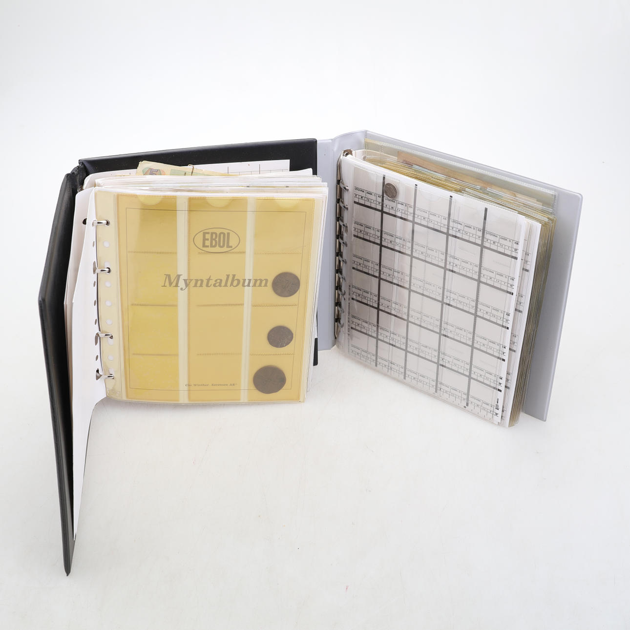 Två myntalbum med svenska samt utländska äldre och nyare mynt samt några sedlar.