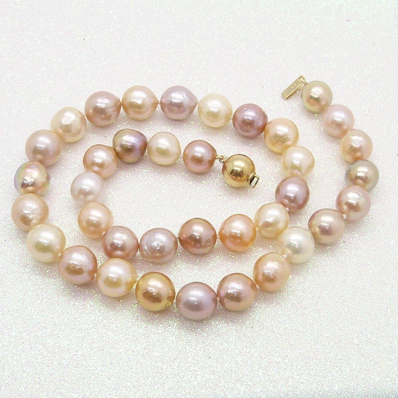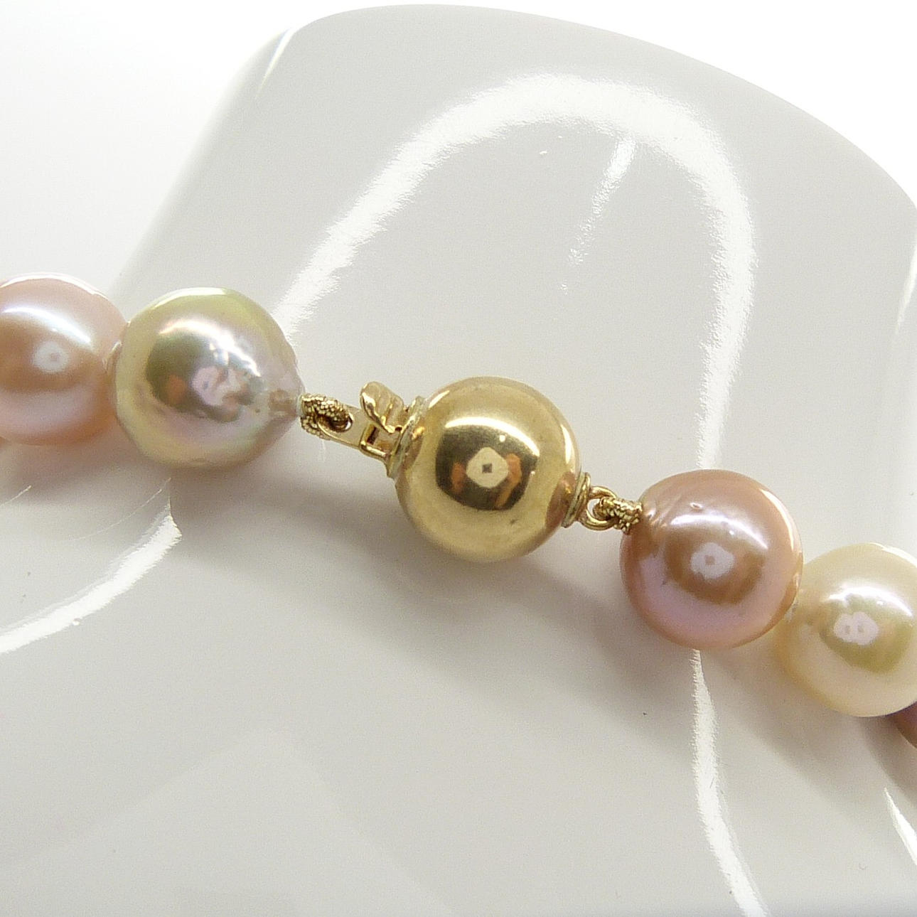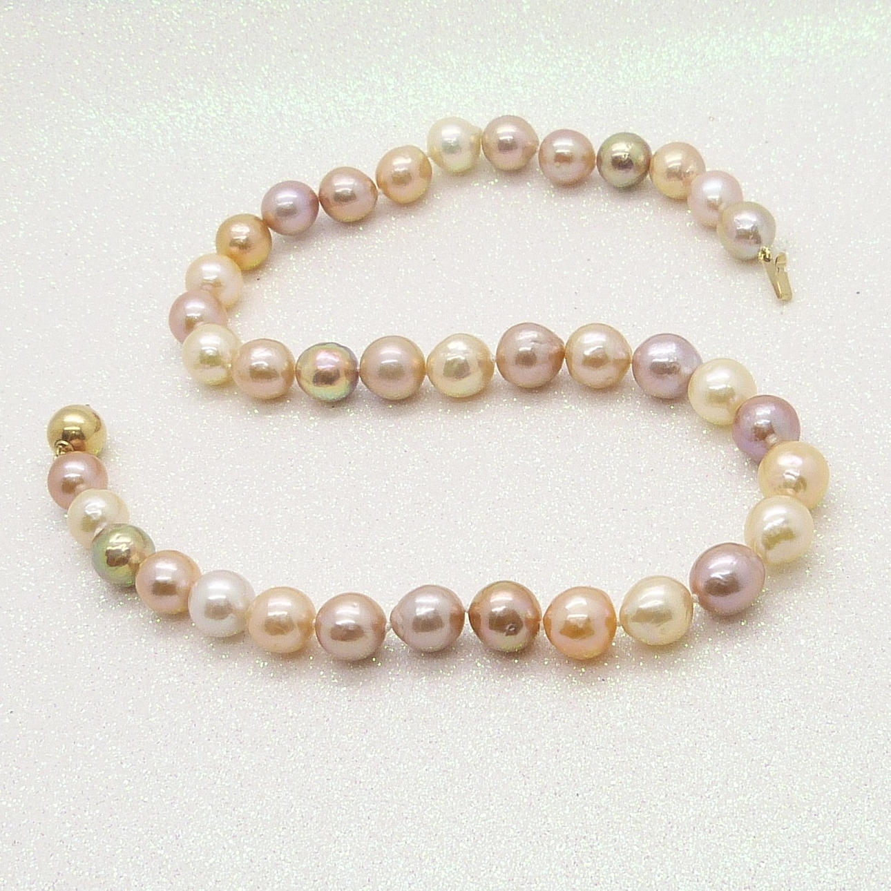 En enda sträng halsband bildat av rosa, champagne, guld, vit lila och grå-tonade sötvatten odlade pärlor, med en 9k gult guld boll lås.