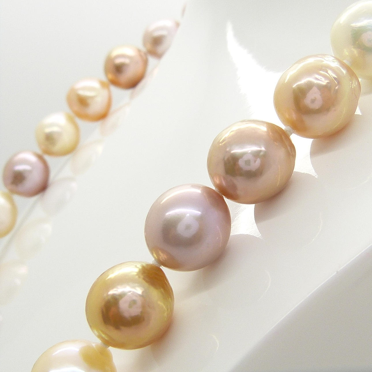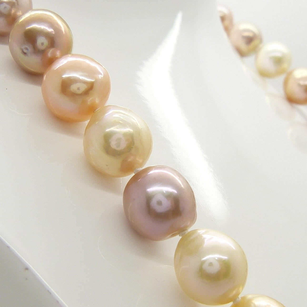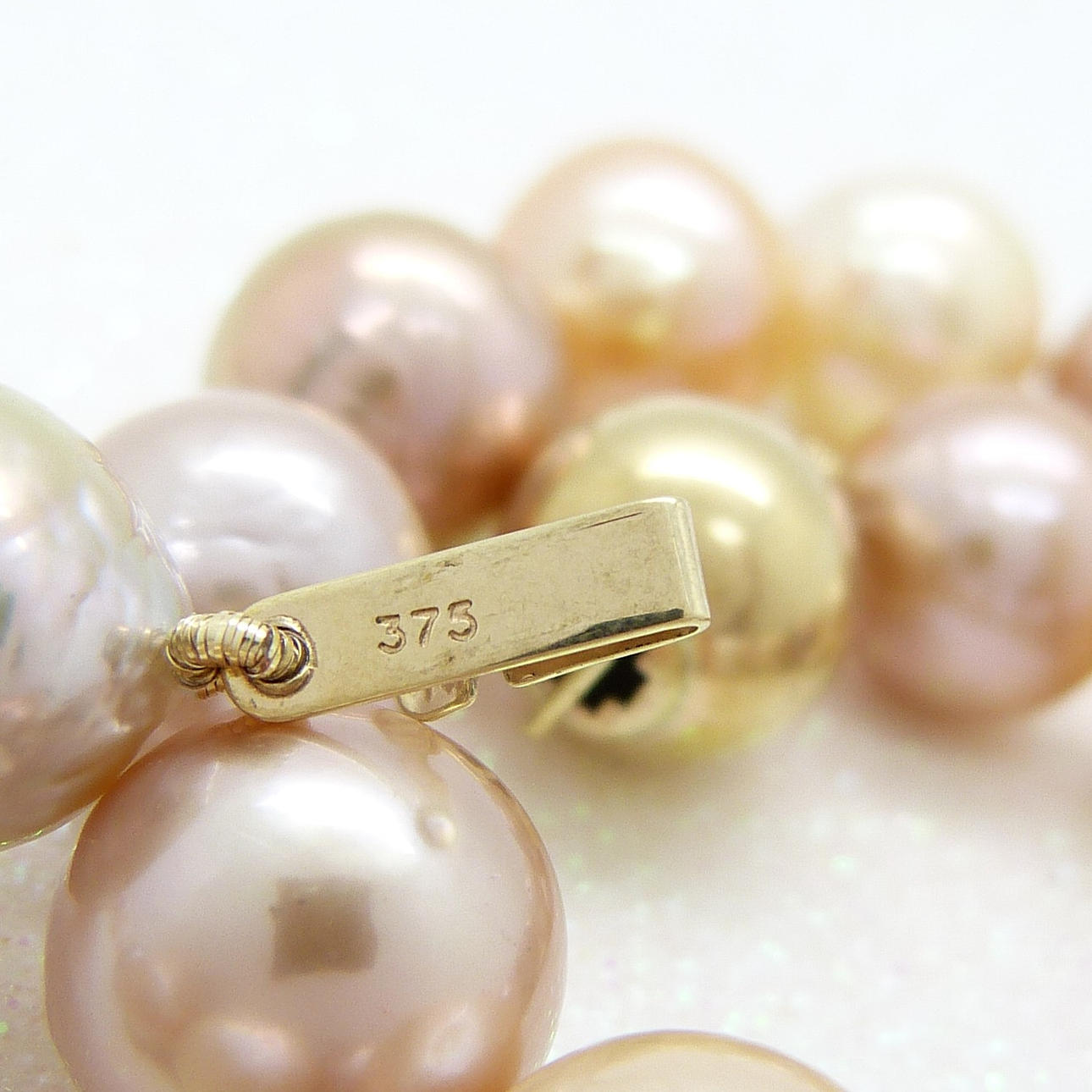 En enda sträng halsband bildat av rosa, champagne, guld, vit lila och grå-tonade sötvatten odlade pärlor, med en 9k gult guld boll lås.