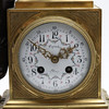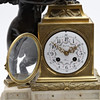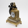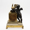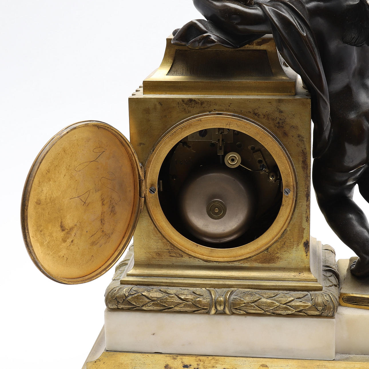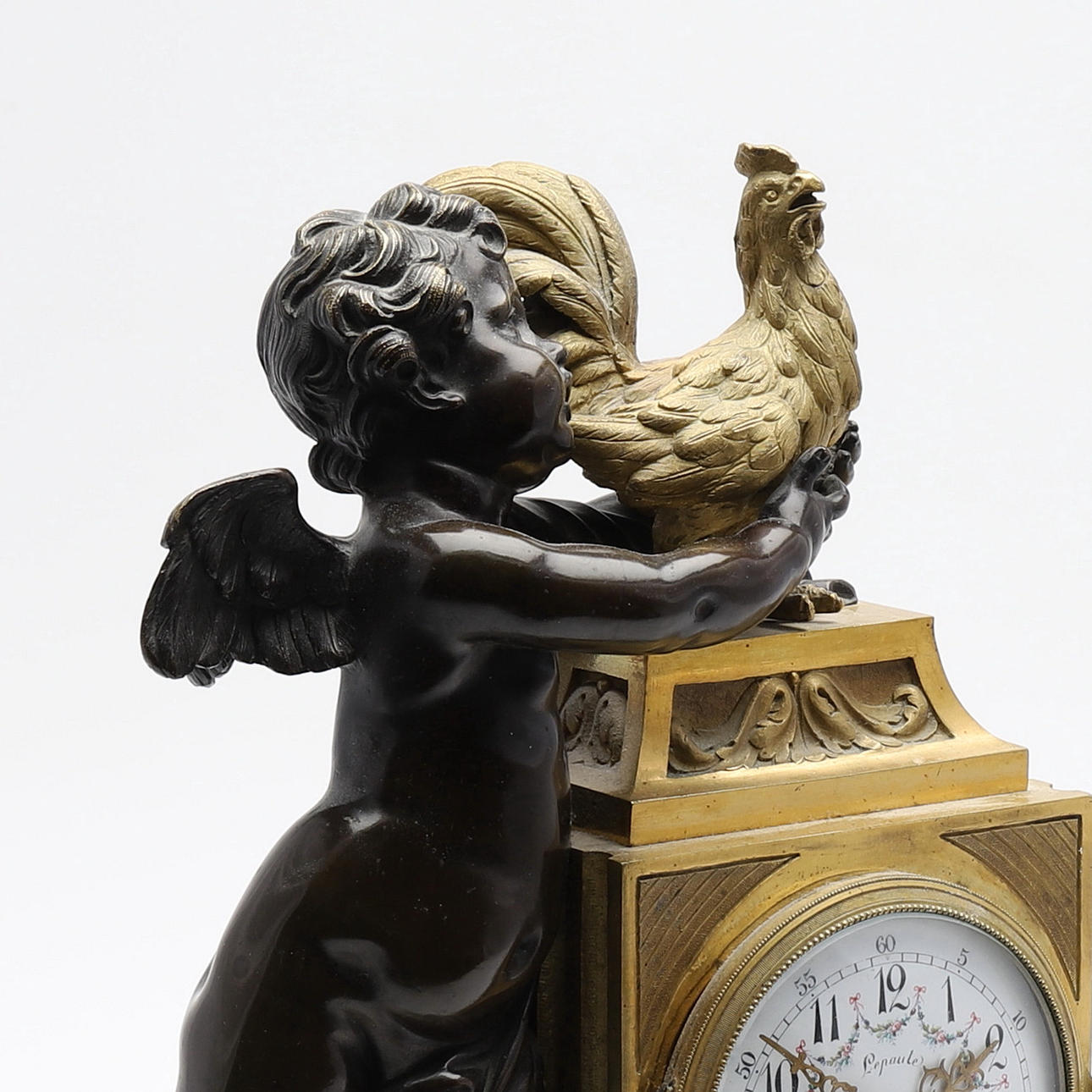 Delvis mörkpatinerad brons och marmor. Krönande putto med höna. Höjd 39 cm. Vitemaljerad urtavla med målad dekor av rosor.
