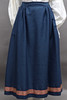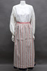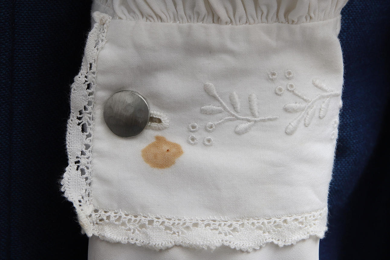 Fläck på ärmslut på blus, liten fläck på förkläde. Graverad monogram och år på väskspänne. Fläck på krage med spets, I övrigt fint bruksskick.