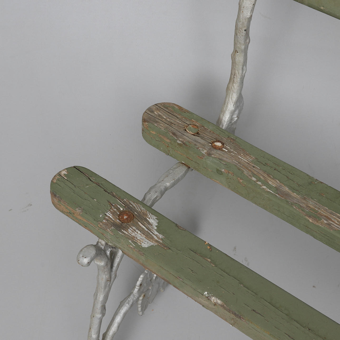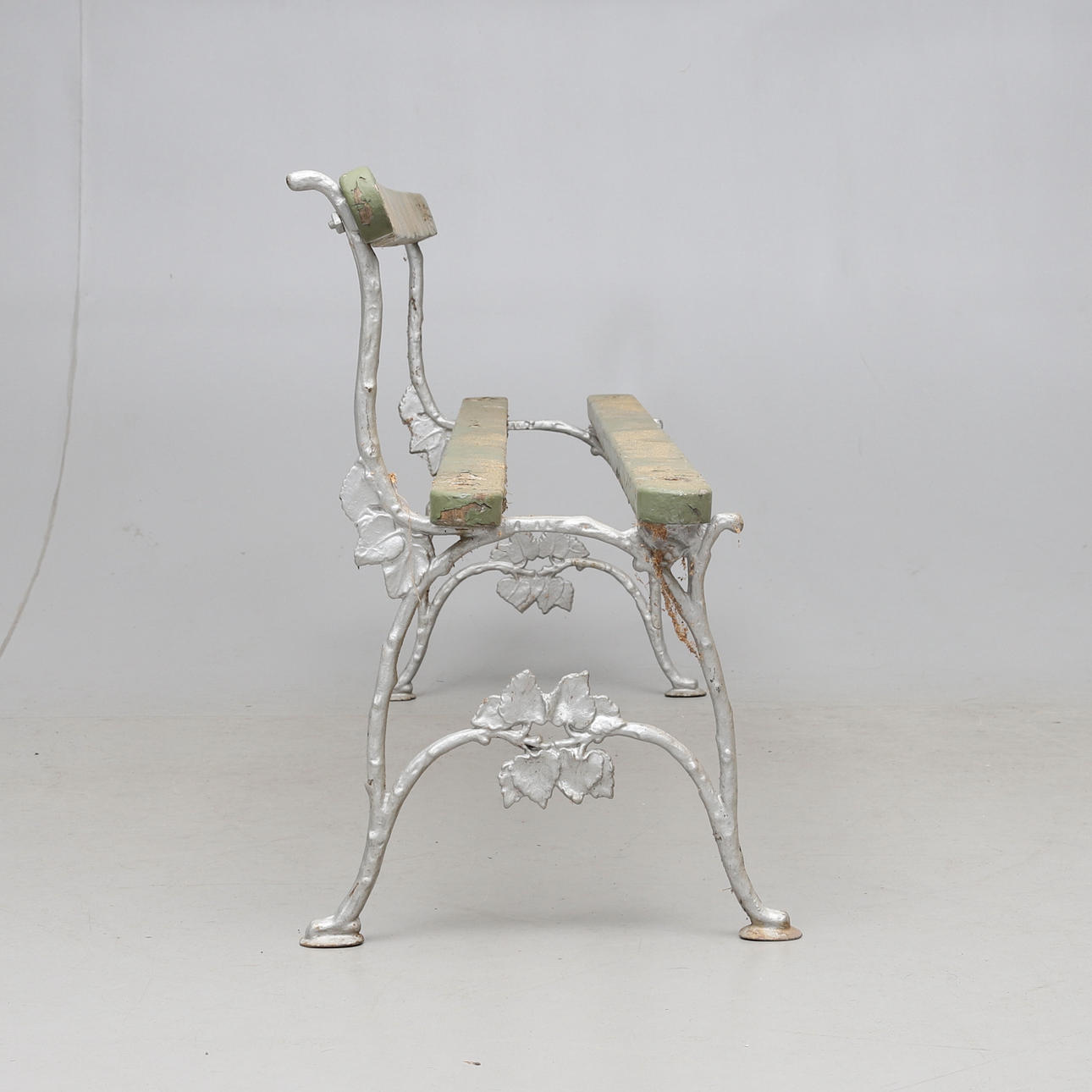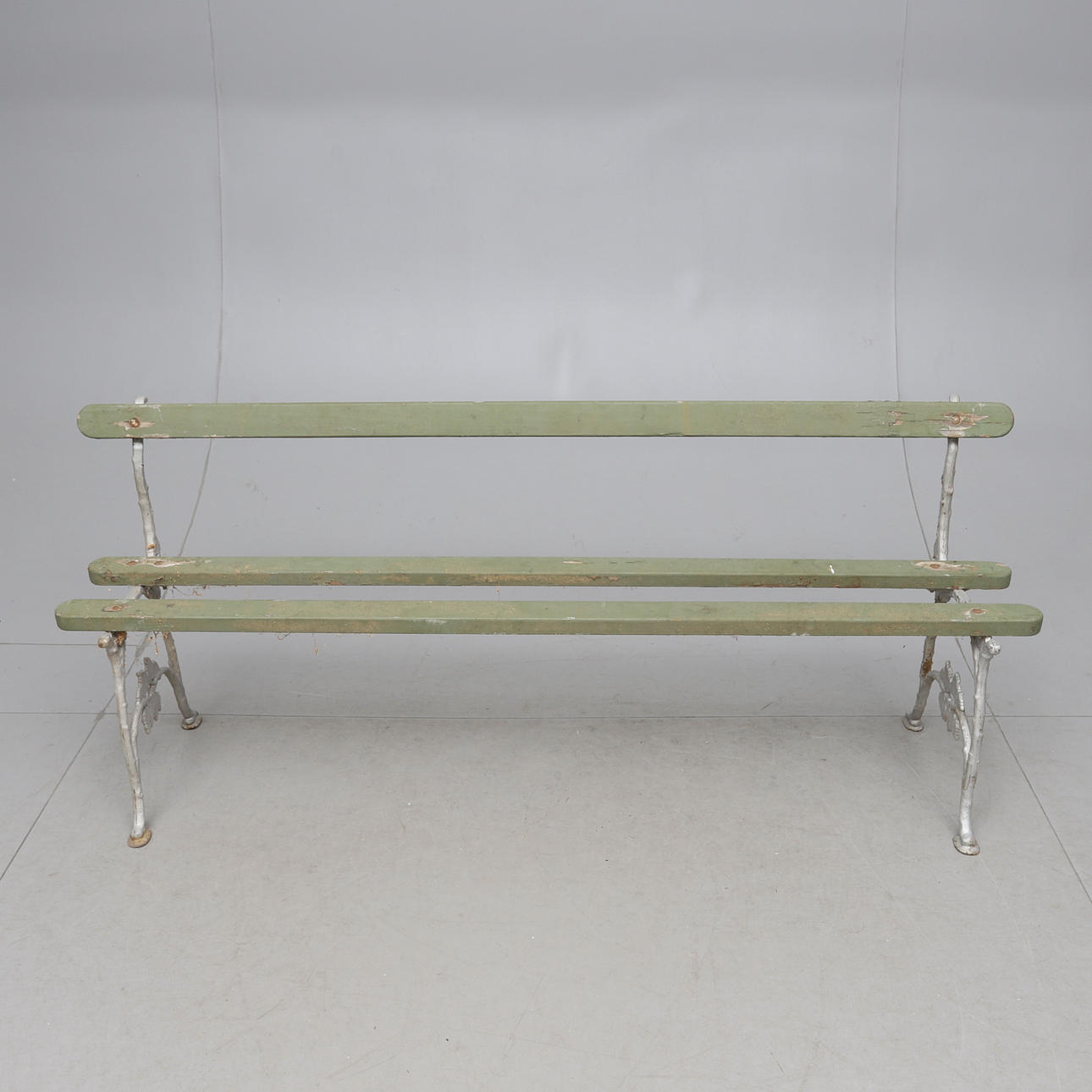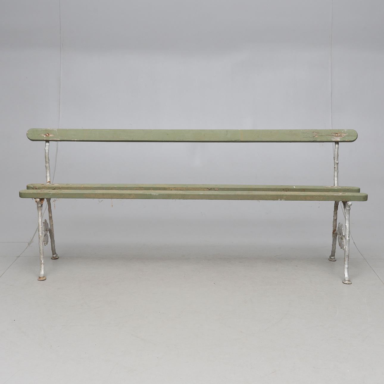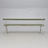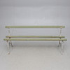 Målade. Rygg och sits av träribbor. Längd ca 184 cm.