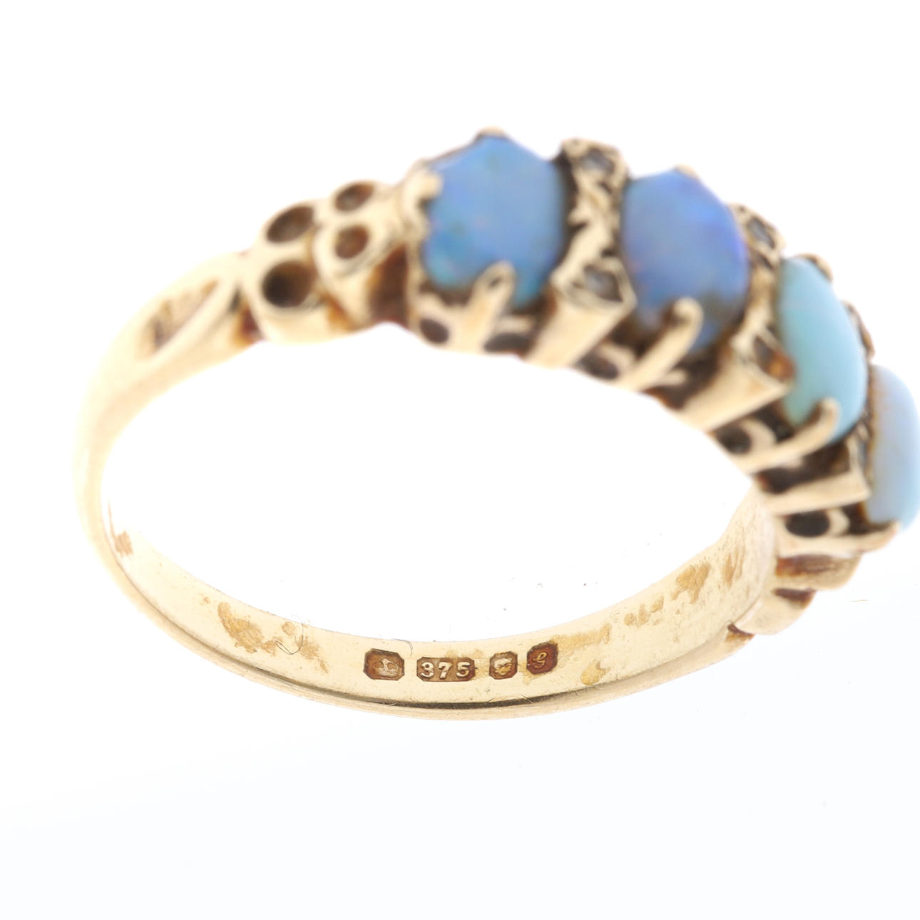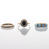 allt i 9 karat guld inställningar, en uppsättning med fyra ovala blå opaler, mellanrum med sex diamant punkter, ett kluster ring set med mörka safirer och utsäde pärlor, och en klar sten set full evighet ring (3).