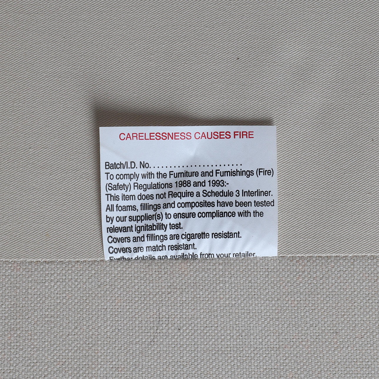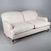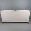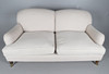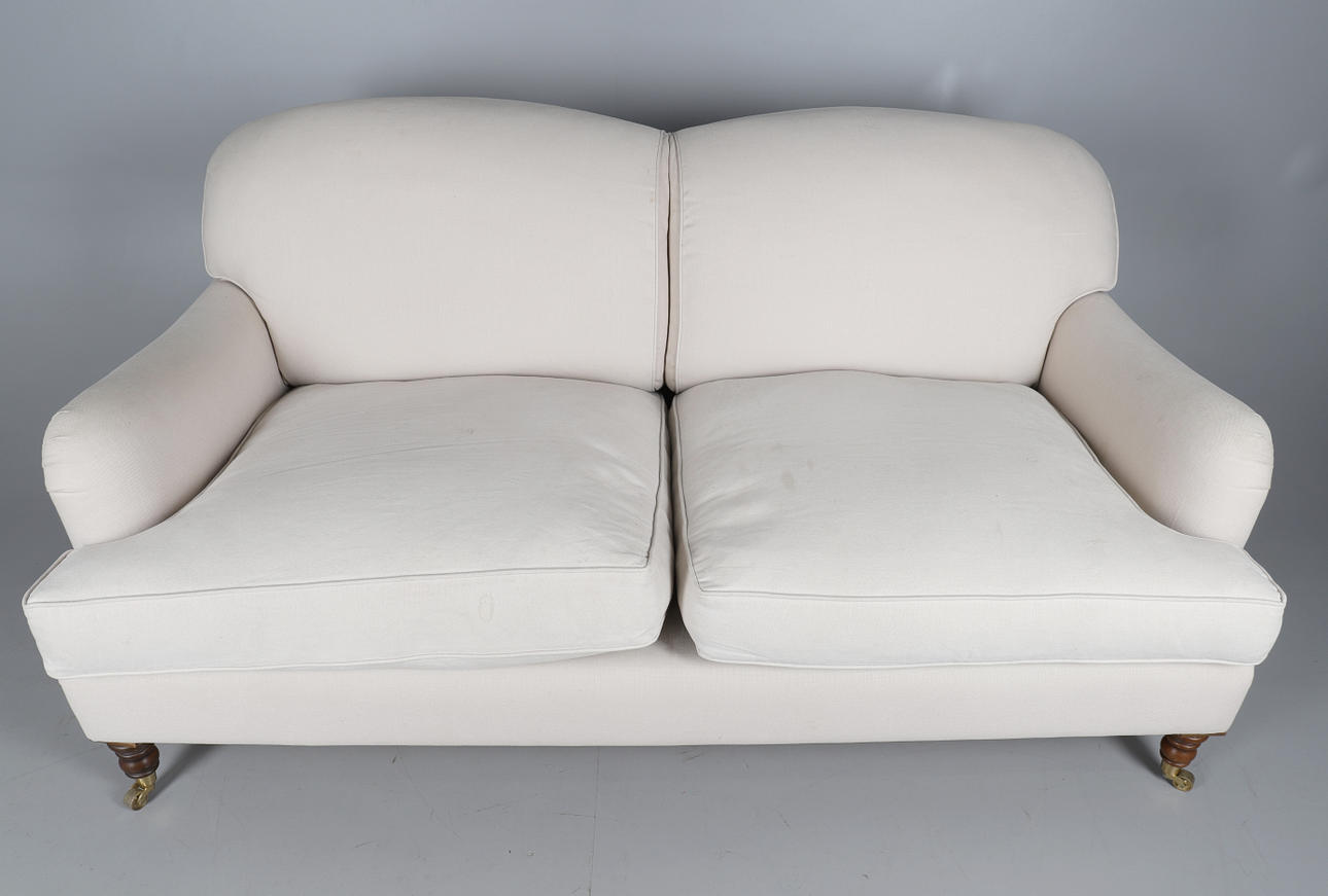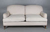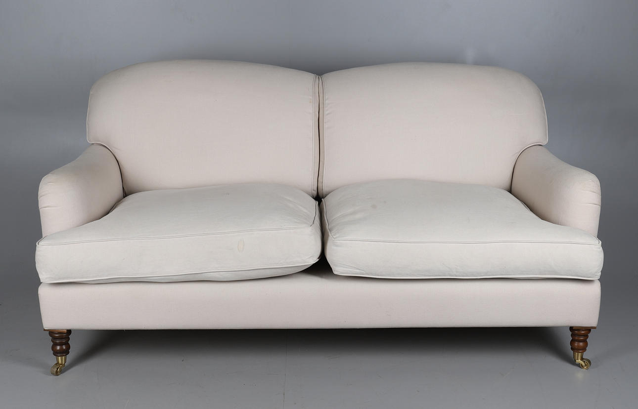 Klädd i krämtyg, upphöjd på framben och hjul i mässing.